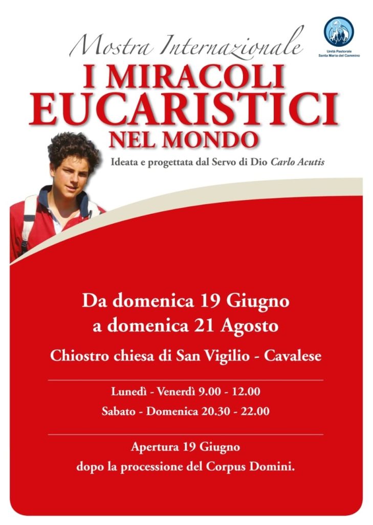 Anche in Val di Fiemme sarà possibile visitare la mostra ideata da Carlo Acutis, che sarà aperta proprio in occasione della Festa del Corpus Domini domenica 19 giugno e fino a domenica 21 agosto, nel chiostro della Chiesa di San Vigilio a Cavalese secondo i seguenti orari: lun-ven 9.00-12.00 e sab -dom 20.30-22.00.