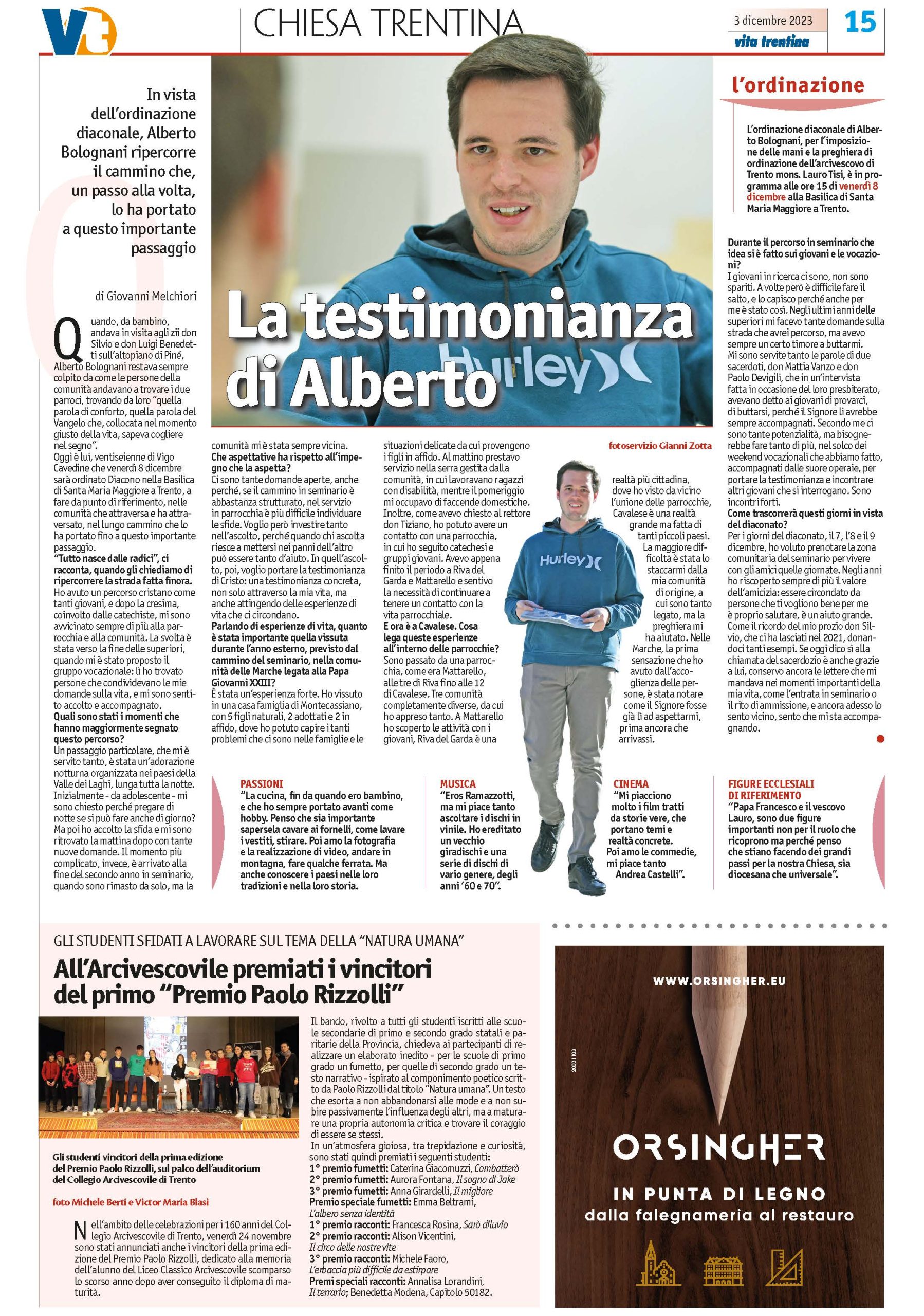 Momento chiave nella sua vocazione, coltivata nelle amicizie e nel dialogo con la comunità, la partecipazione a un gruppo vocazionale e un’adorazione notturna vissuta in valle dei Laghi con tante domande in cerca di risposte. Risposte che, di certo, considerata la tappa che lo attende, Alberto è riuscito almeno in parte a trovare. In una lunga intervista pubblicata sull’ultimo numero del settimanale Vita Trentina, Bolognani – passione per la cucina e per la musica di Ramazzotti – si dice orientato ad “investire tanto nell’ascolto, perché quando chi ascolta riesce a mettersi nei panni dell’altro può essere tanto d’aiuto. In quell’ascolto, poi, voglio portare la testimonianza di Cristo: una testimonianza concreta, non solo attraverso la mia vita, ma anche attingendo delle esperienze di vita che ci circondano”.