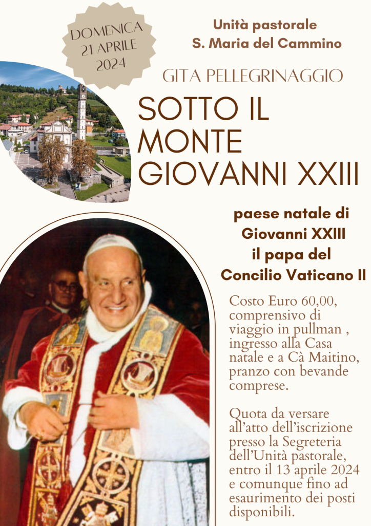 In continuità e come proposto durante la visita a Canale d’Agordo dello scorso anno, l’unità Pastorale “S. Maria del cammino” propone una gita-pellegrinaggio di un giorno a Città di Sotto il Monte Giovanni XXIII.