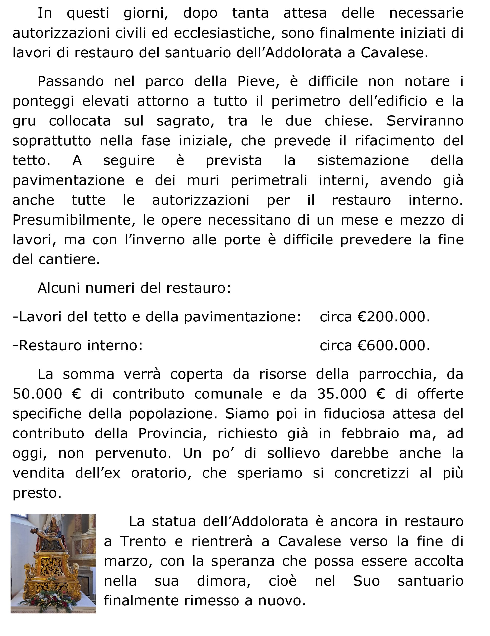 Per quanto riguarda la statua dell’Addolorata siamo in dirittura d’arrivo con il restauro effettuato dallo Studio Gentili di Lavis e la previsione è che entro la fine di aprile possa tornare in valle. Si deciderà dove posizionarla in base allo stato di avanzamento del cantiere.