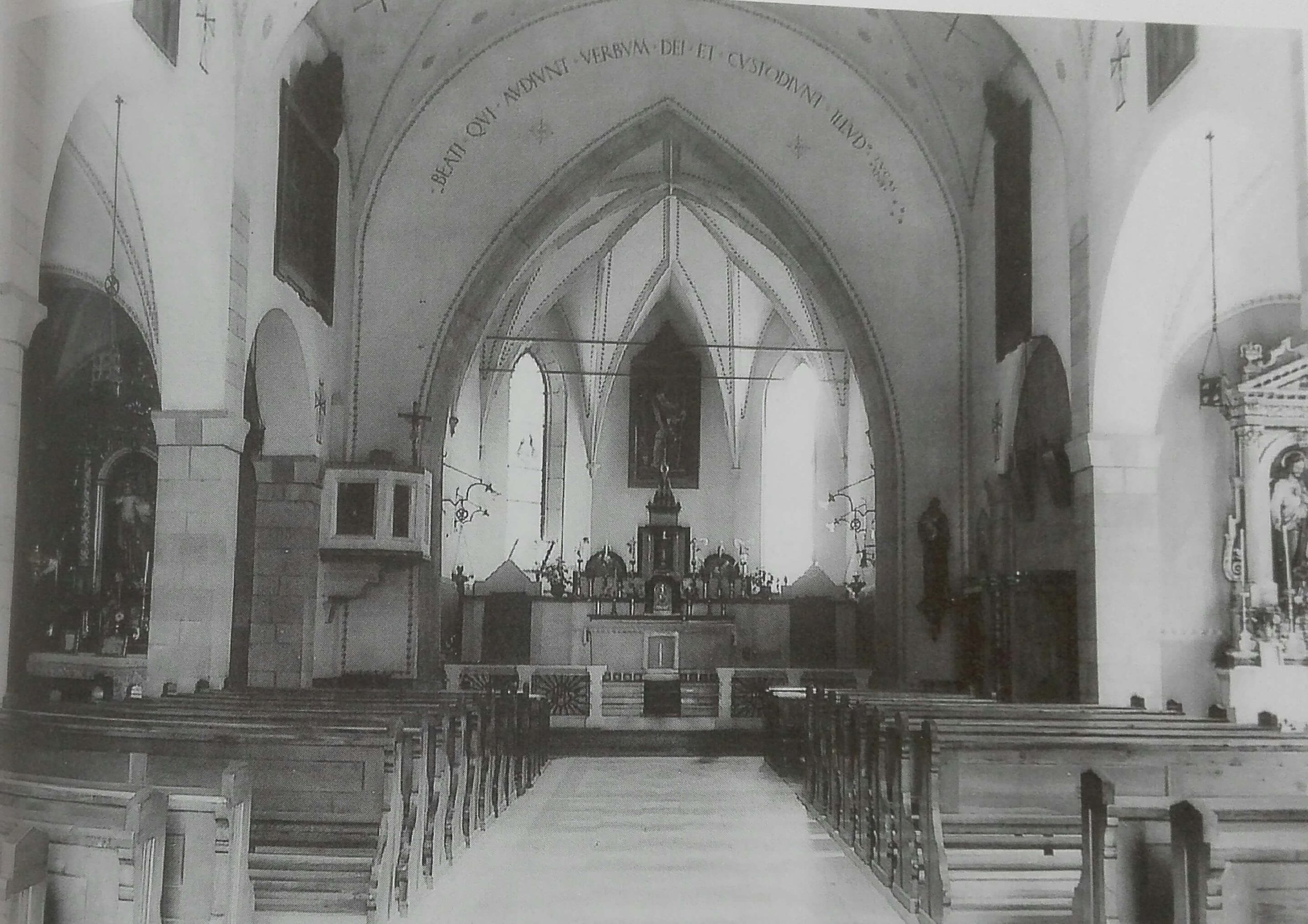 Interni Prima degli anni Venti, la chiesa presentava un’unica navata impostata secondo lo stile gotico con le volte sostenute da elementi in pietra. Tracce di questo edificio si trovano nell’abside dell’attuale edificio. Seguendo il progetto del Tiella, alla navata centrale furono aggiunte altre due laterali sostenute da colonne e pilastri, più basse rispetto a quella principale. La decorazione della volta originaria fu modificata e venne sostituita da lavori in tempera compiuti da Giovanni Vanzo di Cavalese con simboli legati a Cristo, accostati a opere su tavola raffiguranti gli Evangelisti realizzate da un artista roveretano. L’abside gotica è impreziosita da numerosi dipinti realizzati da Antonio Longo. Il più significativo senza dubbi è la pala posta sull’altare maggiore che rappresenta gli ultimi momenti della vita di Cristo. Si tratta di un Crocifisso datato 1796 caratterizzato da un’eccezionale resa anatomica e da una profonda armonia compositiva. Sempre allo stesso artista appartengono i dipinti esposti nella navata centrale dell’edificio, tra i quali spiccano: san Nicola con l’attributo delle palle d’oro (simbolo del santo raffigurato); il vigoroso Arcangelo Michele e il premuroso Arcangelo Raffaele, in prossimità dell’uscita. Nell’edificio sono presenti altre notevoli opere pittoriche come il Sant’Antonio e Bambino del 1834 realizzato da Bartolomeo Rasmo, allievo del Longo. Le stazioni della Via Crucis, di autore ignoto, risalgono al XIX secolo.