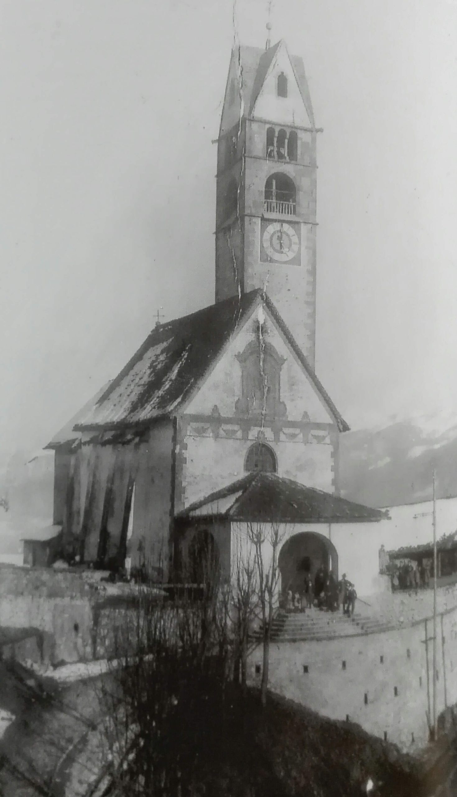 Esterni A lavori ultimati, esternamente l’edificio sacro si presentò con vistose modifiche. Il largo portico che un tempo riparava le persone dalle intemperie e dal sole, posto in corrispondenza dell’ingresso principale della chiesa fu abbattuto. Lo stesso destino toccò ai contrafforti collocati lungo le fiancate dell’edificio (nella parrocchiale di Varena sono ancora visibili), demoliti per aumentare la larghezza della chiesa.