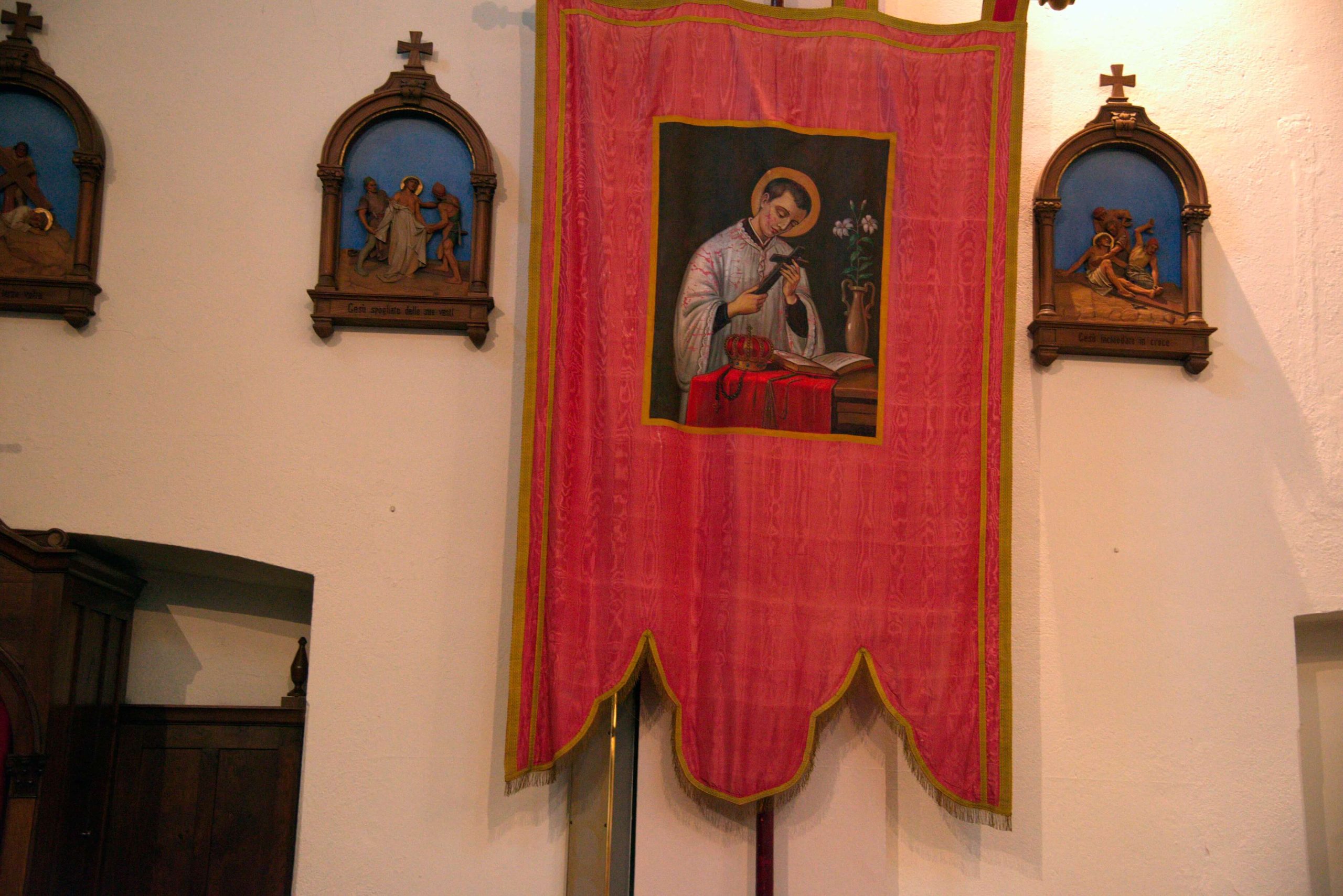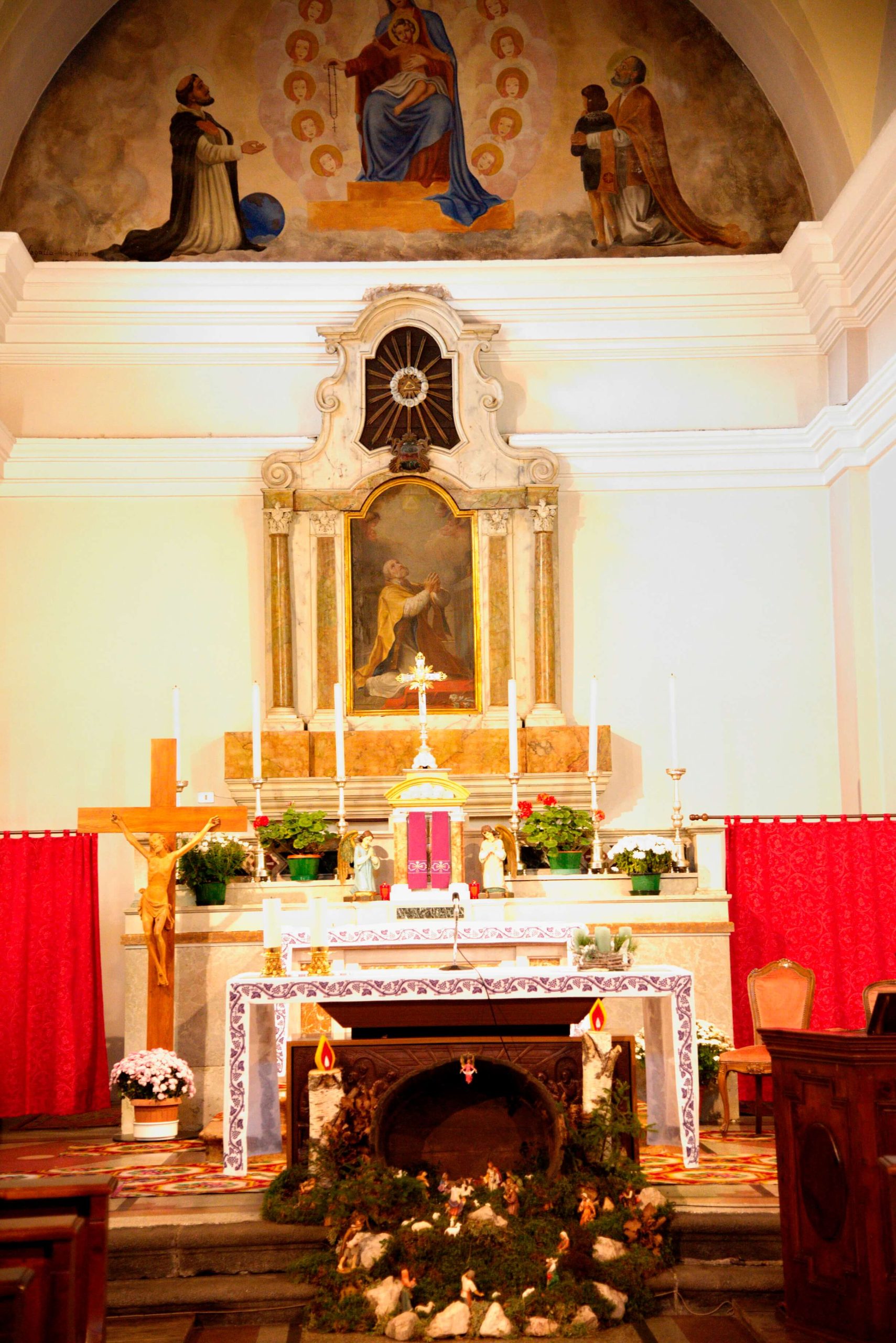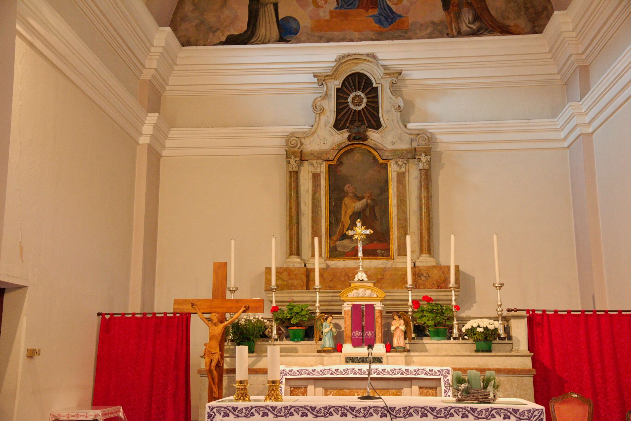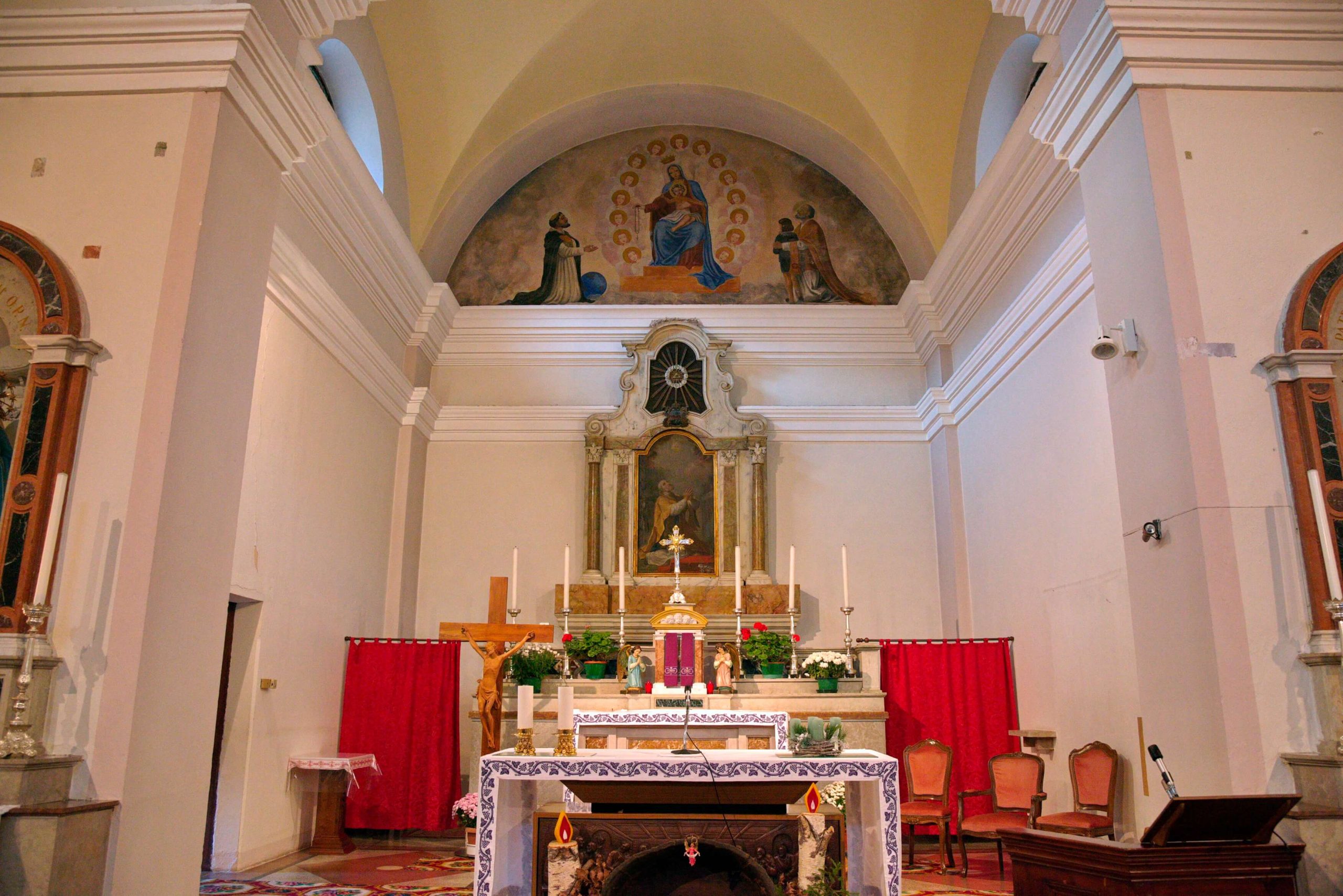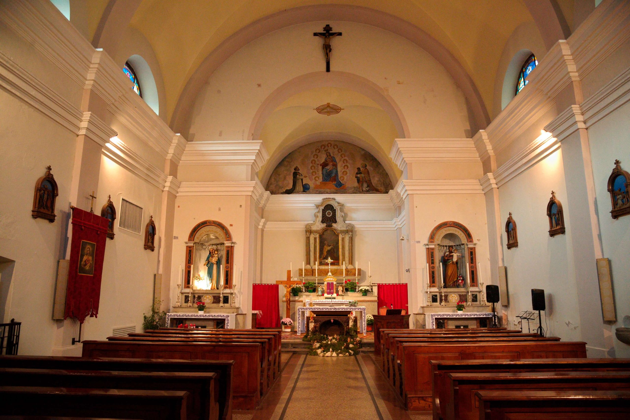 L’interno rispecchia i canoni di semplicità dell’esterno e si sviluppa a navata unica, ritmata da coppie di lesene intonacate, raccordate da arcate trasversali che scandiscono la volta a botte e definiscono lo spazio delle campate. Il presbiterio, rialzato su un gradino, è privo di abside. Un doppio cornicione marcapiano modanato percorre l’intero perimetro.