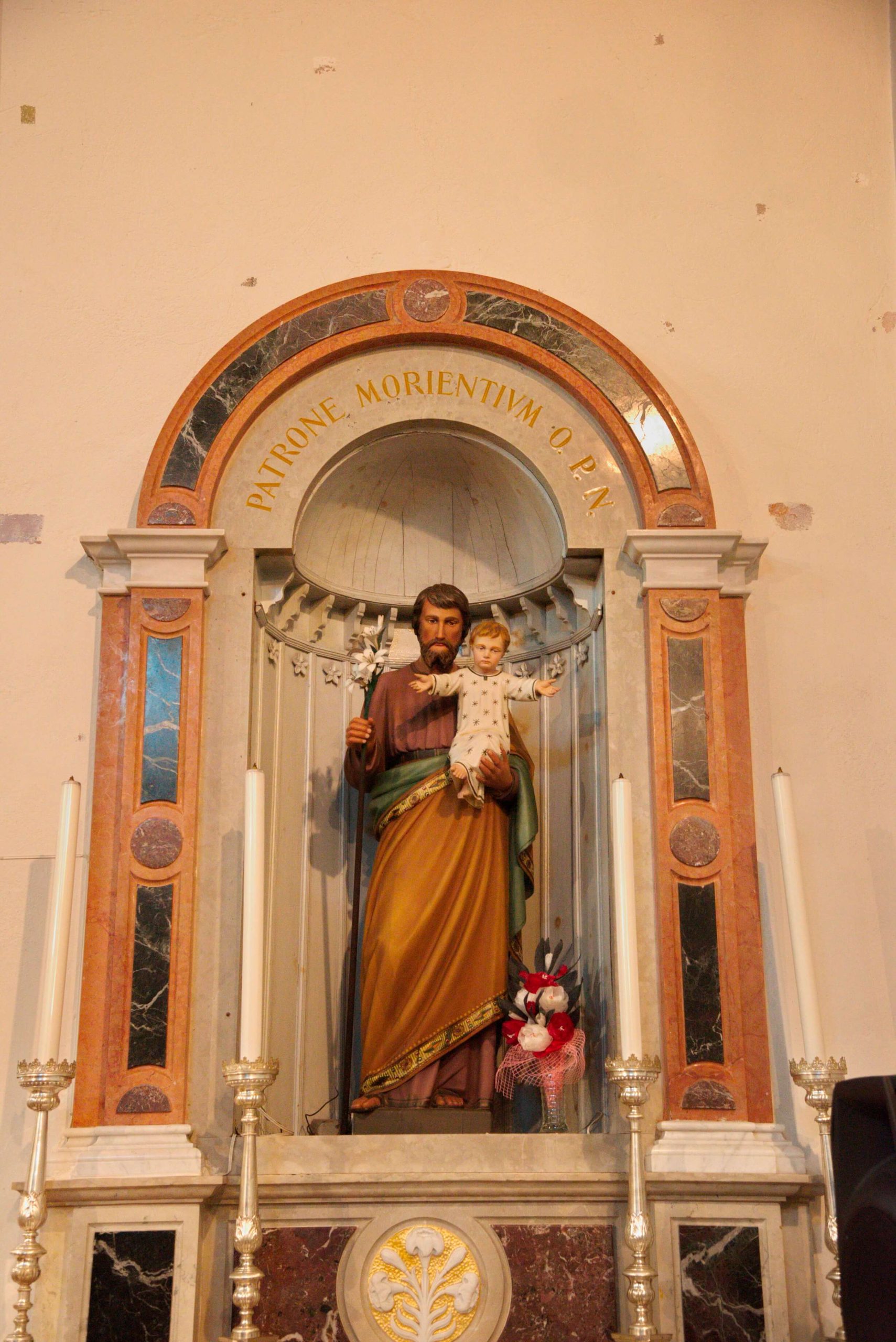 Le fiancate, lisce, recano ciascuna tre finestre lunettate in corrispondenza delle campate interne; al centro del lato destro si dispone un portale secondario con stipiti in pietra.