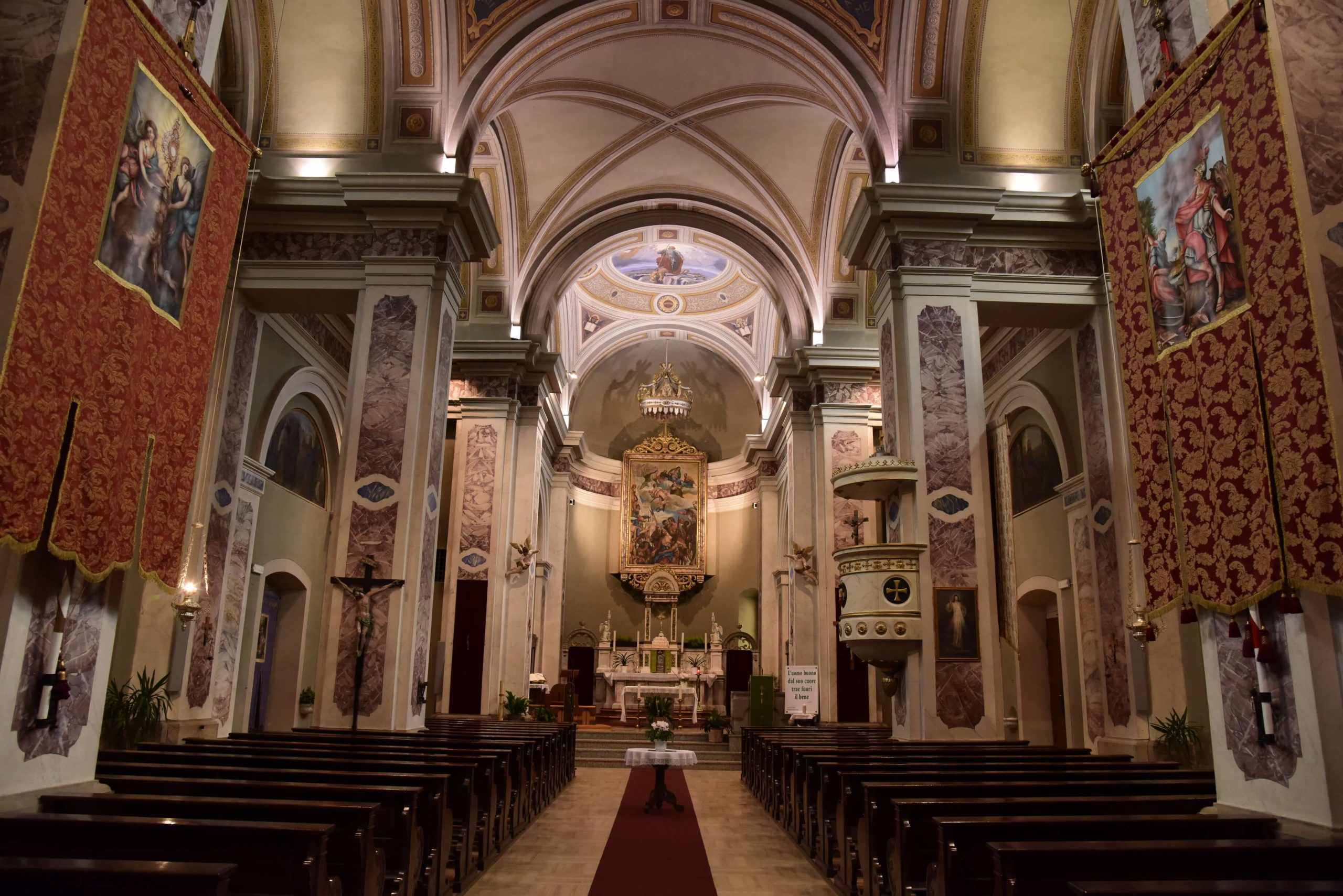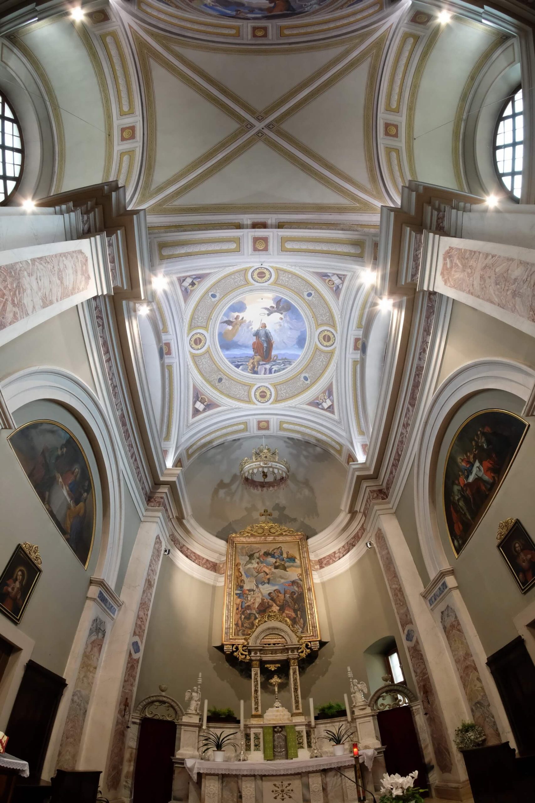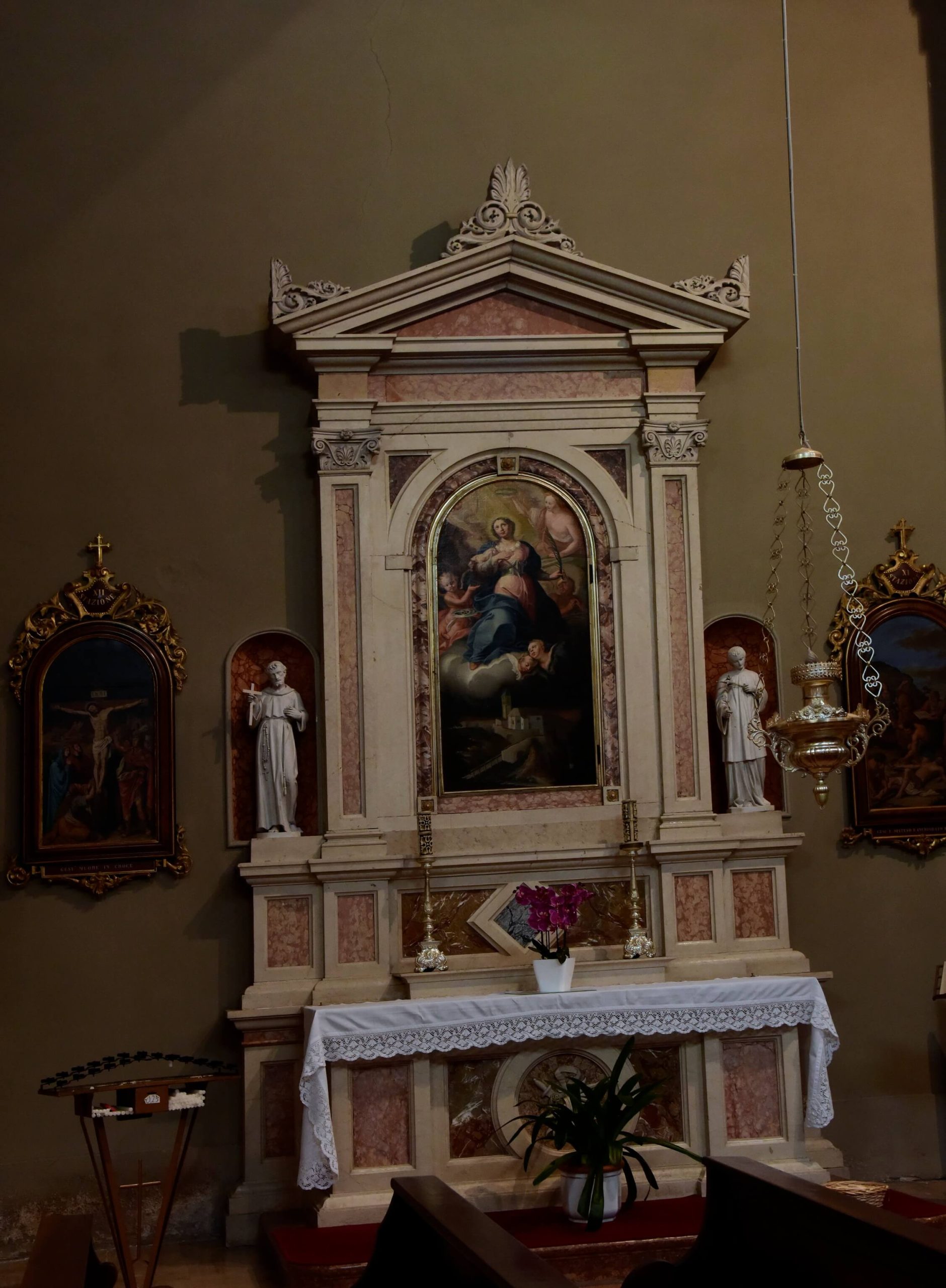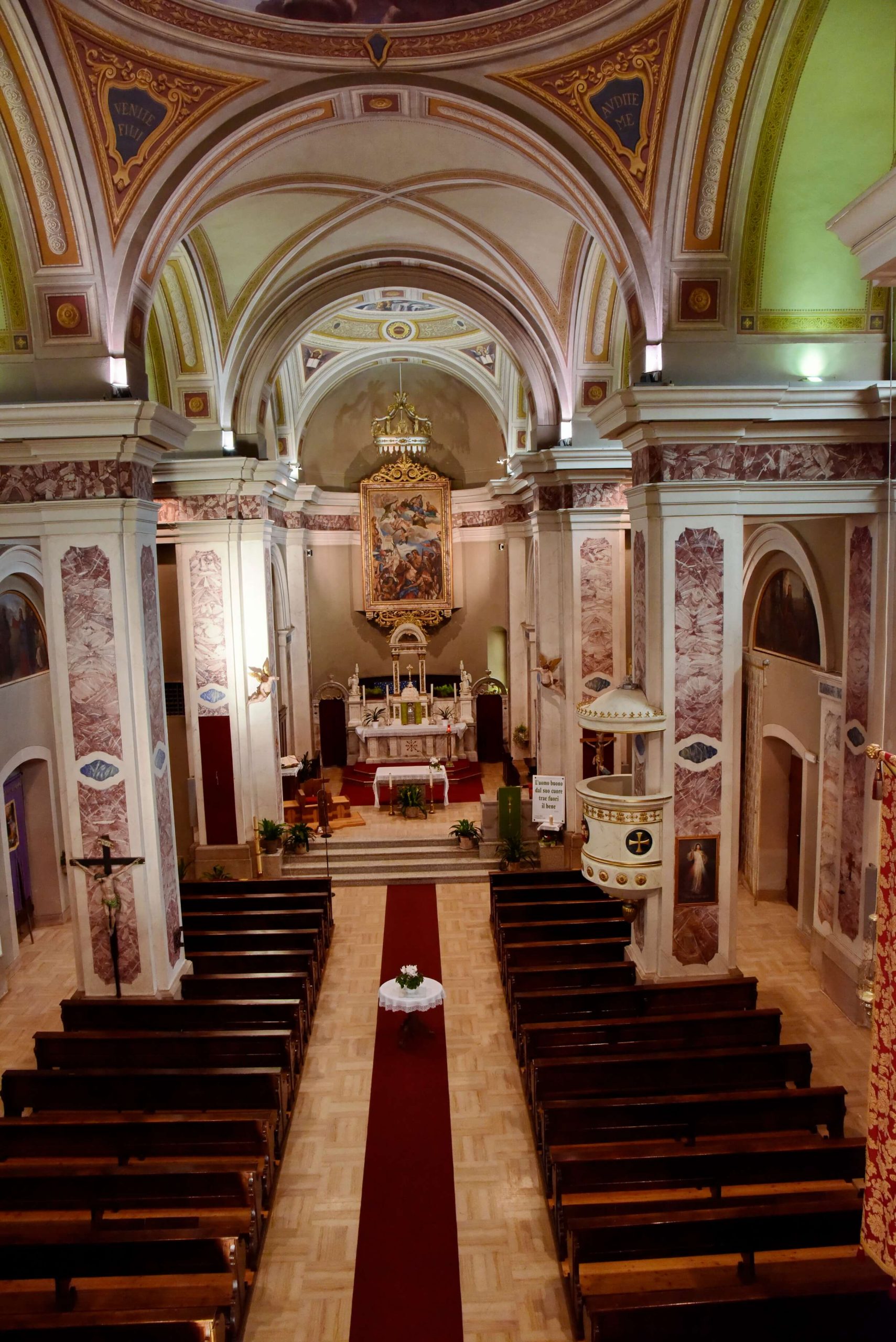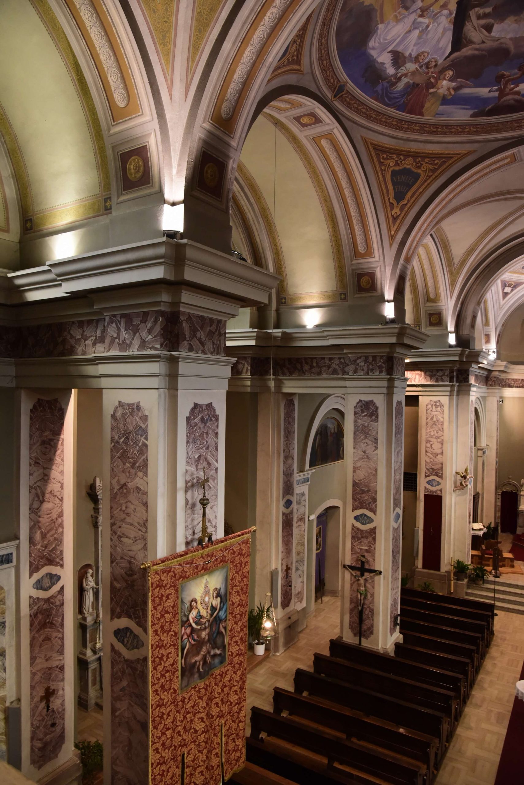 La fiancata nord, costruita a strapiombo sulla valle, vede emergere il corpo della cappella laterale, presso il quale è presente un affresco raffigurante San Cristoforo, patrono dei viaggiatori. Il lato sinistro, rivolto a mezzogiorno, reca due finestre lunettate, tra le quali si inserisce il portale secondario a luce archiacuta. All’interno la navata unica è interrotta all’altezza della terza campata da una cancellata in ferro battuto, oltre la quale si sviluppa il corpo della cappella laterale, aggiunta sul lato sinistro nel 1640 e inquadrata da un’arcata a pieno centro abbellita da quindici ovali con i Misteri del Rosario. Il presbiterio, introdotto dall’arco santo archiacuto e rialzato su un gradino, si conclude in un’abside poligonale.