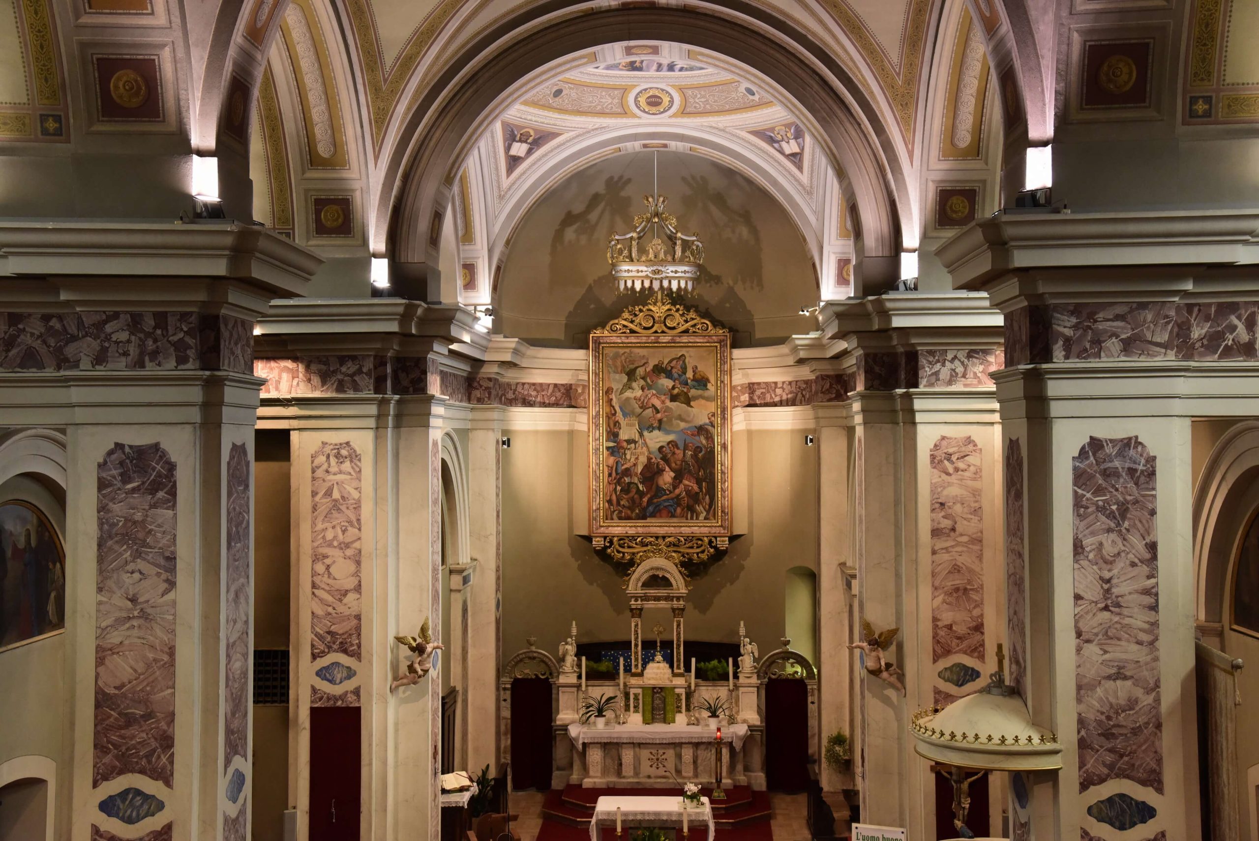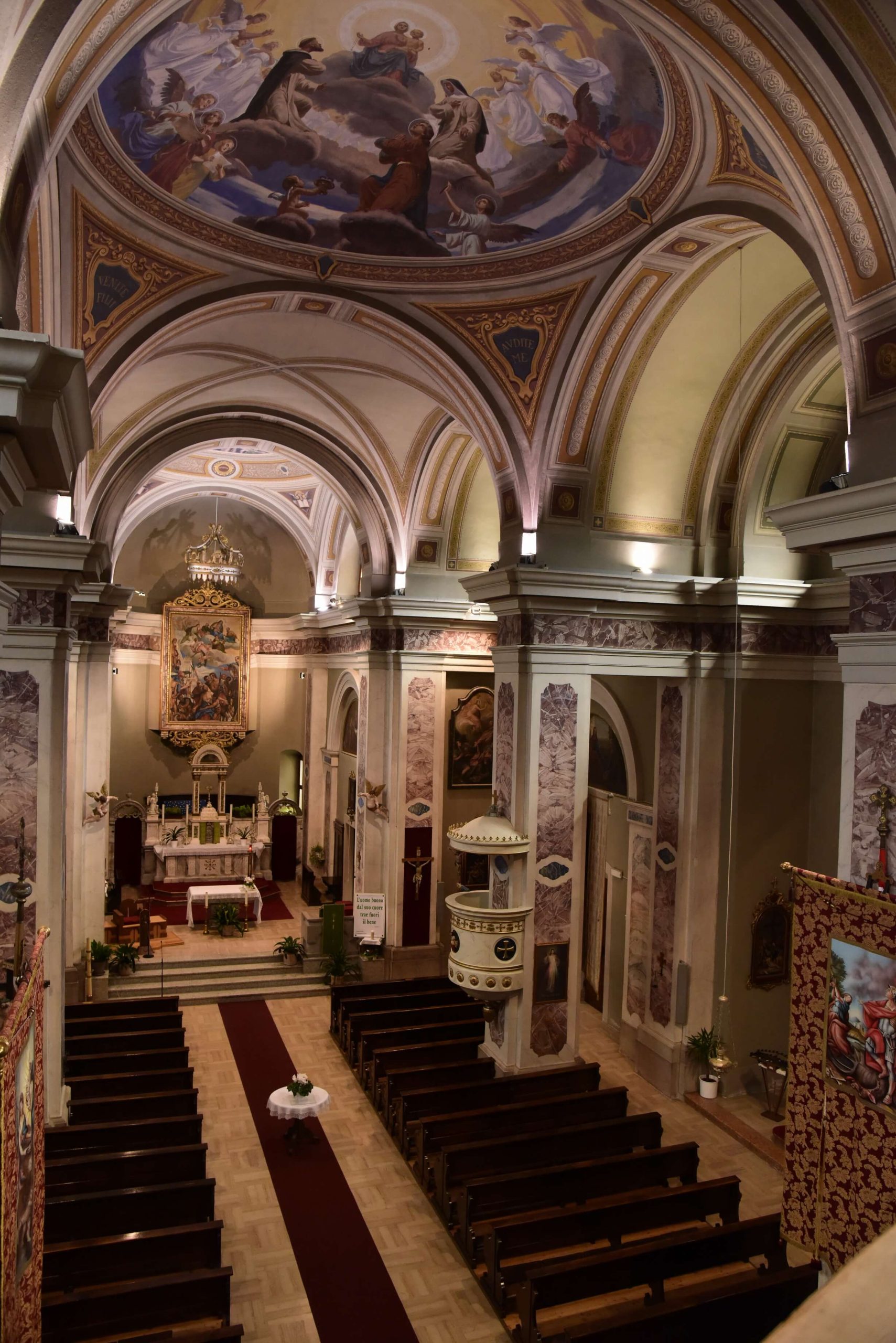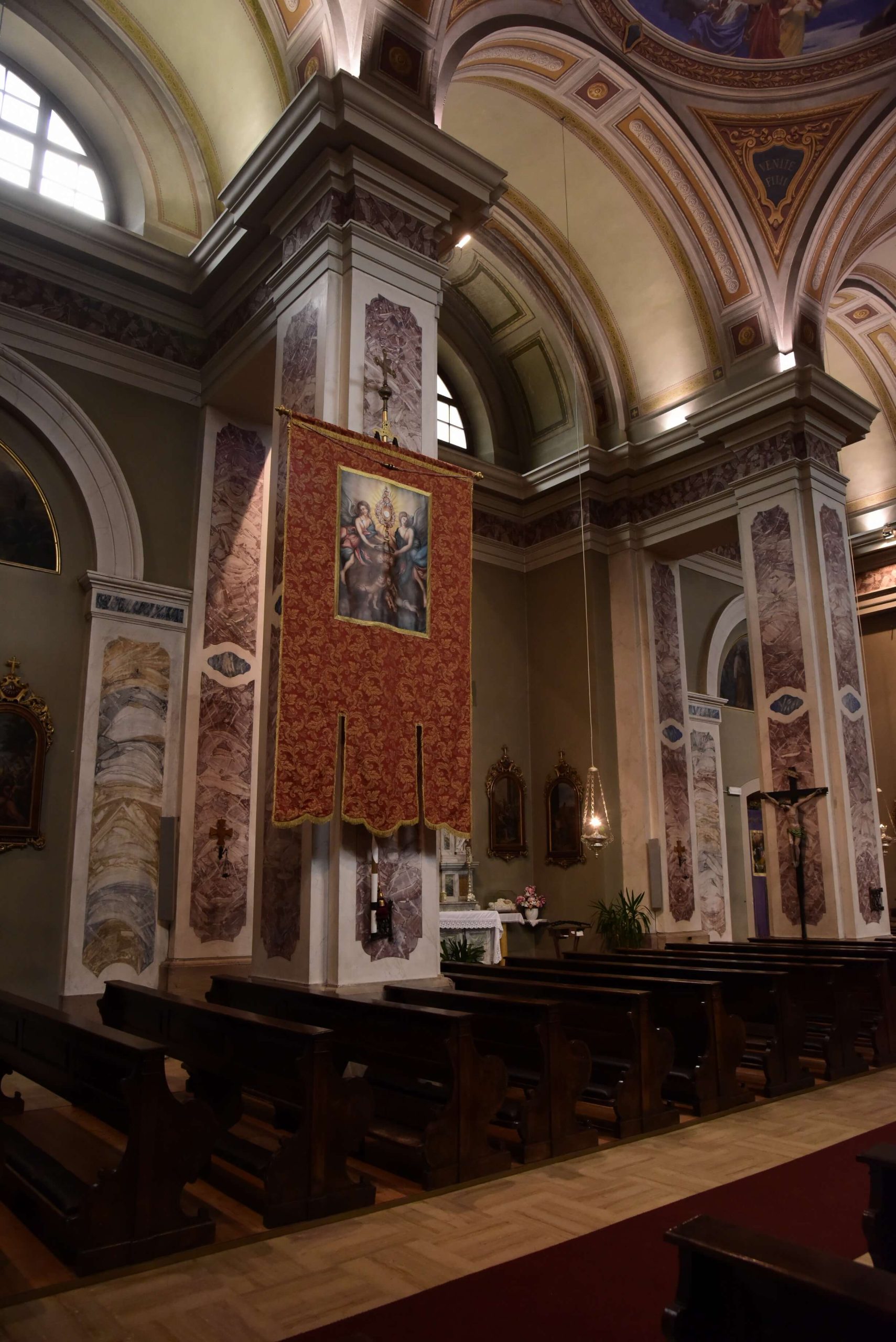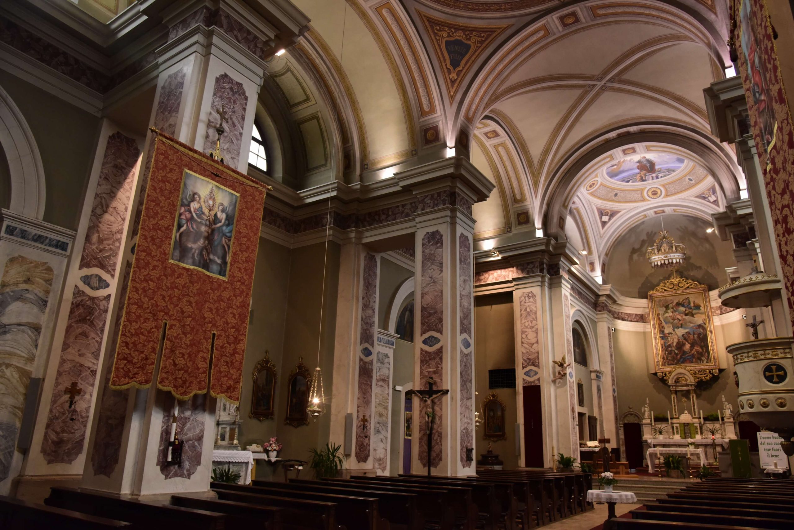 La fiancata nord, costruita a strapiombo sulla valle, vede emergere il corpo della cappella laterale, presso il quale è presente un affresco raffigurante San Cristoforo, patrono dei viaggiatori. Il lato sinistro, rivolto a mezzogiorno, reca due finestre lunettate, tra le quali si inserisce il portale secondario a luce archiacuta. All’interno la navata unica è interrotta all’altezza della terza campata da una cancellata in ferro battuto, oltre la quale si sviluppa il corpo della cappella laterale, aggiunta sul lato sinistro nel 1640 e inquadrata da un’arcata a pieno centro abbellita da quindici ovali con i Misteri del Rosario. Il presbiterio, introdotto dall’arco santo archiacuto e rialzato su un gradino, si conclude in un’abside poligonale.