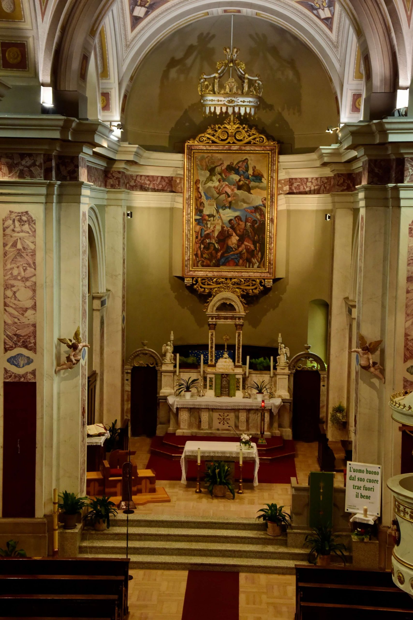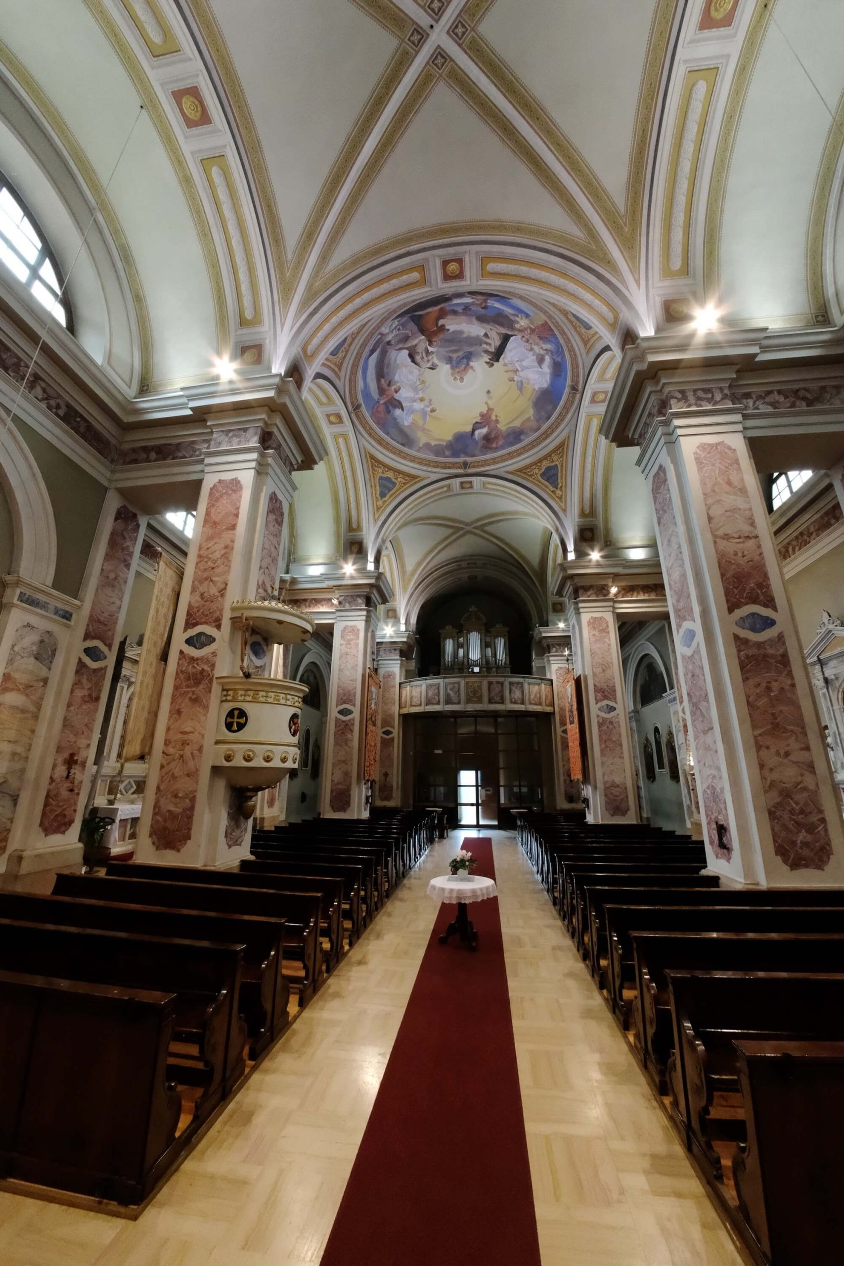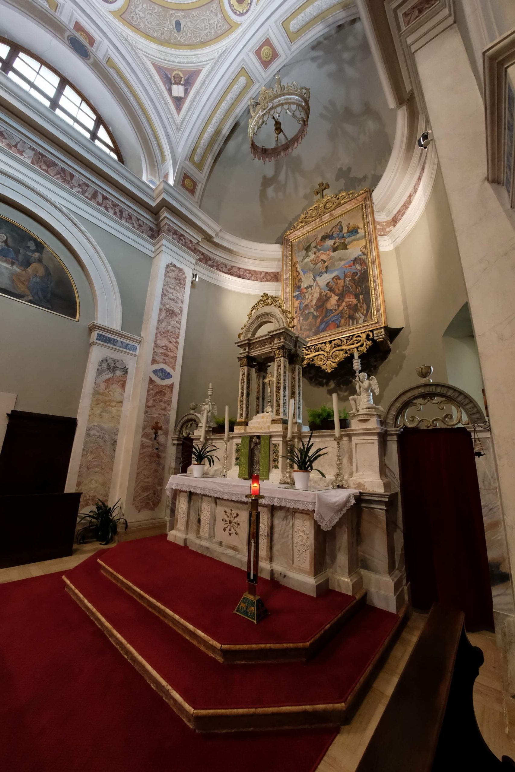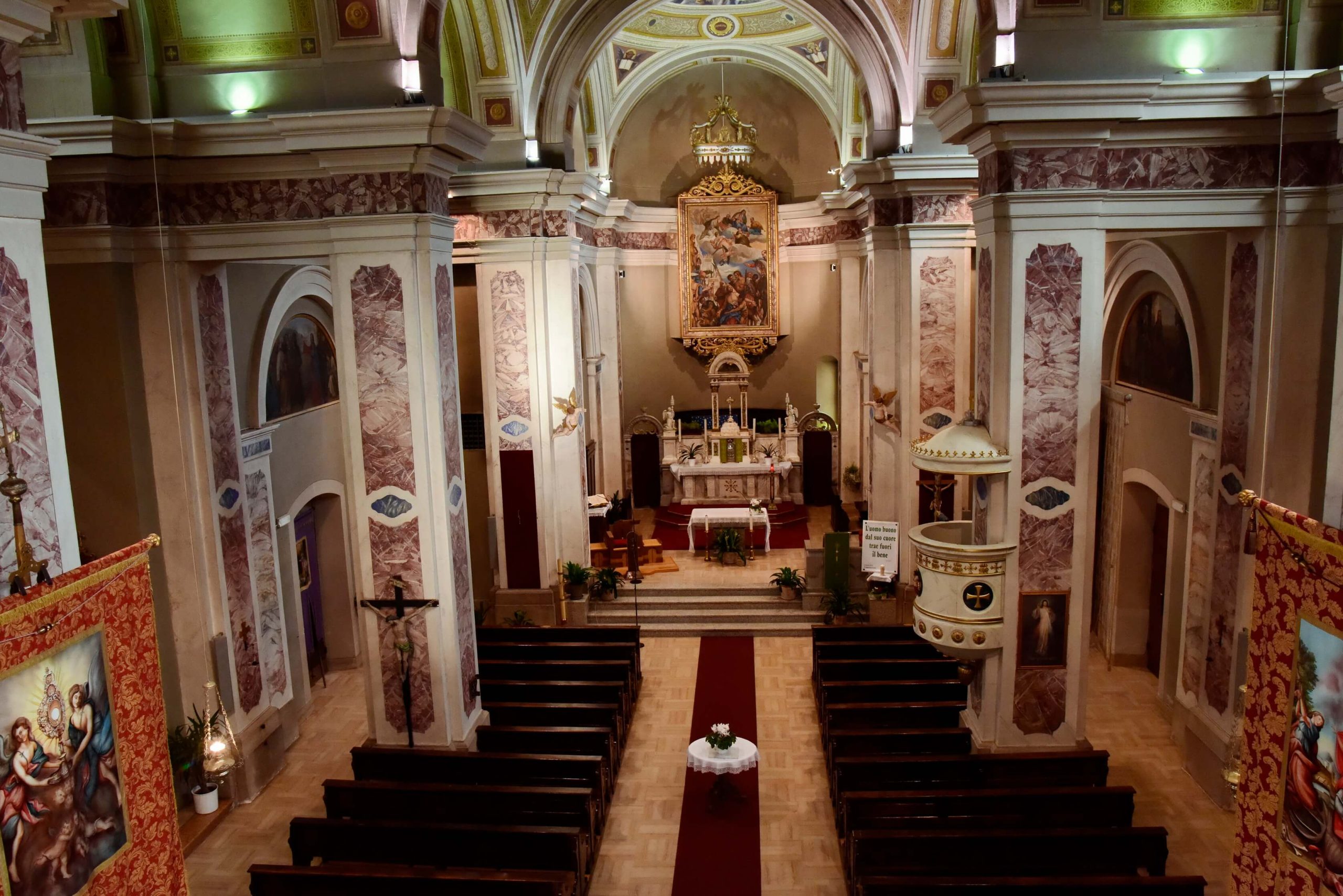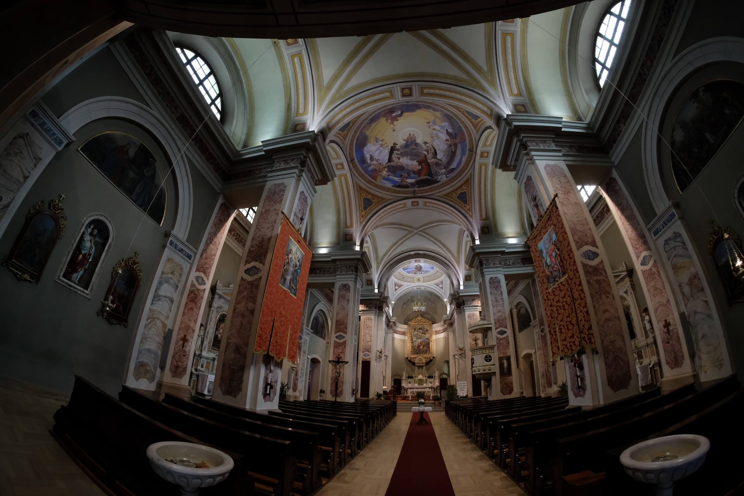 La fiancata nord, costruita a strapiombo sulla valle, vede emergere il corpo della cappella laterale, presso il quale è presente un affresco raffigurante San Cristoforo, patrono dei viaggiatori. Il lato sinistro, rivolto a mezzogiorno, reca due finestre lunettate, tra le quali si inserisce il portale secondario a luce archiacuta. All’interno la navata unica è interrotta all’altezza della terza campata da una cancellata in ferro battuto, oltre la quale si sviluppa il corpo della cappella laterale, aggiunta sul lato sinistro nel 1640 e inquadrata da un’arcata a pieno centro abbellita da quindici ovali con i Misteri del Rosario. Il presbiterio, introdotto dall’arco santo archiacuto e rialzato su un gradino, si conclude in un’abside poligonale.