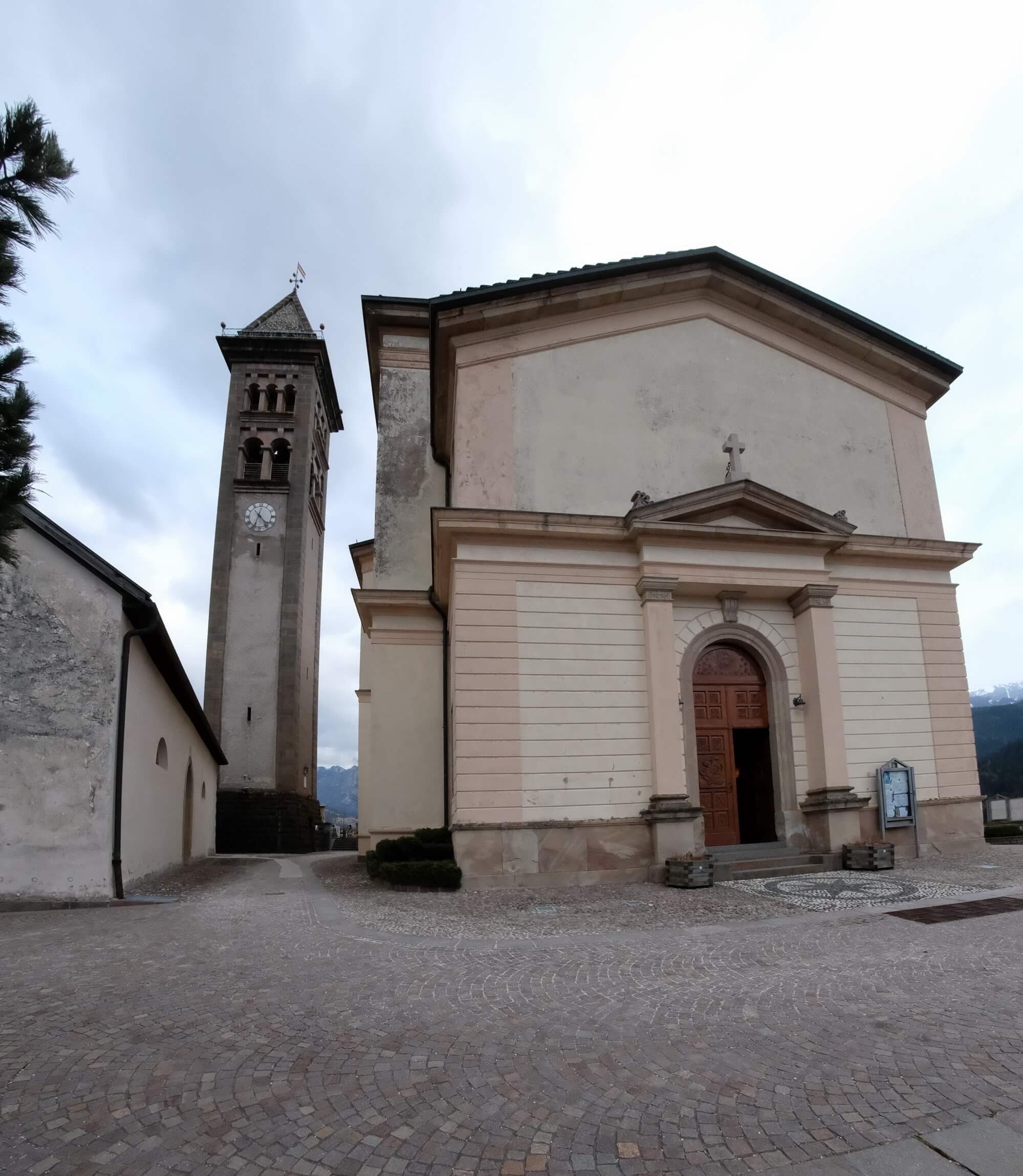 L’attuale edificio sacro fu costruito tra il 1850 e il 1856 su progetto del trentino Leopoldo Claricini secondo lo stile neoclassico con soluzioni architettoniche vicine alla parrocchiale di Capriana: facciata imponente con un avancorpo nel quale si colloca la sola apertura del portale, inquadrato da due pilastri sui quali insiste un frontone di gusto classico; cornicione fortemente aggettante che percorre tutto il perimetro dell’edificio; fianchi intervallati da cappelle laterali.