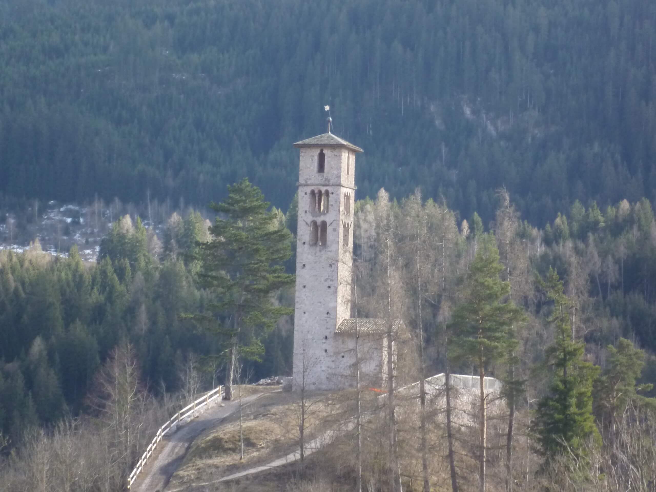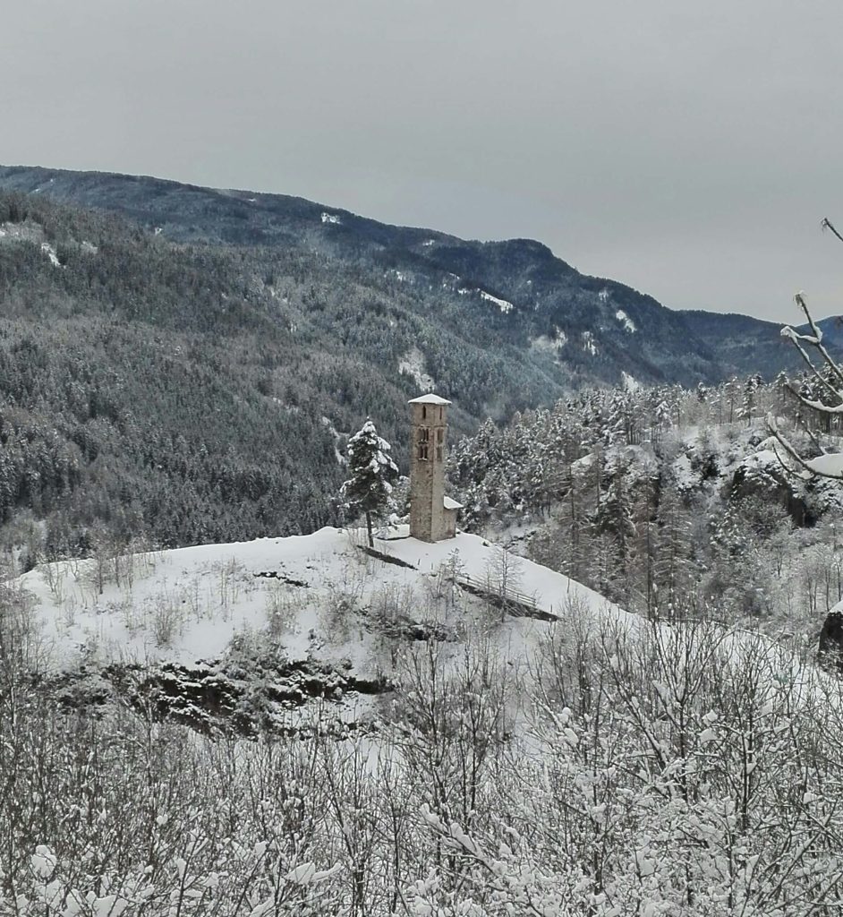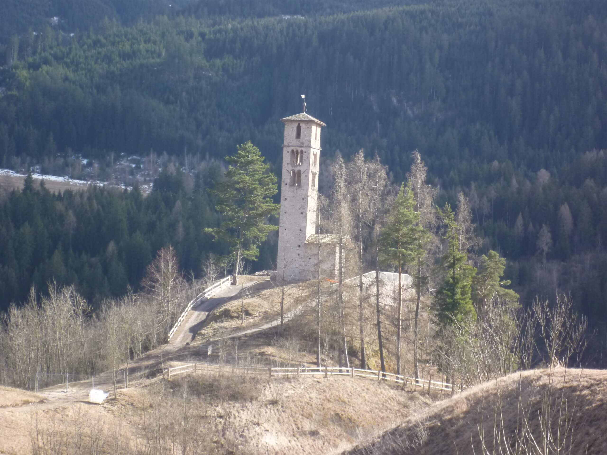 Il dosso su cui si pone l’antico campanile della chiesa dedicata a san Valerio si colloca nella zona bassa di Cavalese, a poca distanza dal parco della Pieve.