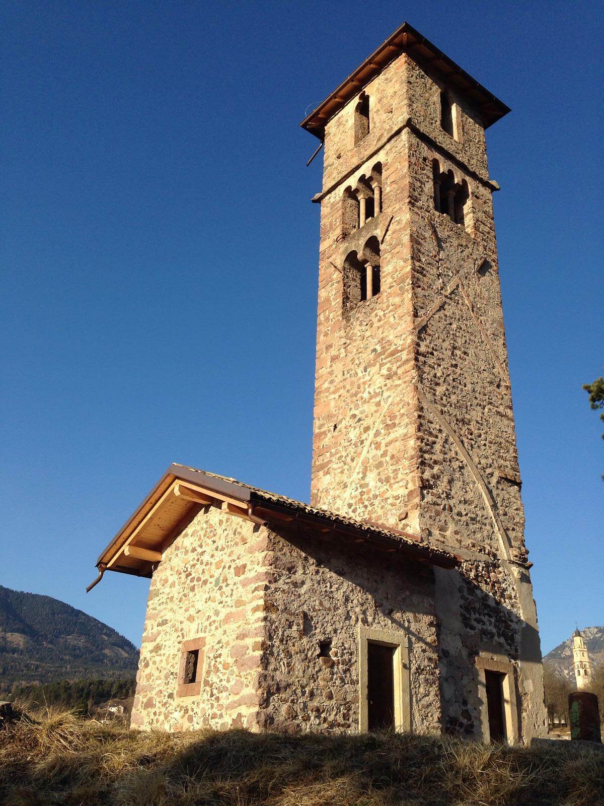 La torre campanaria in stile romanico appartiene alla prima fase di costruzione e presenta una rigorosa uniformità costruttiva: nella parte superiore si ammira un doppio ordine di bifore e trifore, al di sopra del quale si pongono delle monofore trilobate (soluzione adottata anche per Carano). Sui lati del fusto è possibile leggere la morfologia del tetto e l’andamento dell’aula. Fino alla prima metà del Novecento il campanile risultava essere intonacato e decorato con finti capitelli.
