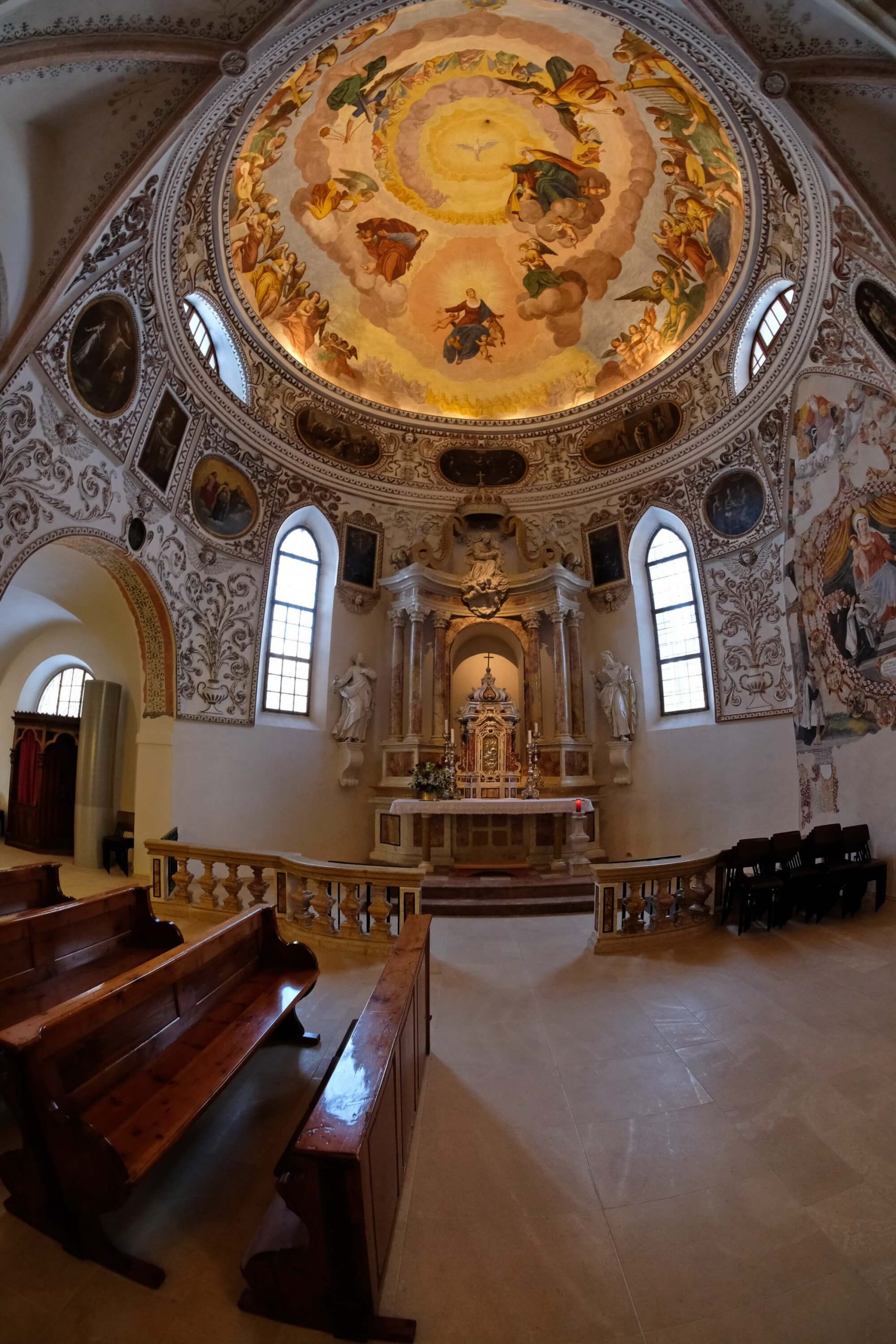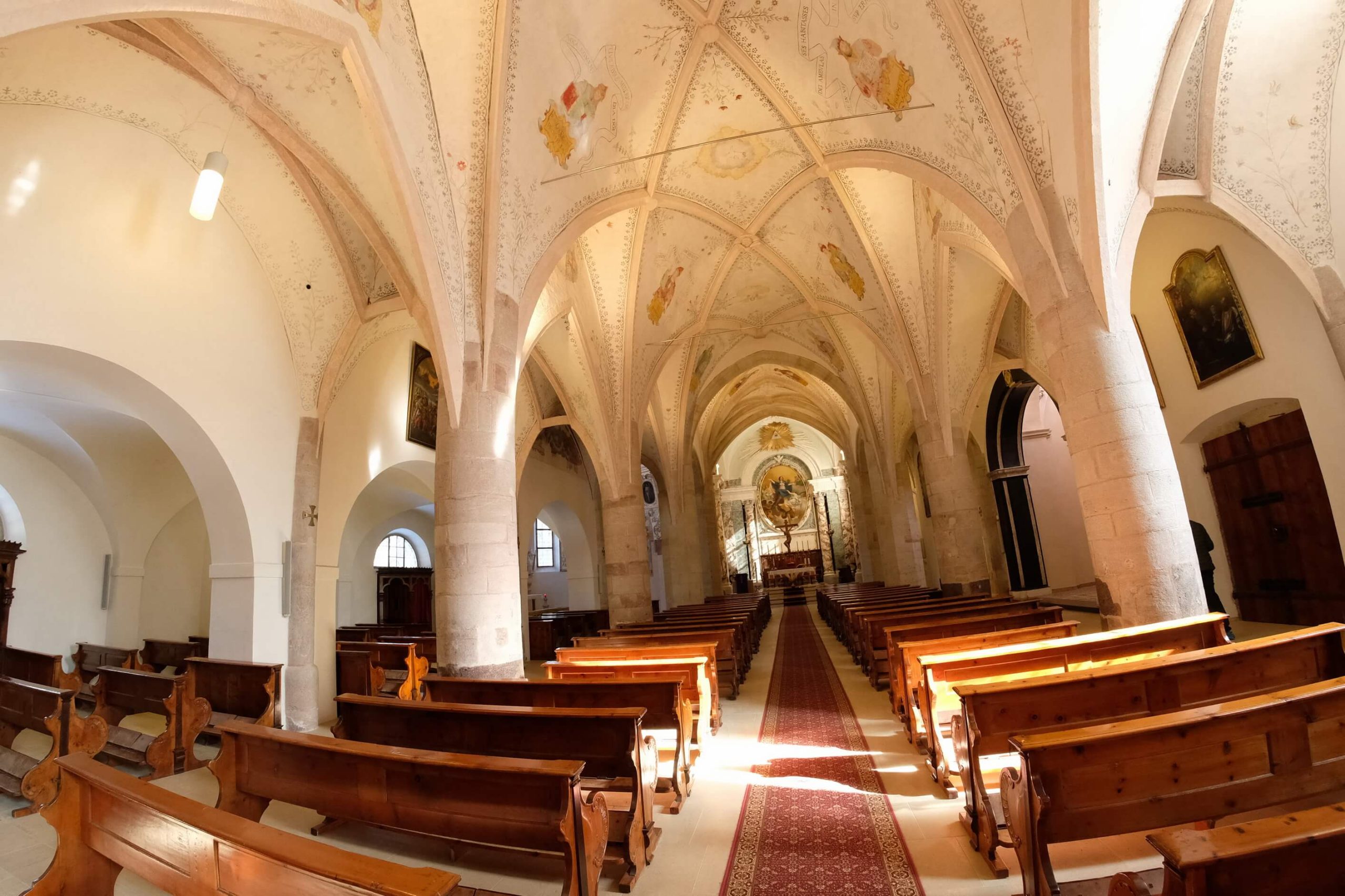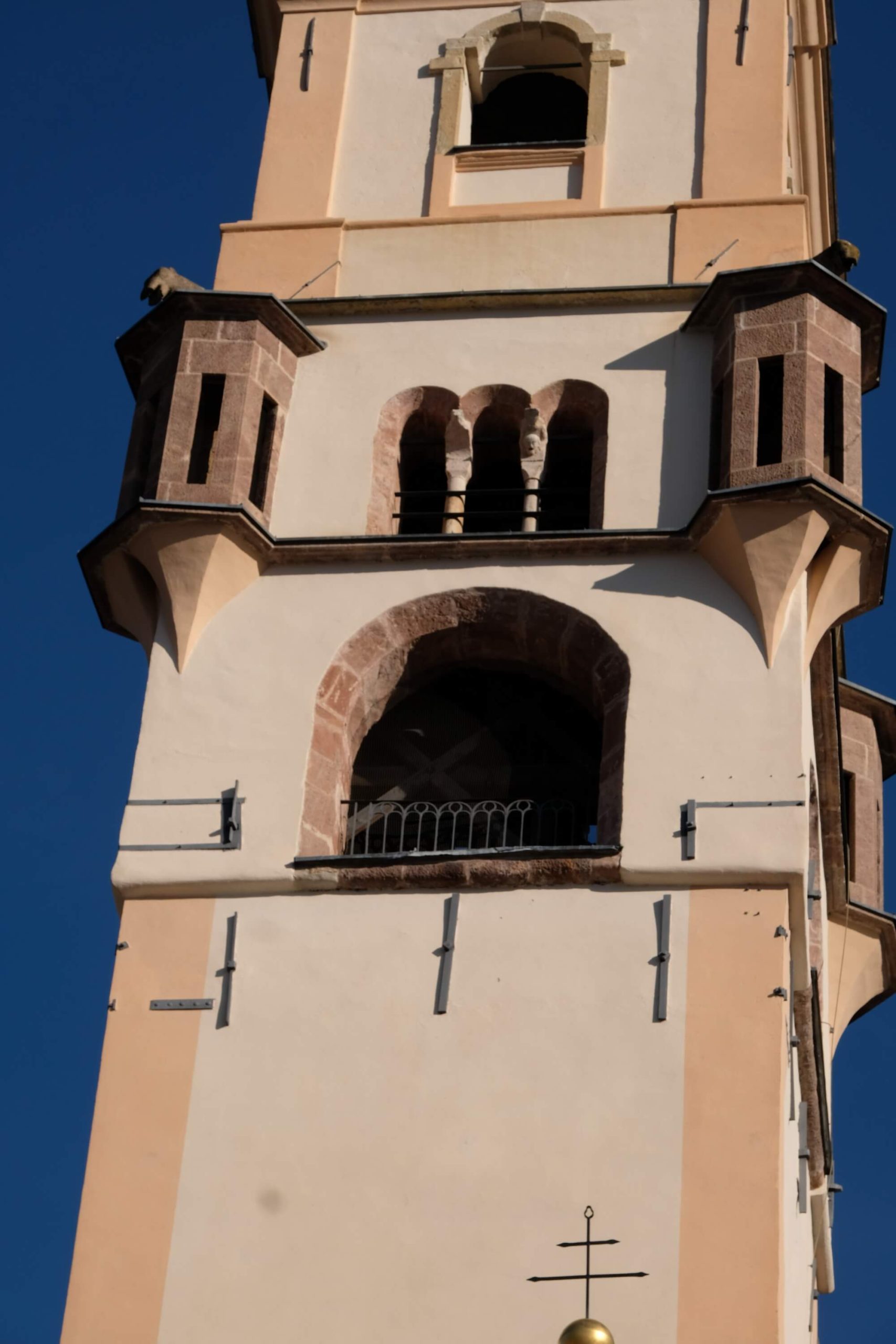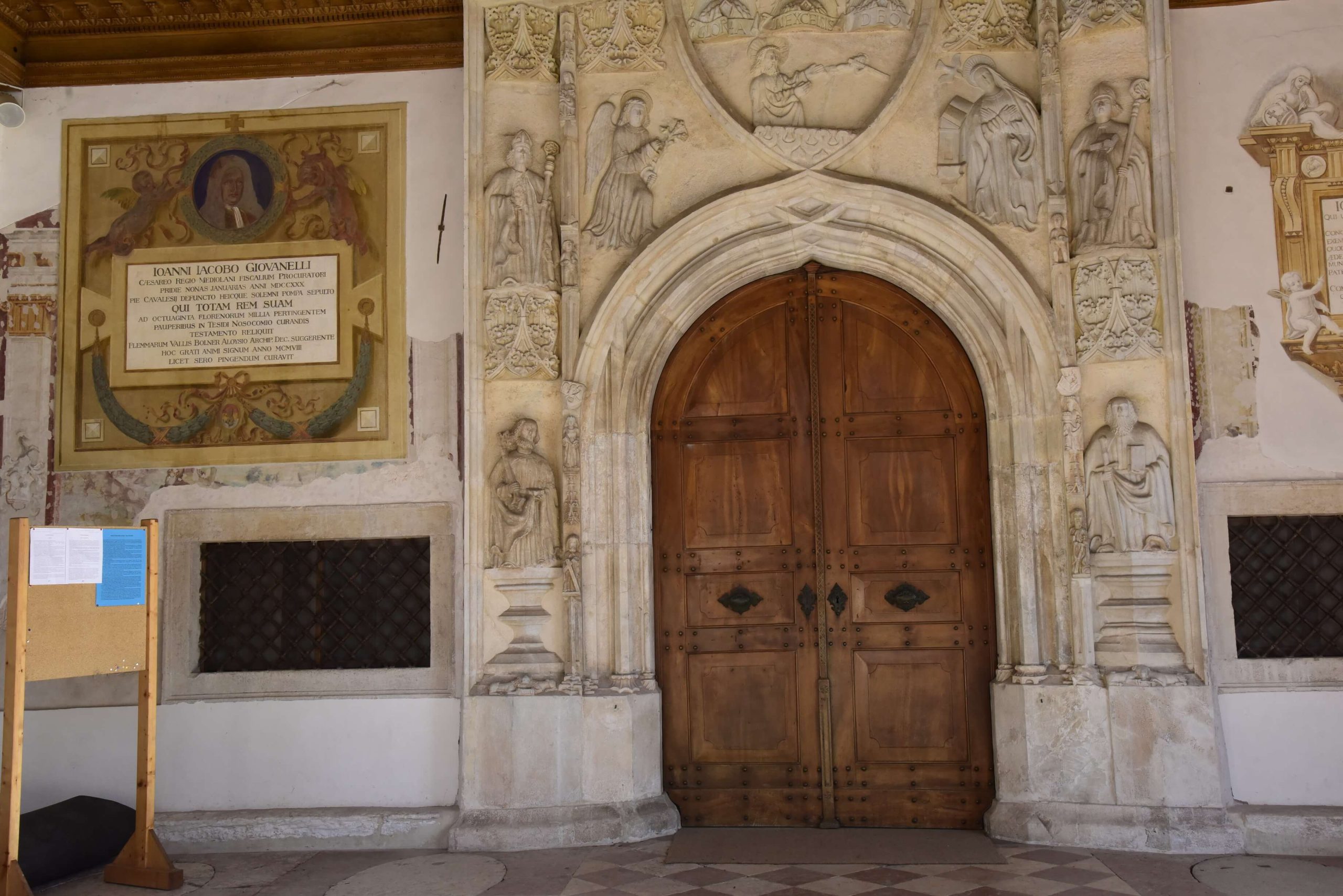 Gli alzati della struttura attuale sono quelli del XV secolo e, a testimonianza della chiusura del cantiere, sul serraglio posto in chiave alla volta troviamo un gruppo di stemmi in pietra: l’aquila di San Venceslao, stemma del Principato vescovile di Trento, quello del vescovo Giorgio Hack (1446-1465) e quello dei nobili Firmian.