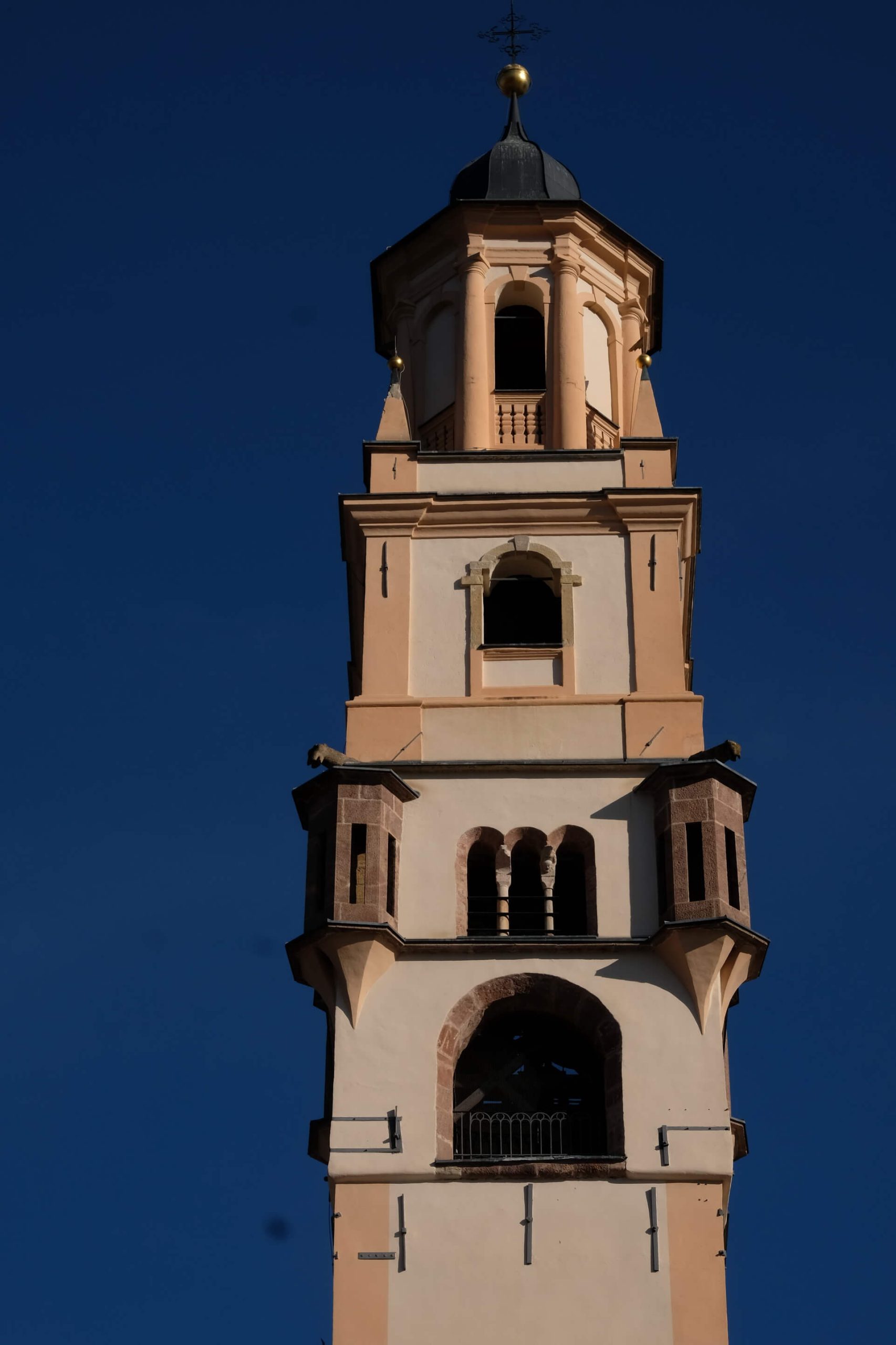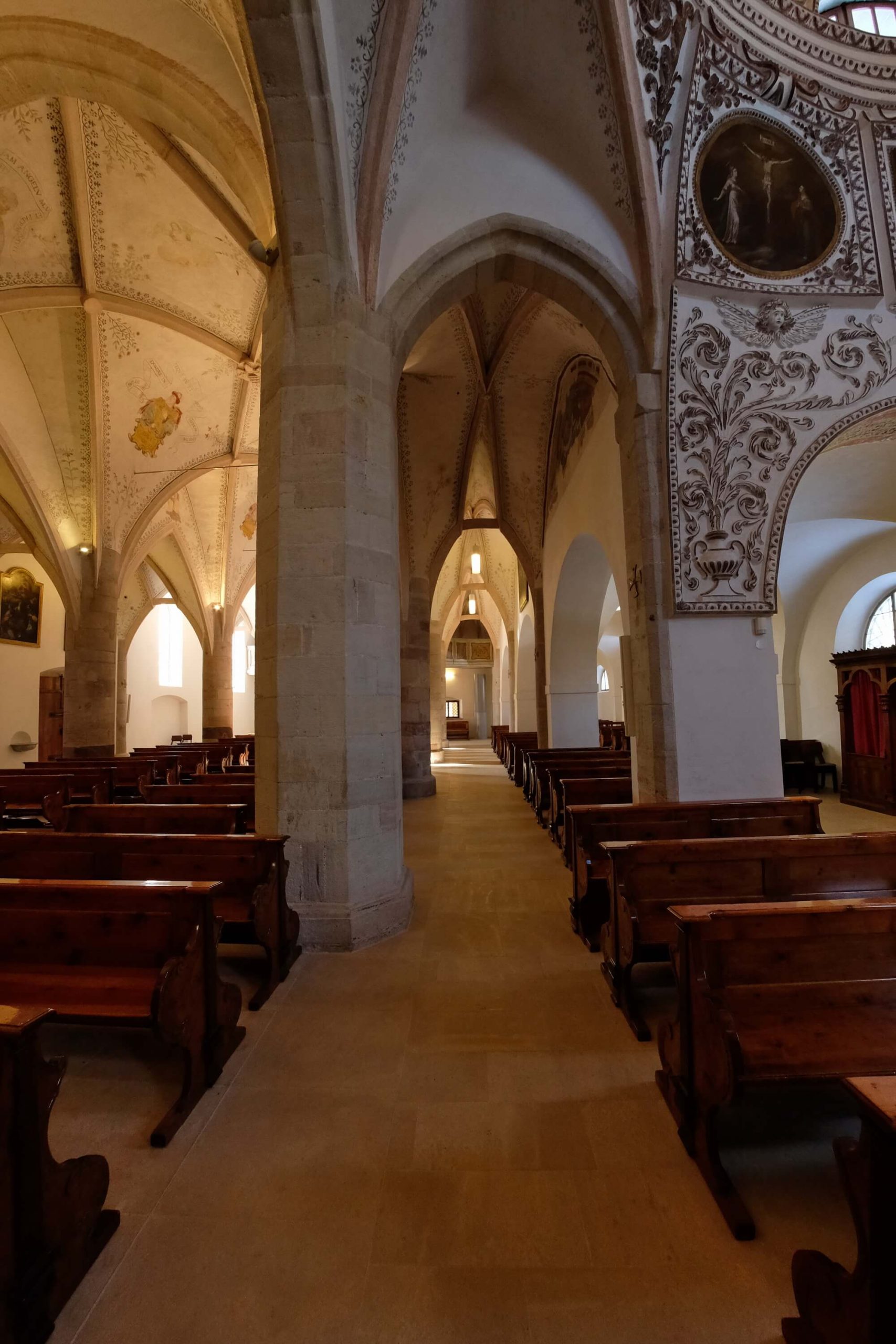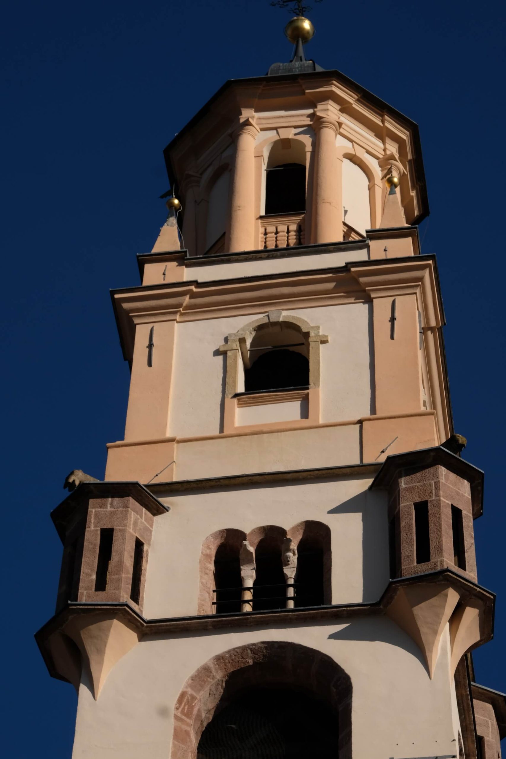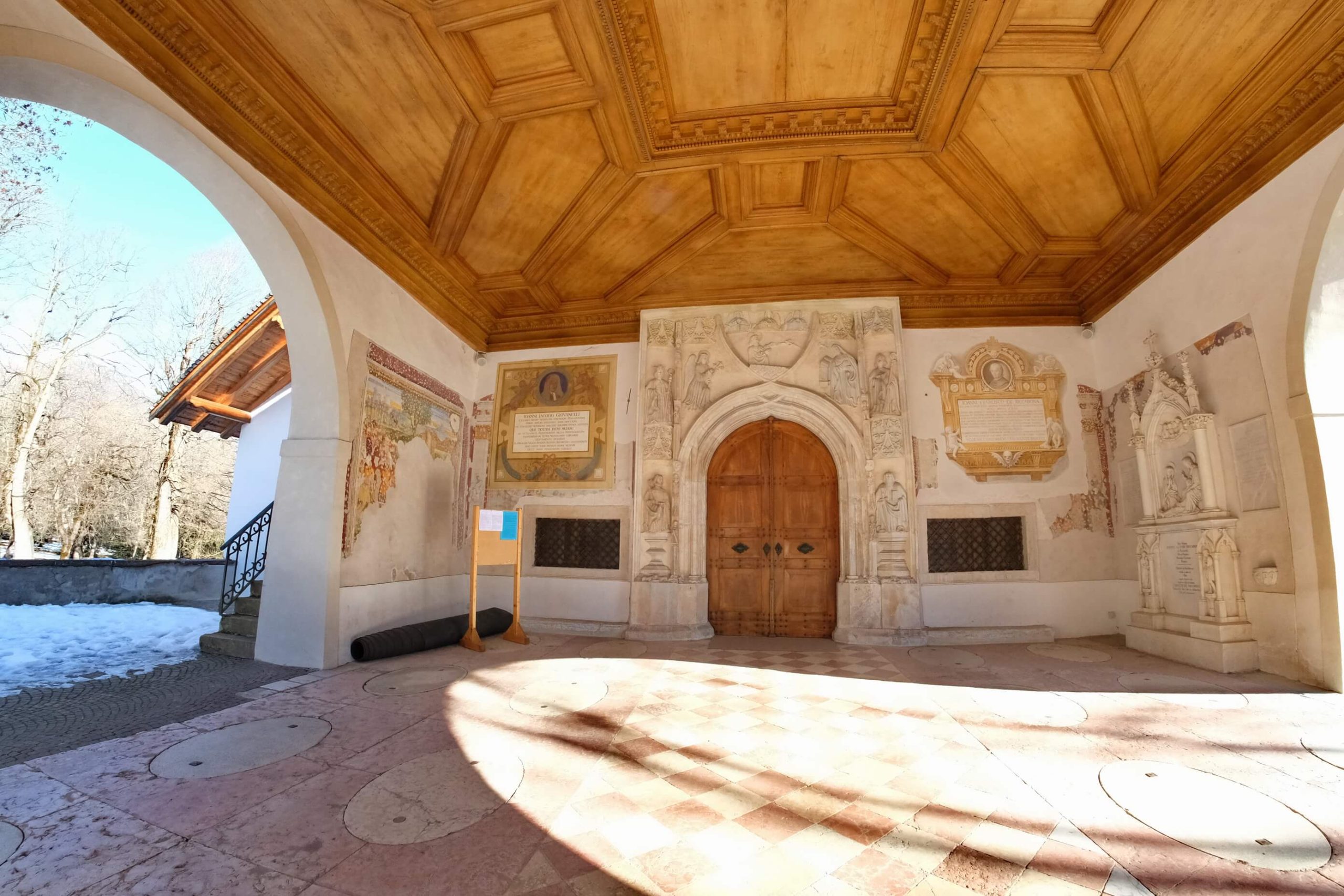 Gli alzati della struttura attuale sono quelli del XV secolo e, a testimonianza della chiusura del cantiere, sul serraglio posto in chiave alla volta troviamo un gruppo di stemmi in pietra: l’aquila di San Venceslao, stemma del Principato vescovile di Trento, quello del vescovo Giorgio Hack (1446-1465) e quello dei nobili Firmian.
