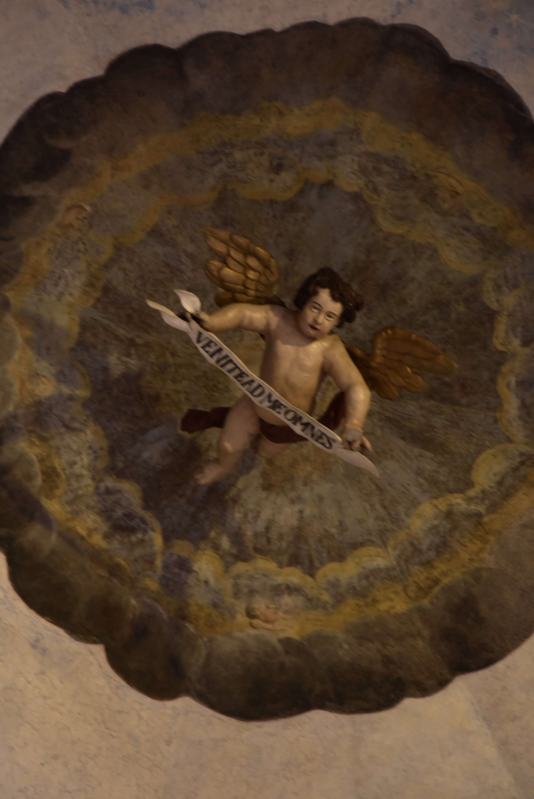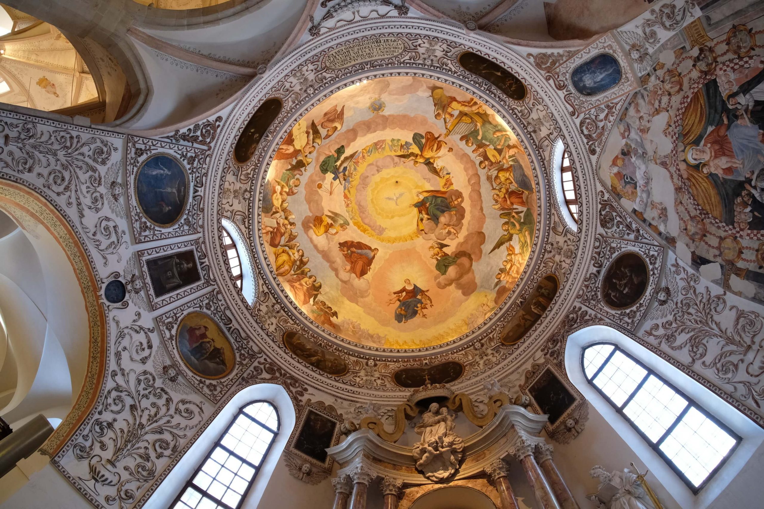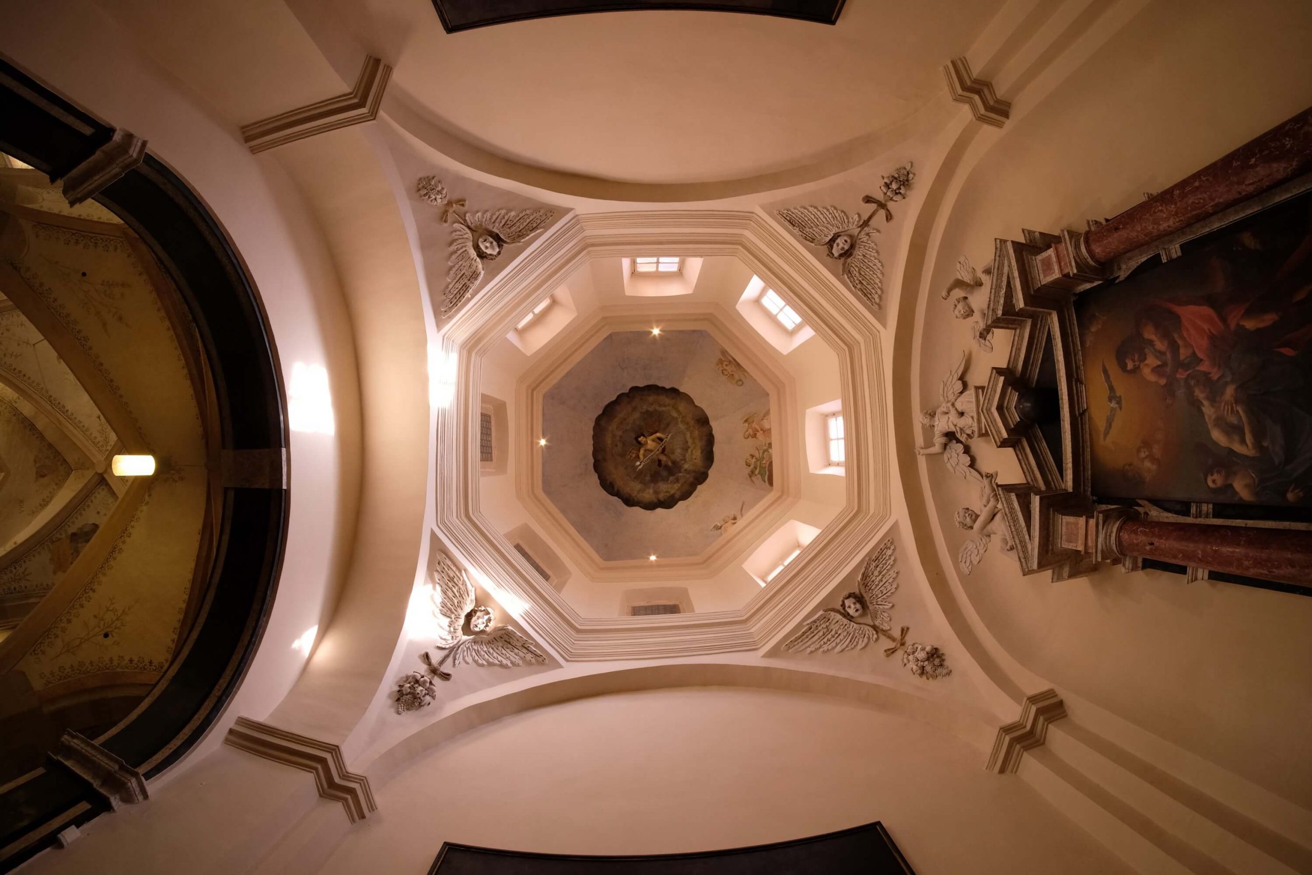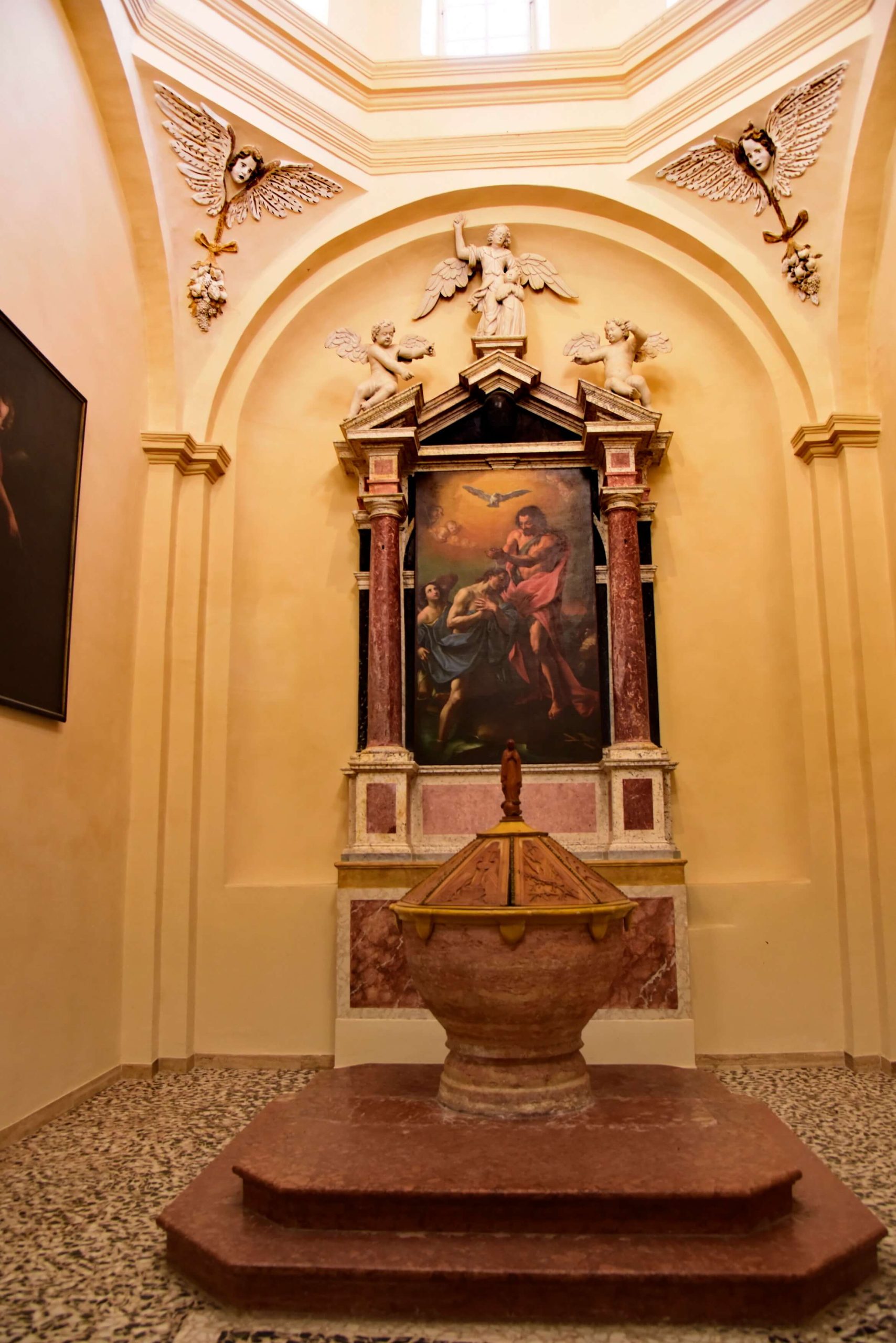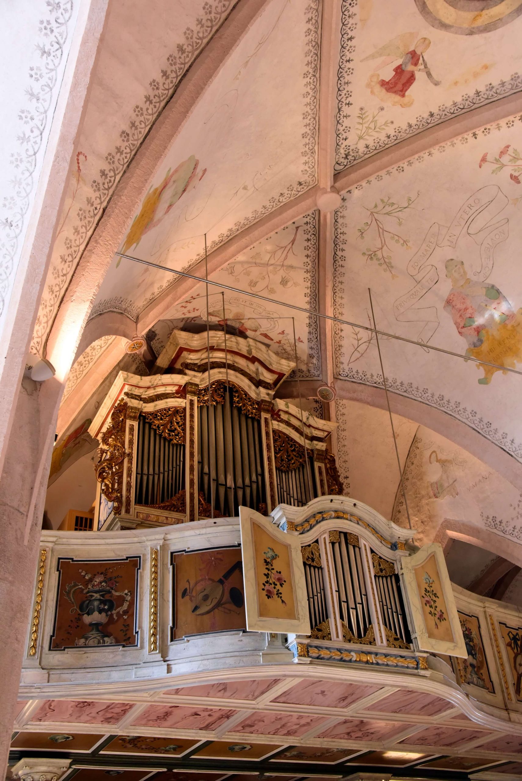 Gli alzati della struttura attuale sono quelli del XV secolo e, a testimonianza della chiusura del cantiere, sul serraglio posto in chiave alla volta troviamo un gruppo di stemmi in pietra: l’aquila di San Venceslao, stemma del Principato vescovile di Trento, quello del vescovo Giorgio Hack (1446-1465) e quello dei nobili Firmian.