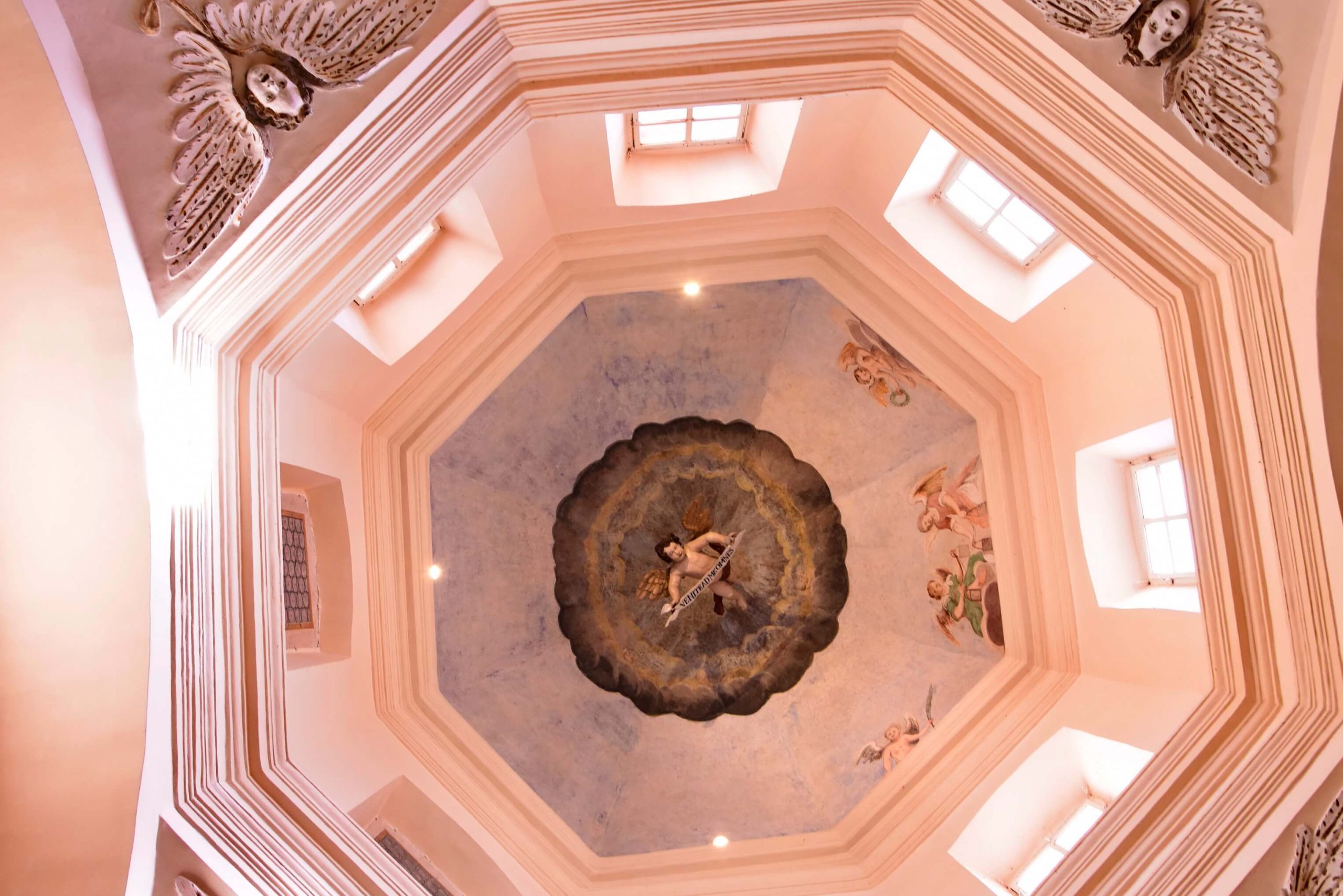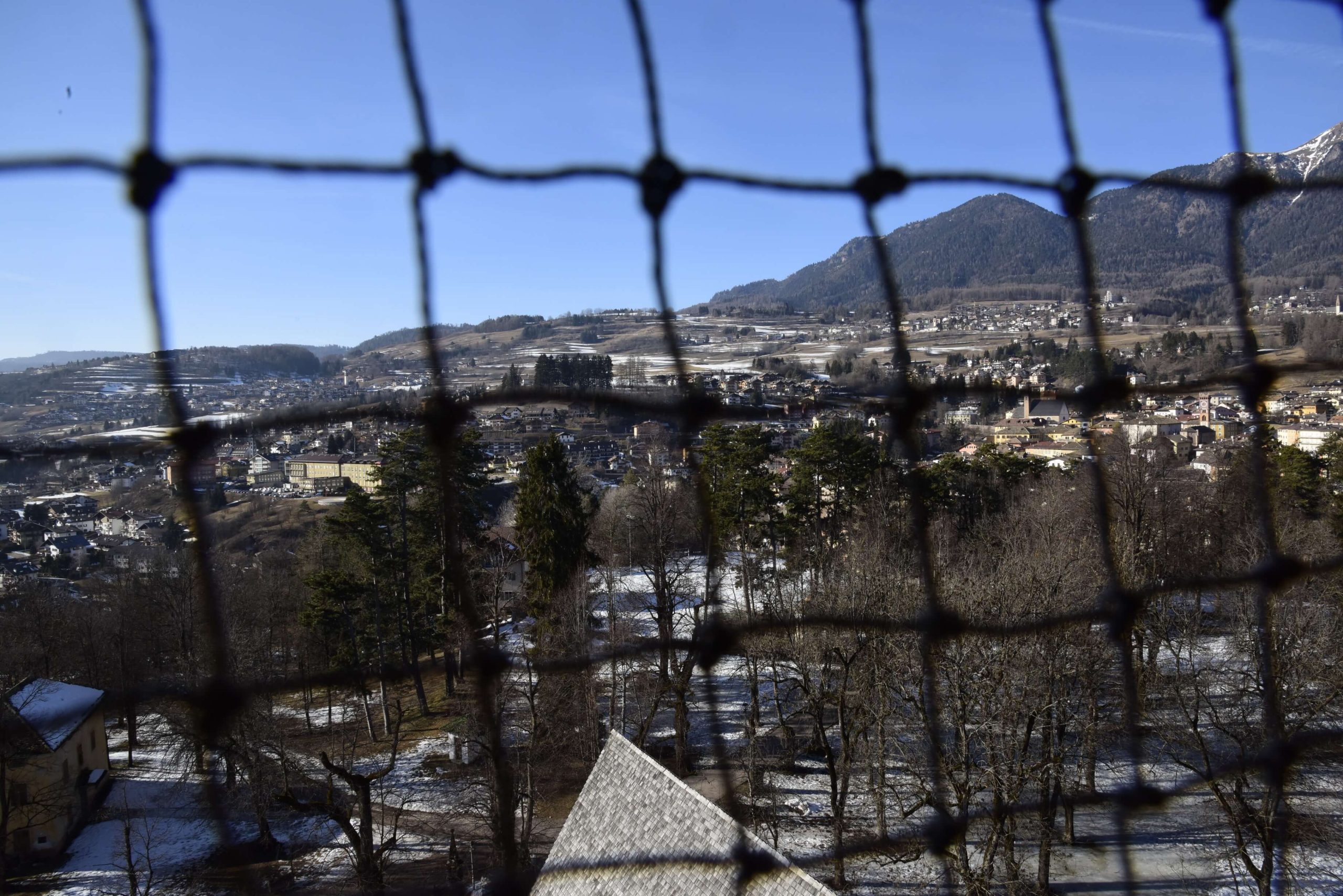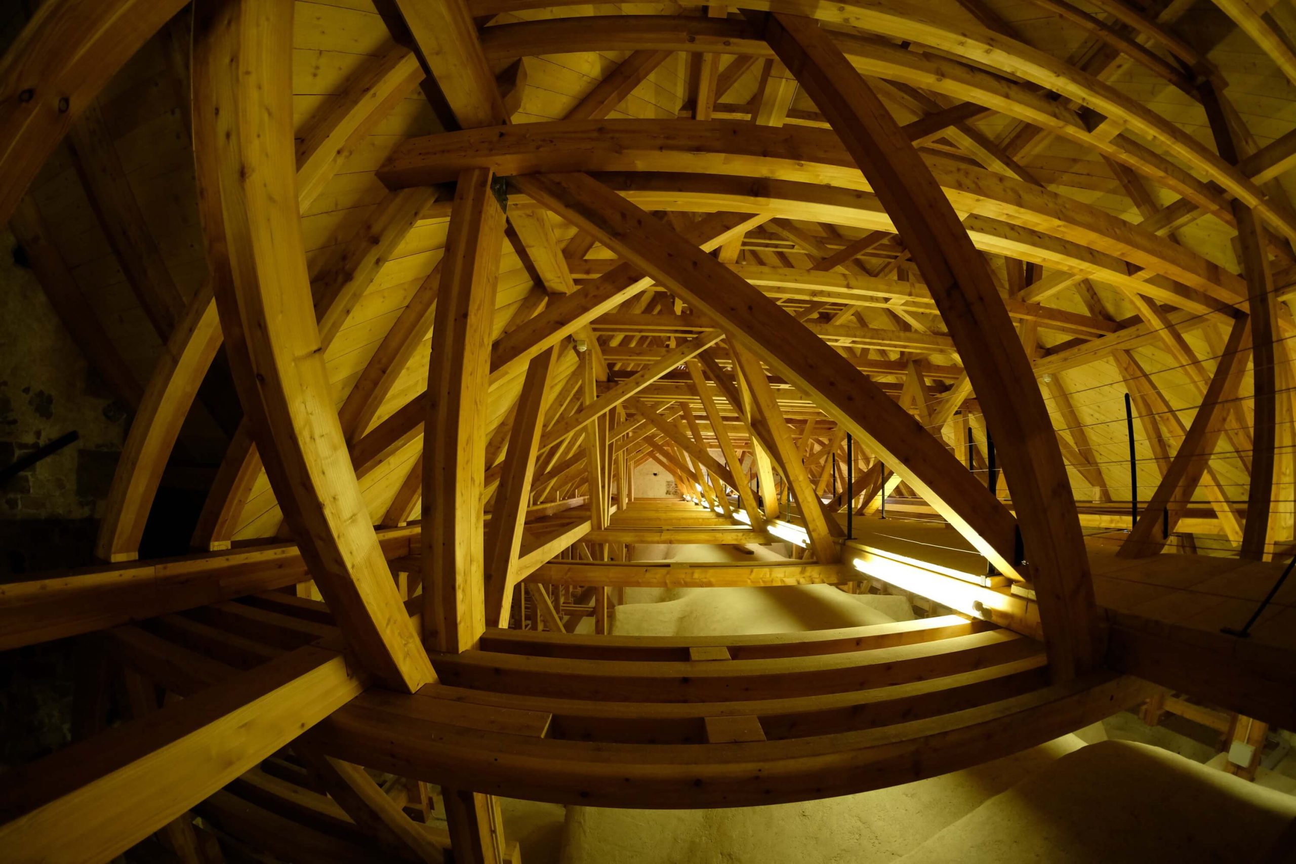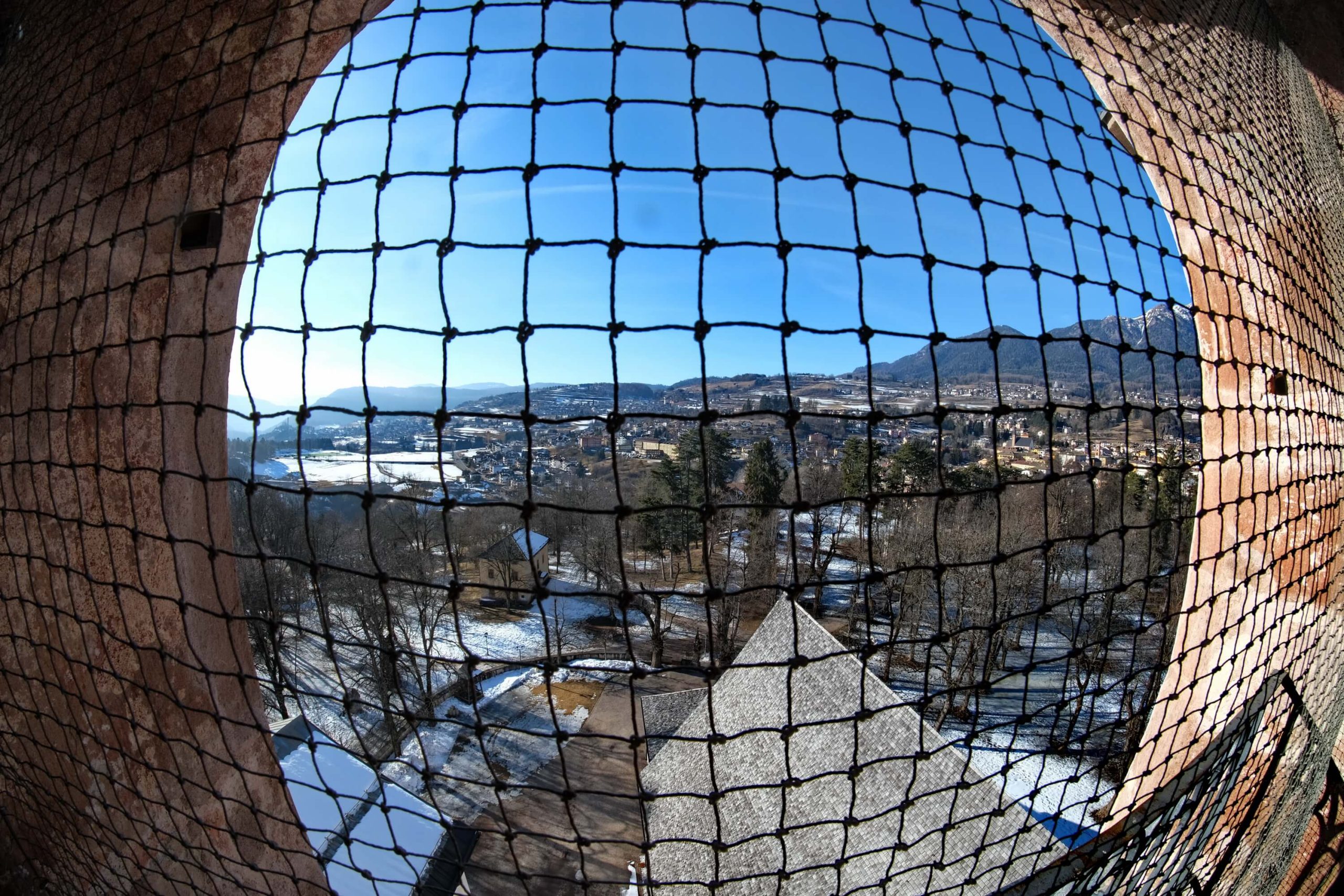 Gli alzati della struttura attuale sono quelli del XV secolo e, a testimonianza della chiusura del cantiere, sul serraglio posto in chiave alla volta troviamo un gruppo di stemmi in pietra: l’aquila di San Venceslao, stemma del Principato vescovile di Trento, quello del vescovo Giorgio Hack (1446-1465) e quello dei nobili Firmian.