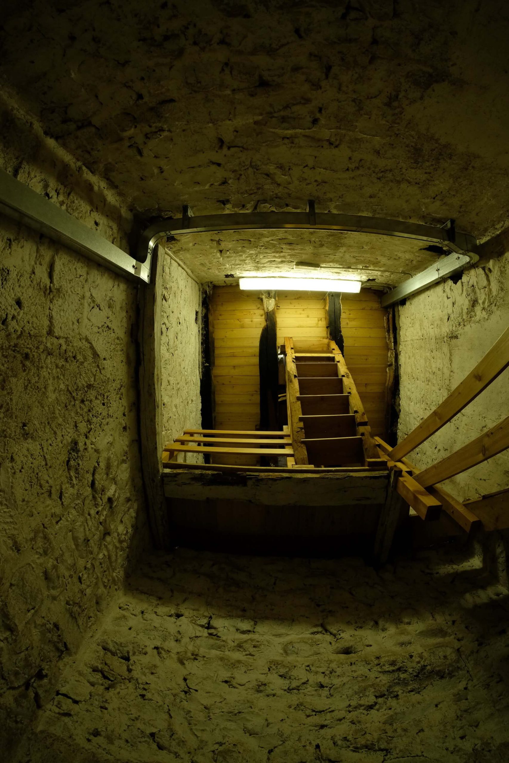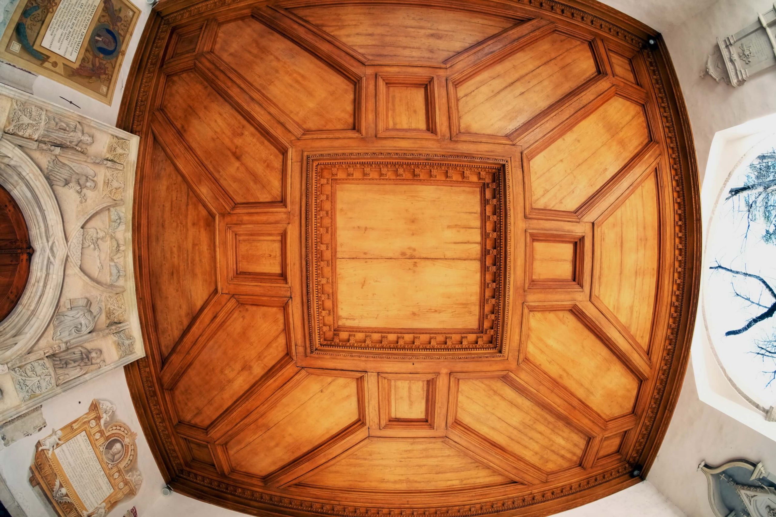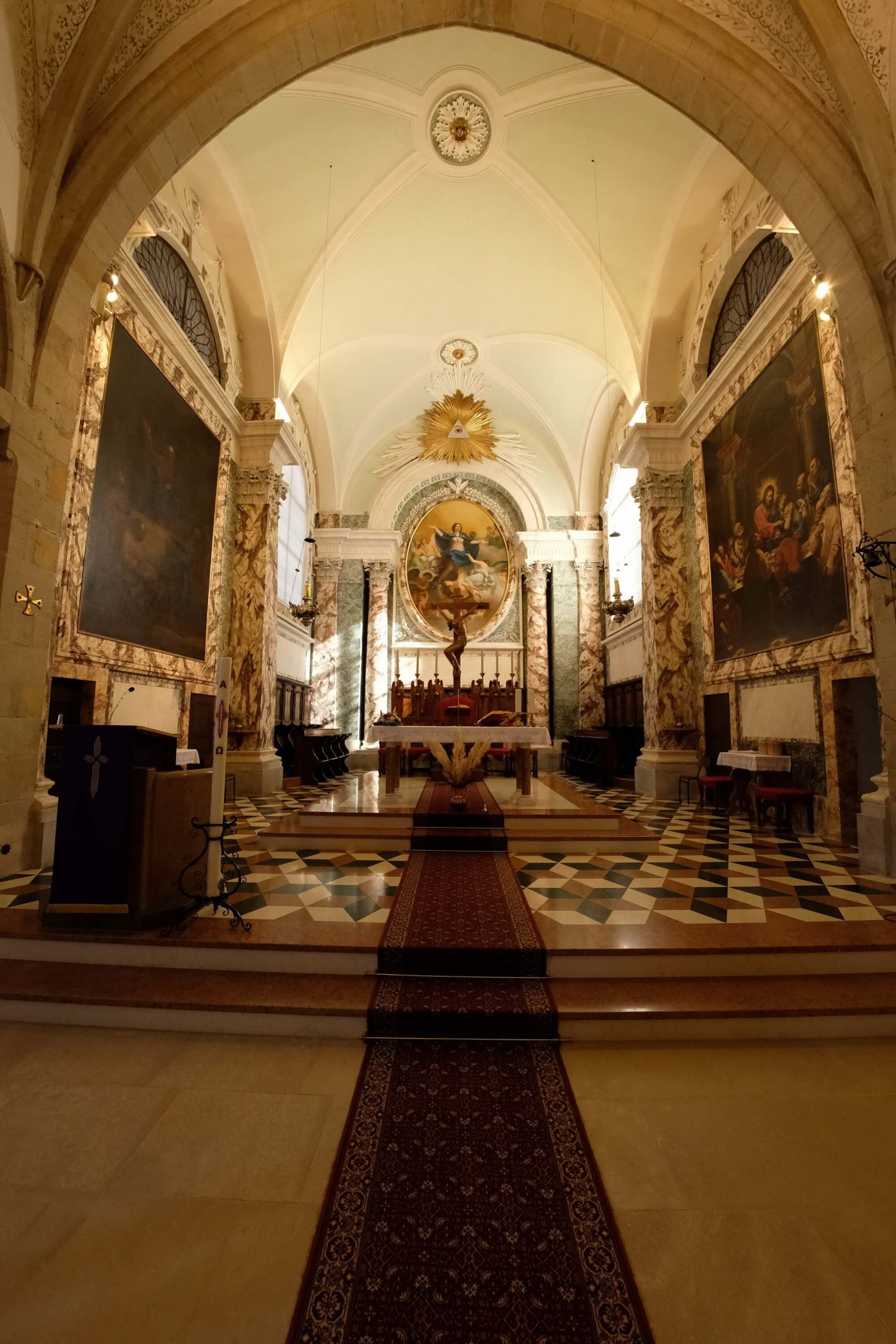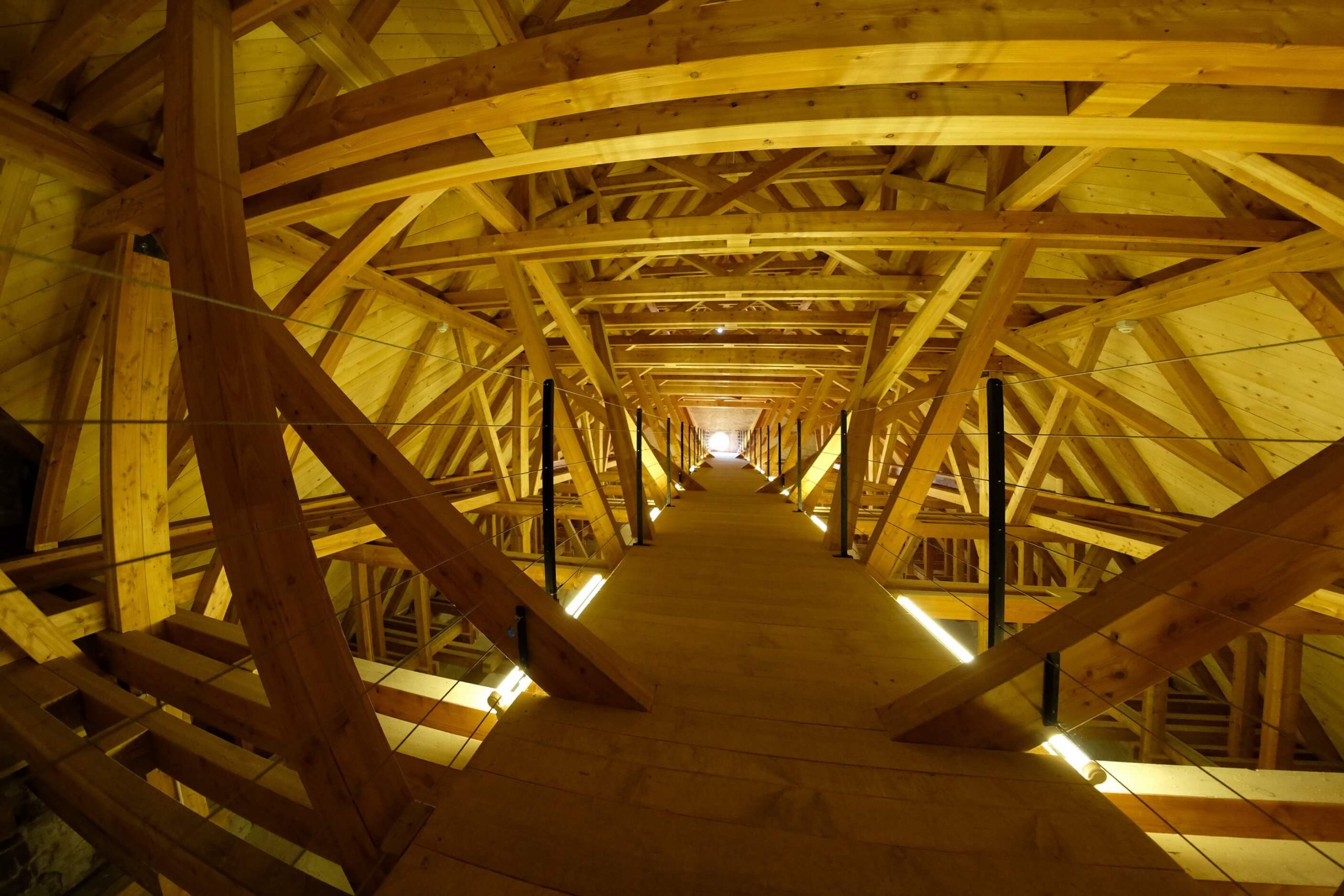 Gli alzati della struttura attuale sono quelli del XV secolo e, a testimonianza della chiusura del cantiere, sul serraglio posto in chiave alla volta troviamo un gruppo di stemmi in pietra: l’aquila di San Venceslao, stemma del Principato vescovile di Trento, quello del vescovo Giorgio Hack (1446-1465) e quello dei nobili Firmian.