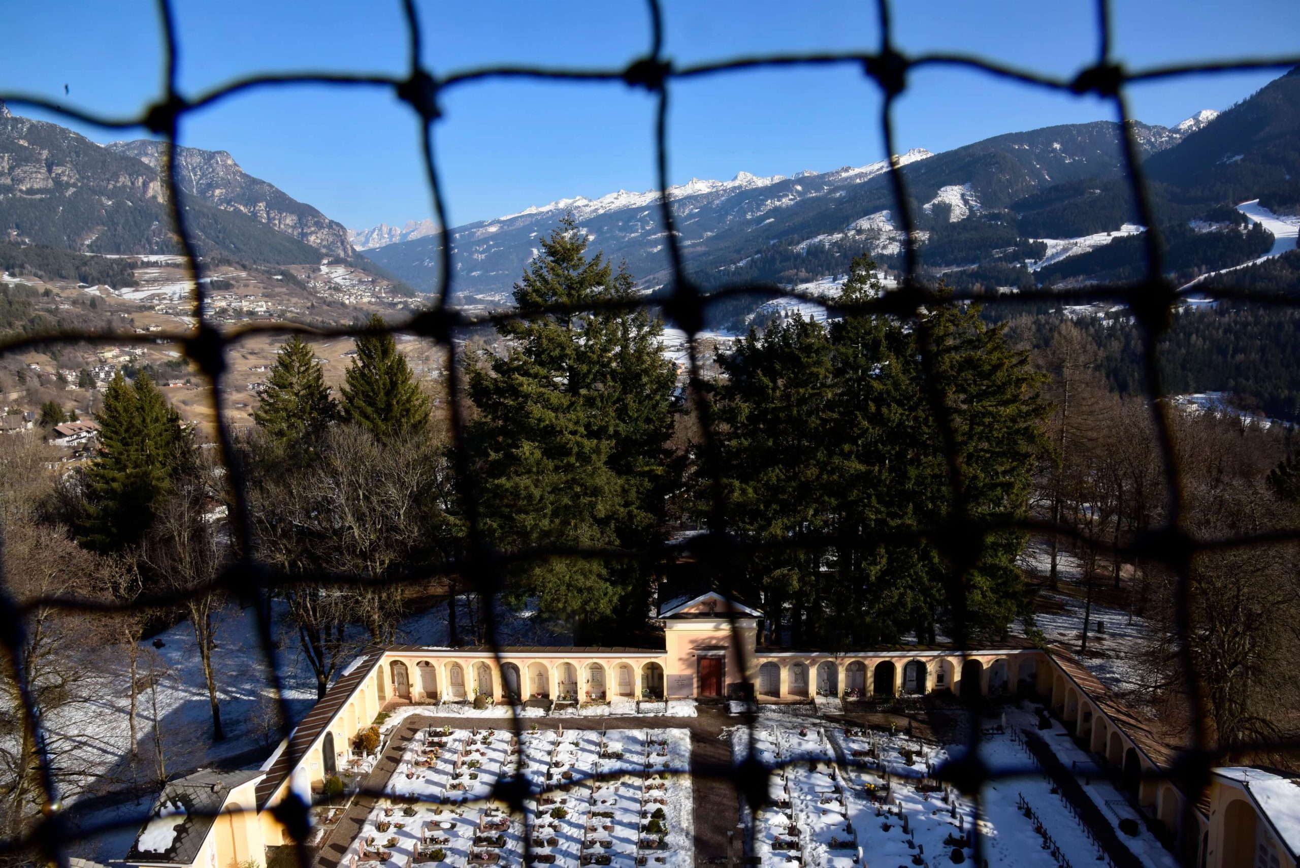Esternamente l’atrio, così come lo vediamo, risale al 1602 su grande ampliamento di quello antico, ancora leggibile sul prospetto del portale d’ingresso. Le venti pietre tombali furono poste nel 1776 per ospitare le spoglie di personaggi illustri di Fiemme.