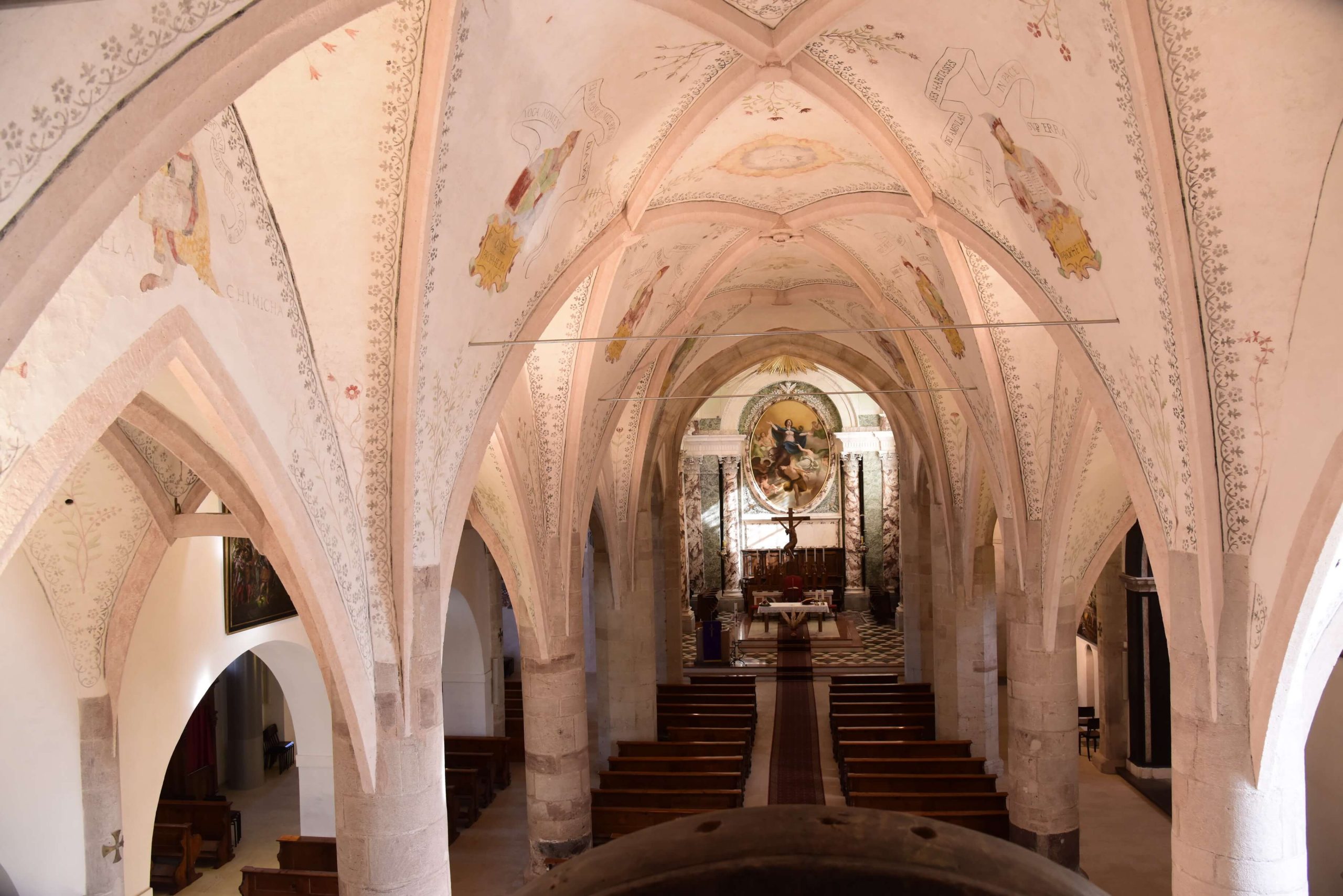 La chiesa è suddivisa in tre navate con voltatura costolonata a racchiudere un ciclo di tempere riscoperte durante i lavori di restauro e risalenti alle metà del XVI secolo; una quarta navata nasce come prolungamento della preesistente cappella Baldessari, eretta all’inizio del XVII secolo a fianco della cappella del Rosario. Quest’ultima a metà Seicento venne innalzata e decorata con affreschi, stucchi e quadri in stile barocco per iniziativa dell’arciprete Giovanni Giacomo Calavino.