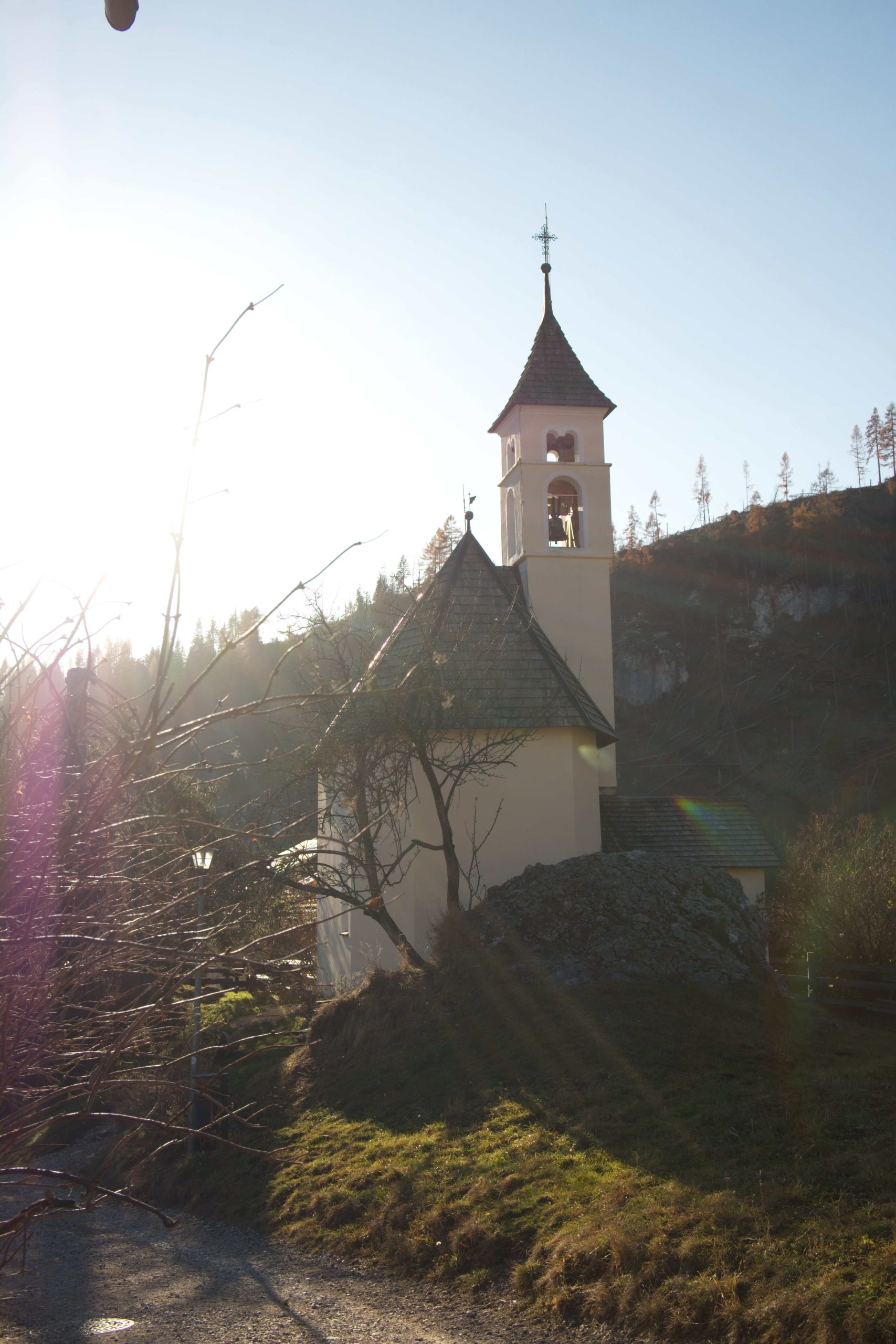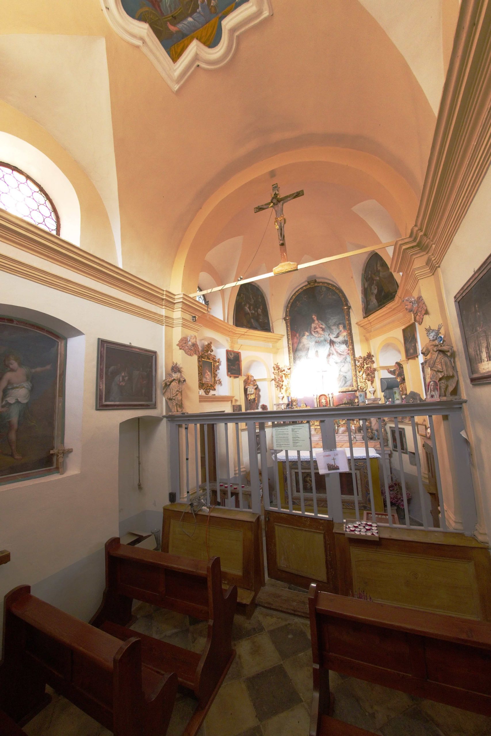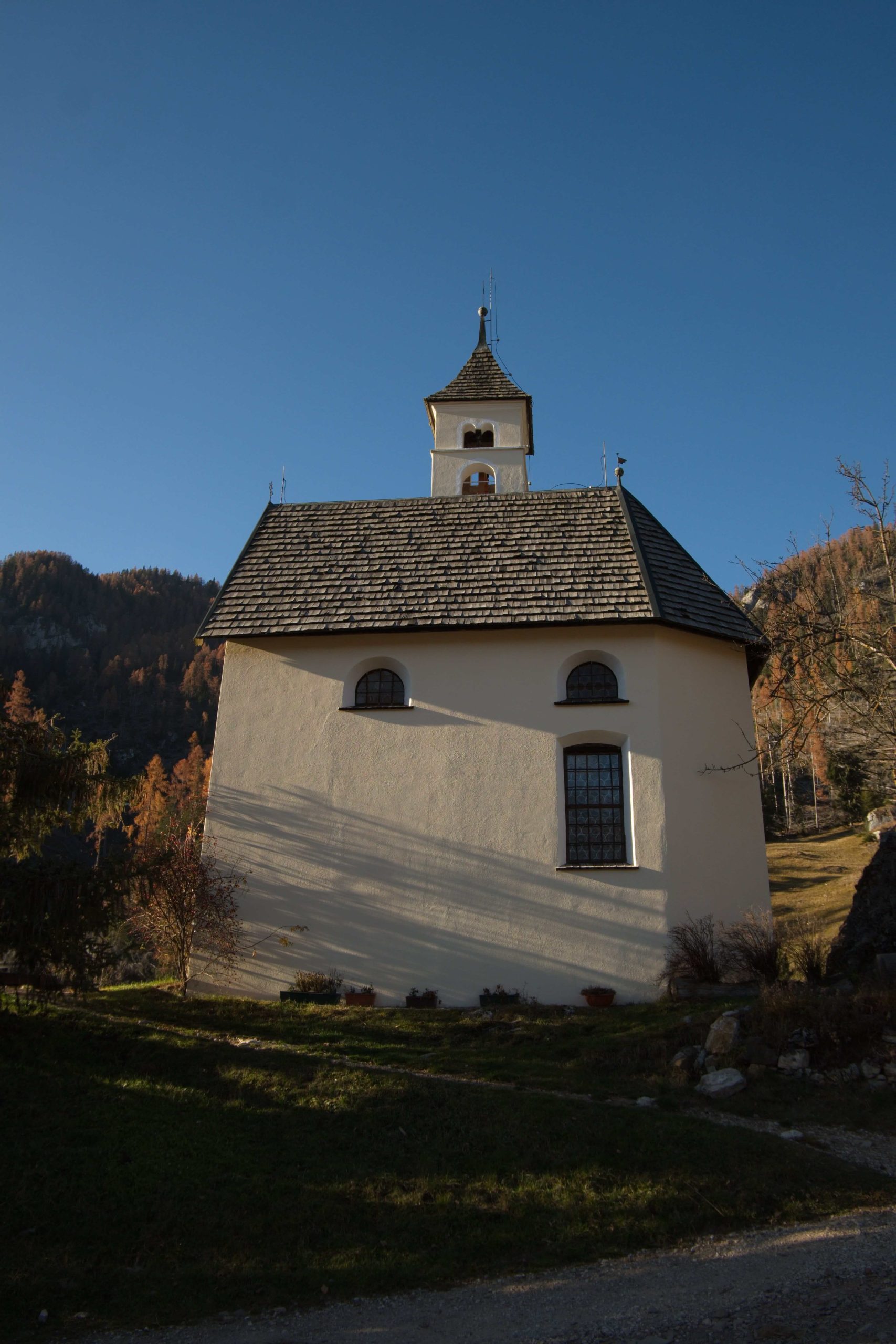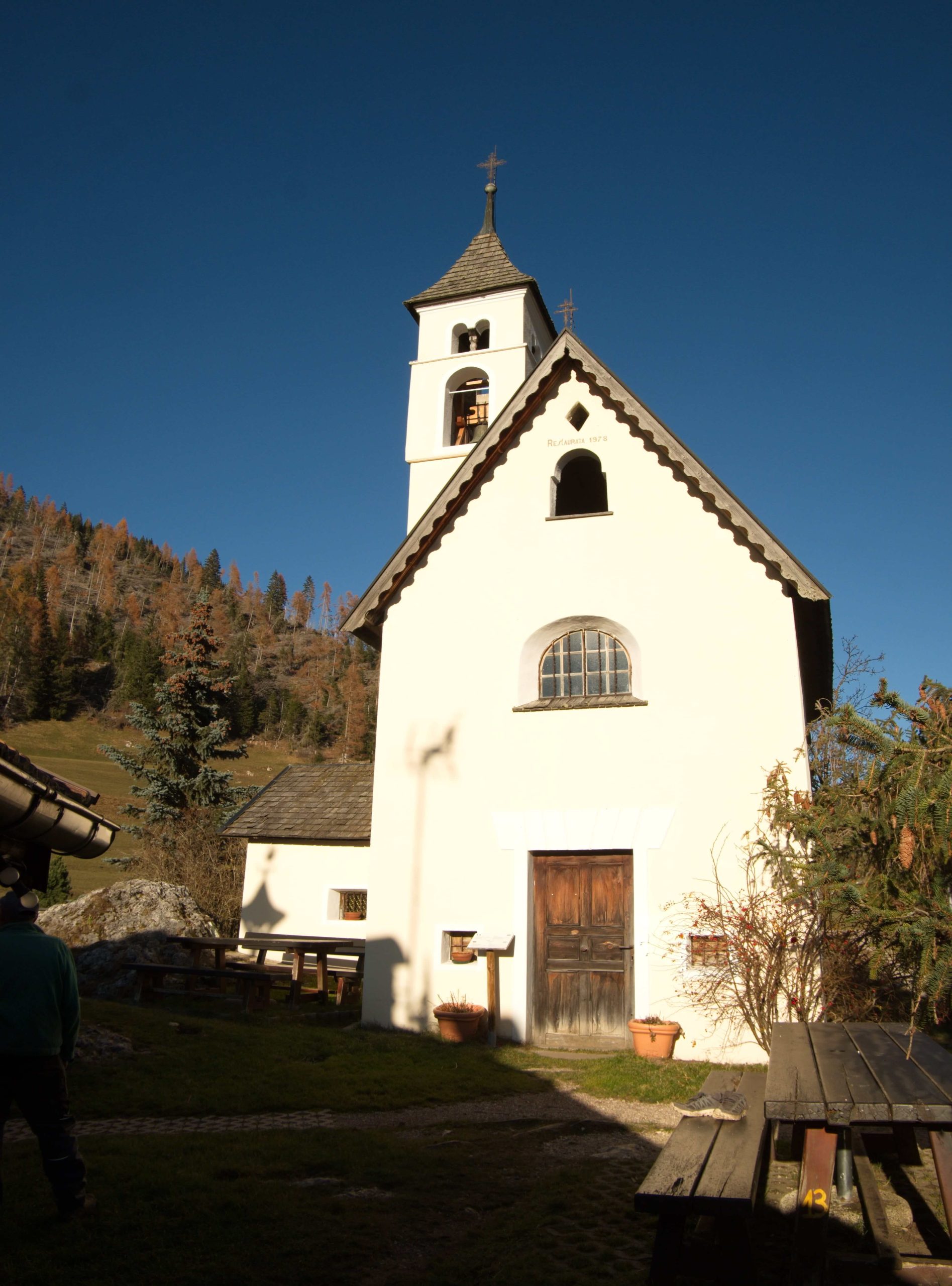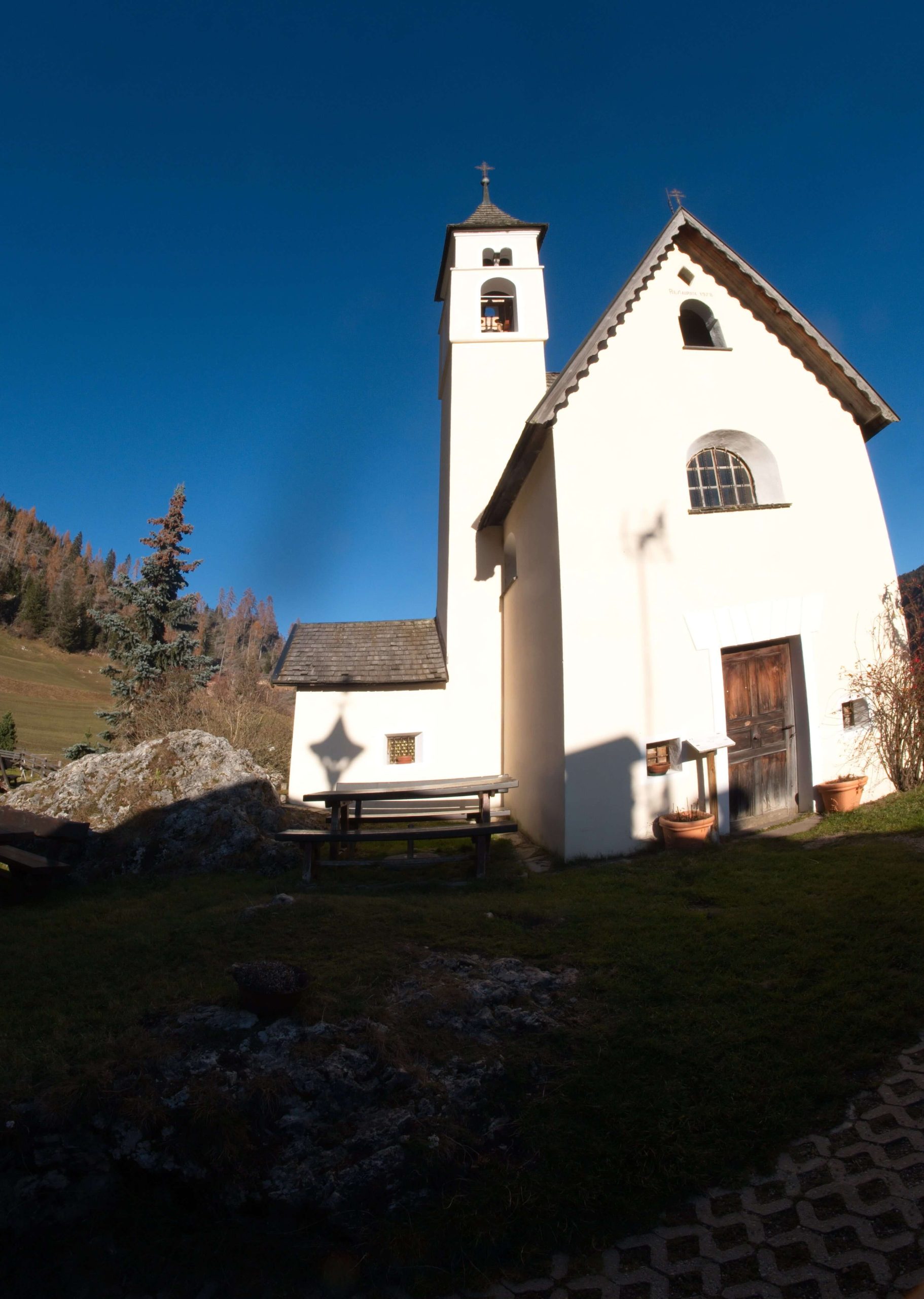 Per arrivare, bisogna prendere la via che da Moena sale a Sorte e poi proseguire lungo la strada panoramica che costeggia in quota il fondovalle verso Forno. Curva dopo curva, il paesaggio si allarga e spunta tra un gruppo di case il campanile della chiesa. La chiesa fu costruita tra il 1729 e il 1732, su iniziativa congiunta della famiglia Donei e del prete e pittore Martino Gabrielli (anche autore della gran parte delle opere pittoriche custodite nella chiesa), che da tempo aveva posto in questa zona isolata la propria residenza, come ex voto per lo scampato pericolo di un’alluvione.