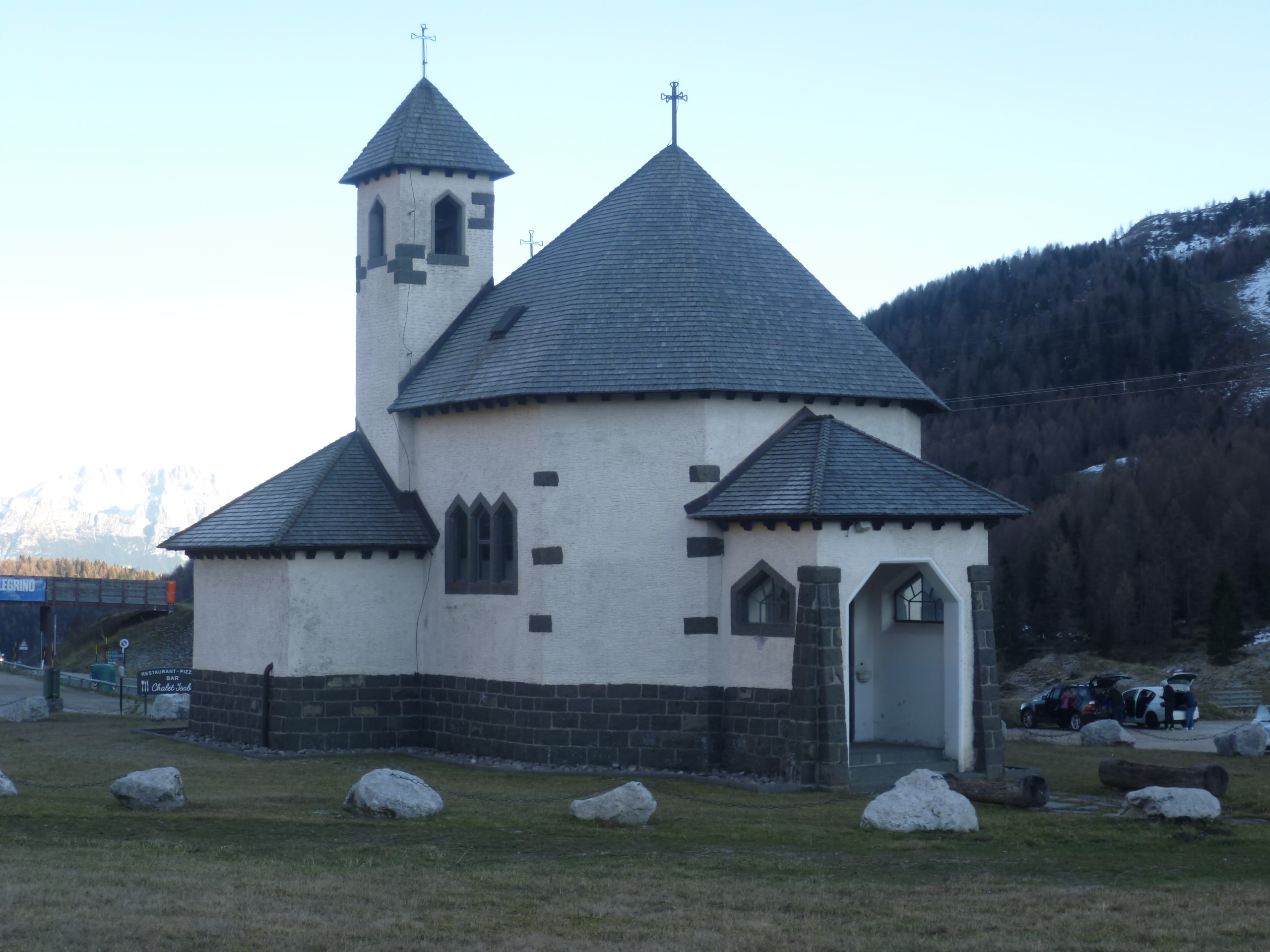 Nel 1358 la regola di Moena fondò sul passo un ospizio con annessa una chiesa, la cui gestione fu inizialmente affidata ai frati dell’ordine di San Pellegrino. Rimasto in funzione per molti secoli, il complesso assistenziale fu dato alle fiamme e distrutto durante il primo conflitto mondiale (24 maggio 1915). L’attuale edificio fu costruito nel 1934, in sostituzione della chiesa medievale, andata distrutta, che sorgeva in un luogo poco distante, e venne intitolata a Sant’Antonio Abate del deserto.