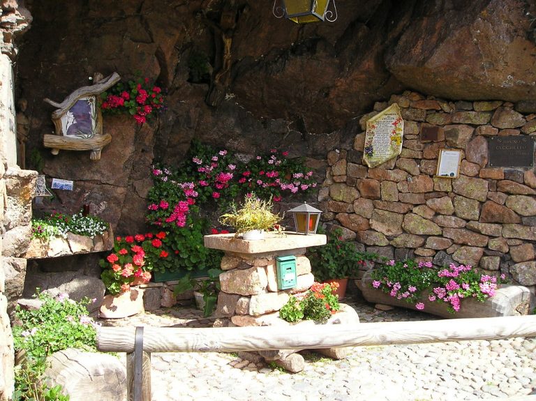 La grotta fu allestita nel 1976 per iniziativa dell’associazione Fanti in congedo della Val di Fiemme in memoria dei Caduti di tutte le guerre. Questo luogo custodisce un crocifisso (Marco Corradini), una Madonna in rame (Casagrande da Pergine) e una statua di sant’Antonio da Padova (Ernst Franzelin).