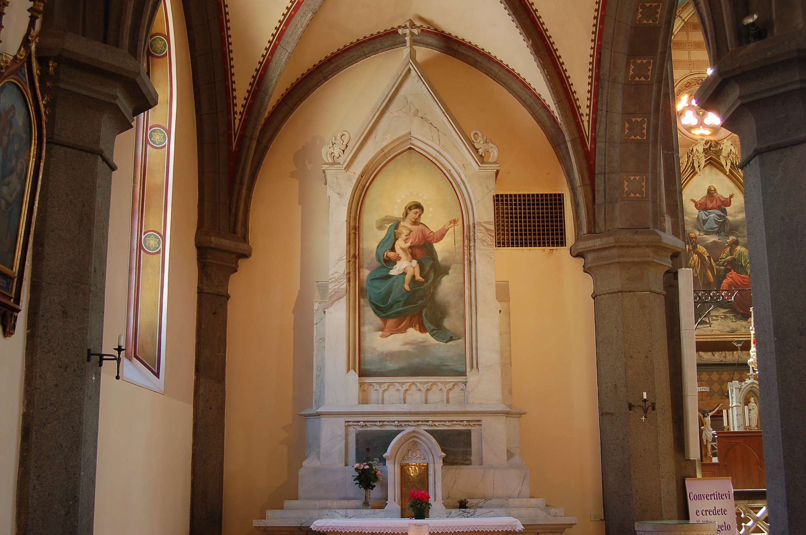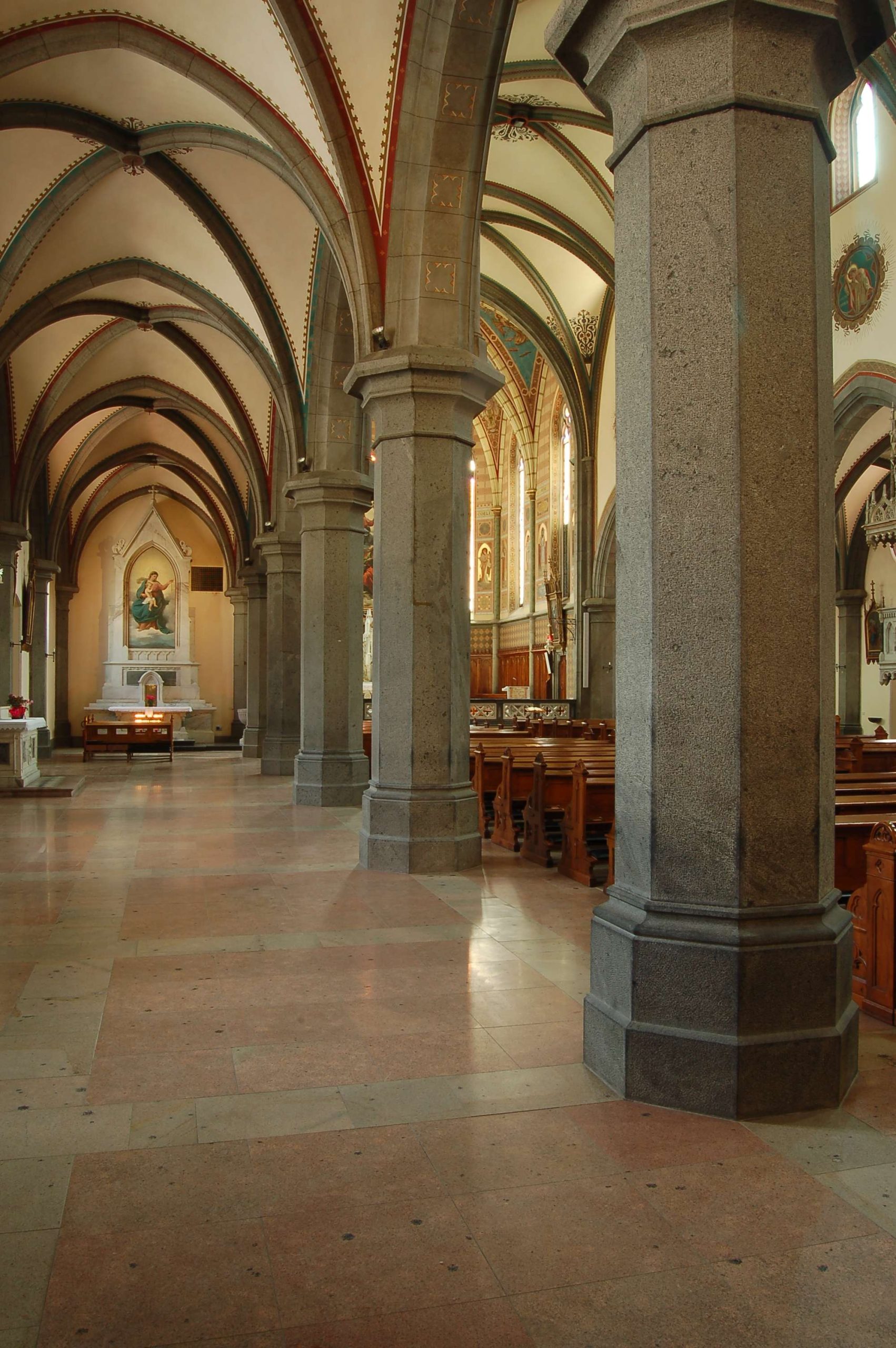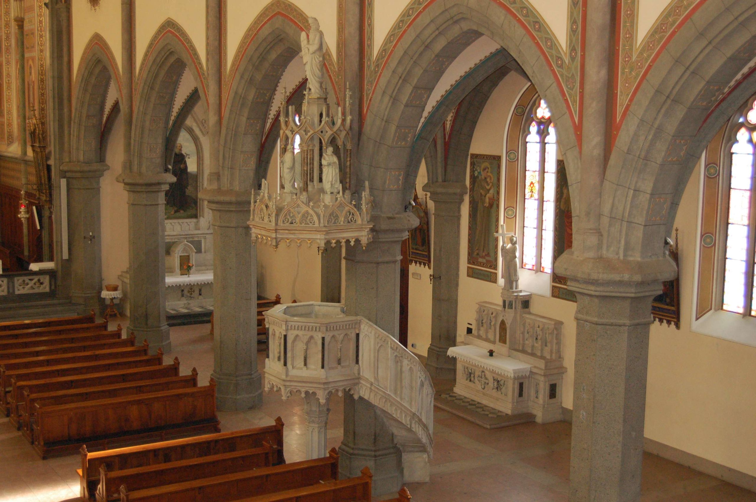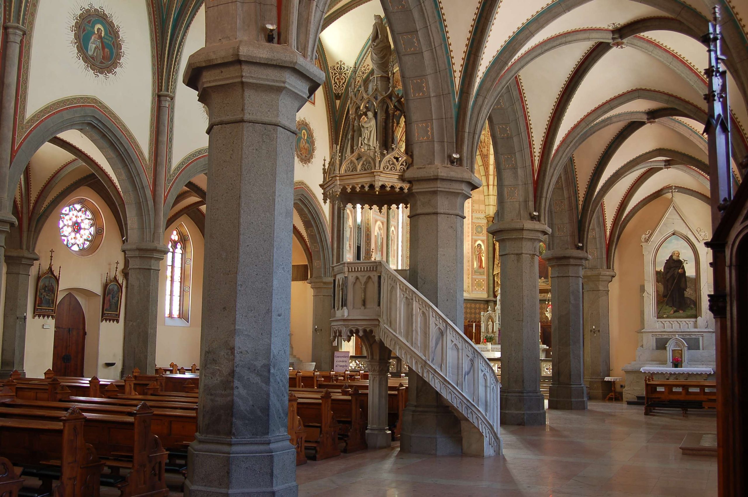 La chiesa ha una facciata a salienti con corpo centrale eminente, tripartito da contrafforti in pietra a vista; nel settore centrale si dispongono in asse il portale maggiore a sesto acuto, tre nicchie abitate da statue e un’ampia trifora gotica. I corpi laterali, arretrati, presentano ciascuno un portale a luce ogivale sormontato da un rosone a dodici lobi. Alla sommità della facciata si innesta la torre campanaria, caratterizzata da contrafforti angolari, la cui cella è forata da ampie bifore archiacute cimate da quadranti di orologio. La cuspide ottagonale in muratura presenta quattro timpani cimati da vasi acroteriali, forati da bifore; la decorazione è completata da pinnacoli disposti in angolo. Le fiancate a gradoni, articolate simmetricamente, sono ritmate su entrambi i livelli da contrafforti in pietra a vista, tra i quali si aprono bifore (livello inferiore) e monofore (livello superiore) archiacute. Due accessi laterali sormontati da rosoni si dispongono in corrispondenza della quinta campata. La successione dei contrafforti continua sul corpo del presbiterio/abside, ai lati del quale emergono le strutture della sacrestia e di un ambiente adibito a deposito. L’interno si sviluppa a tre navate di sei campate, ripartite da arcate a sesto acuto poggianti su pilastri ottagonali e voltate a crociera a costoloni. Il presbiterio, rialzato su quattro gradini e delimitato da una balaustra neogotica, è introdotto dall’arco santo archiacuto e si conclude in un’abside poligonale.
