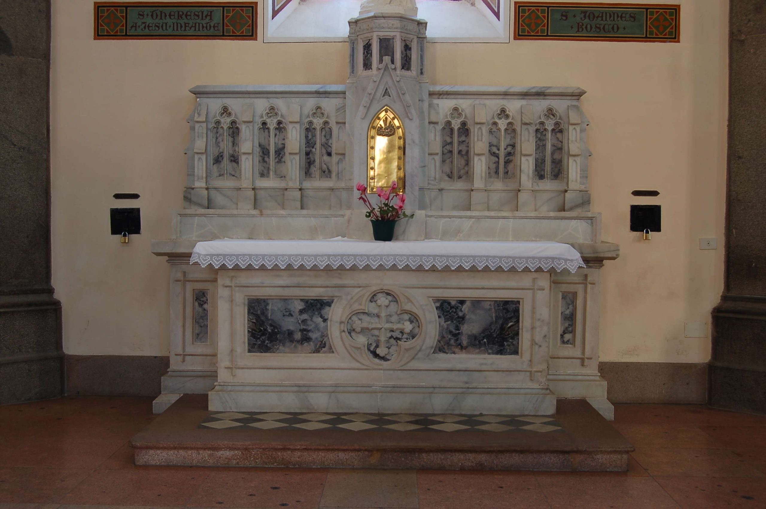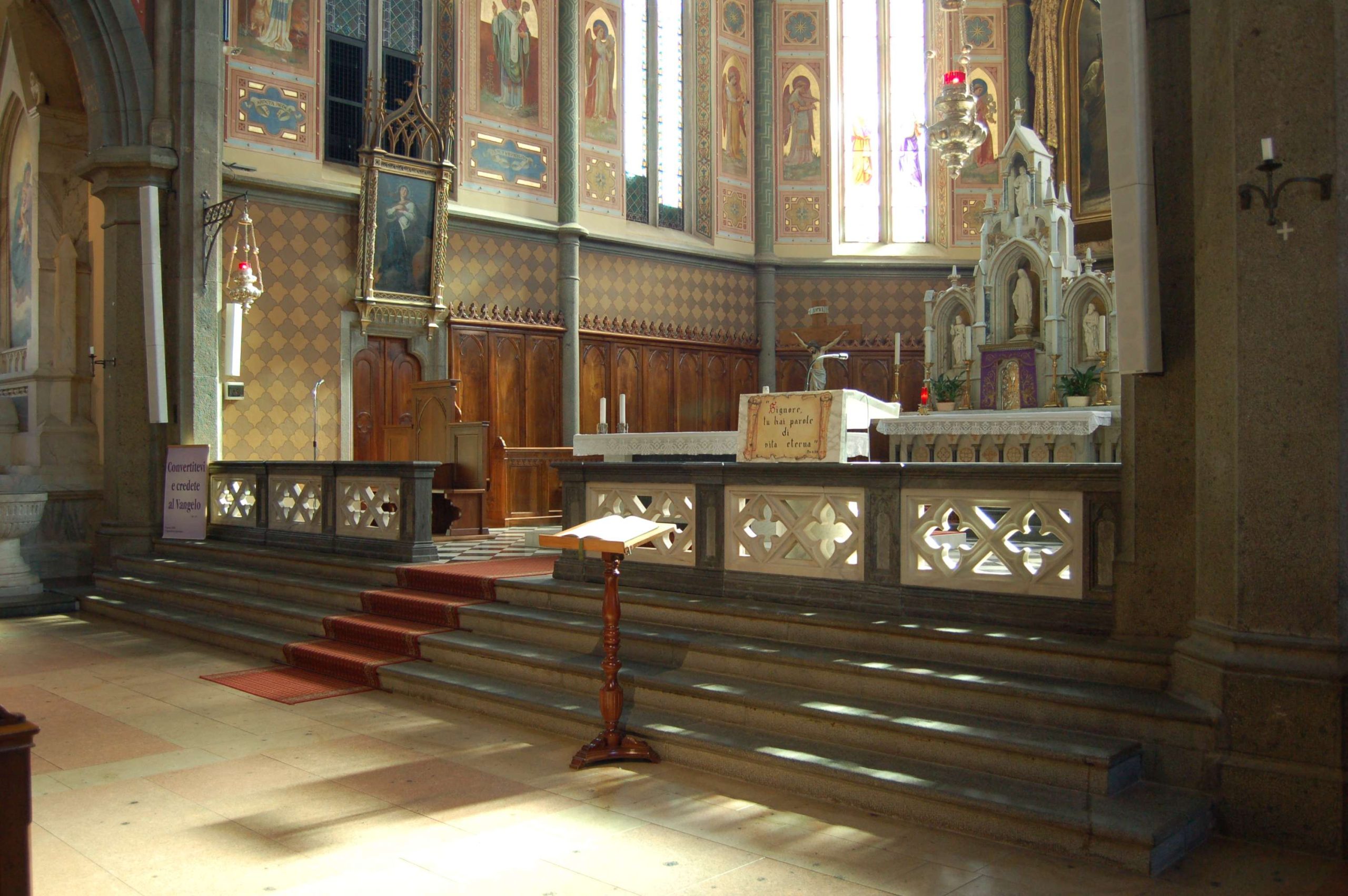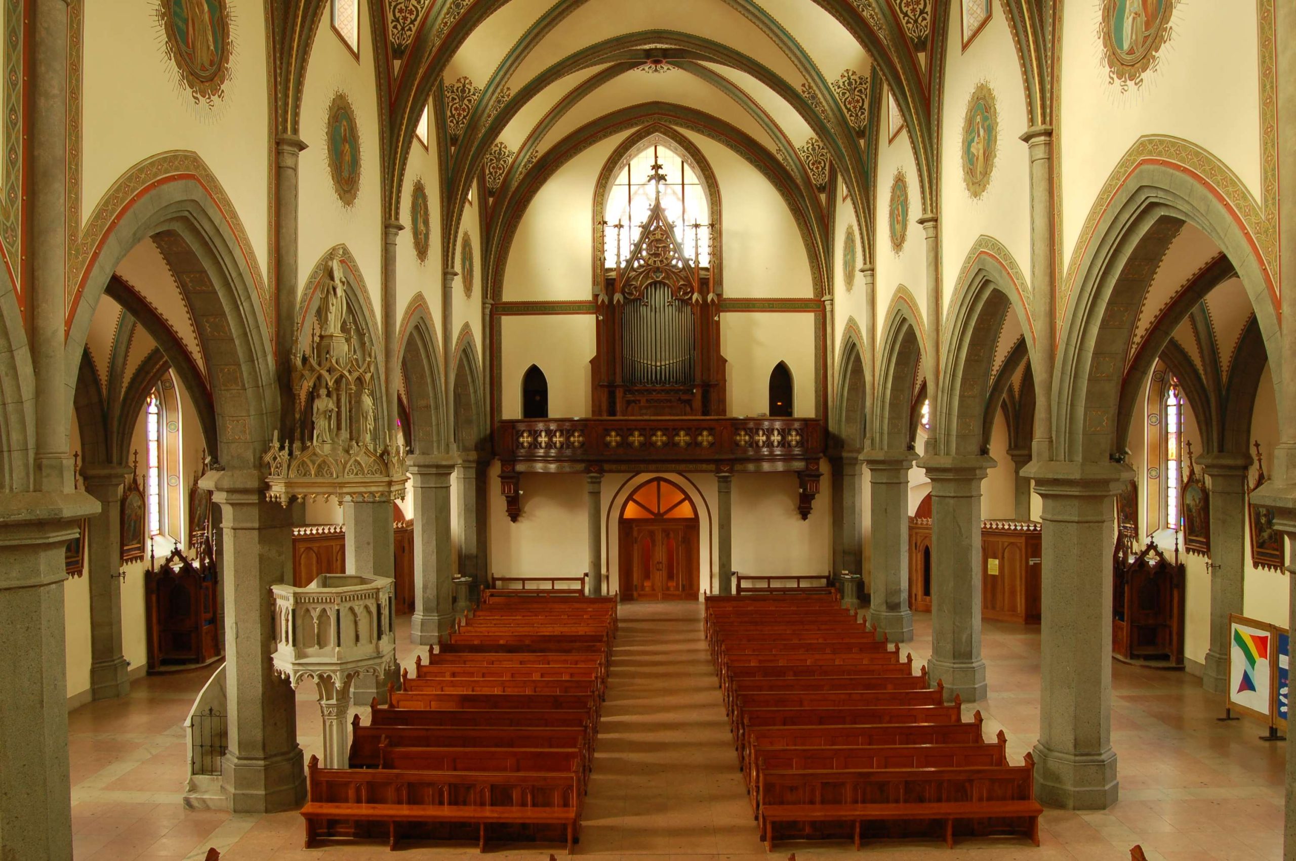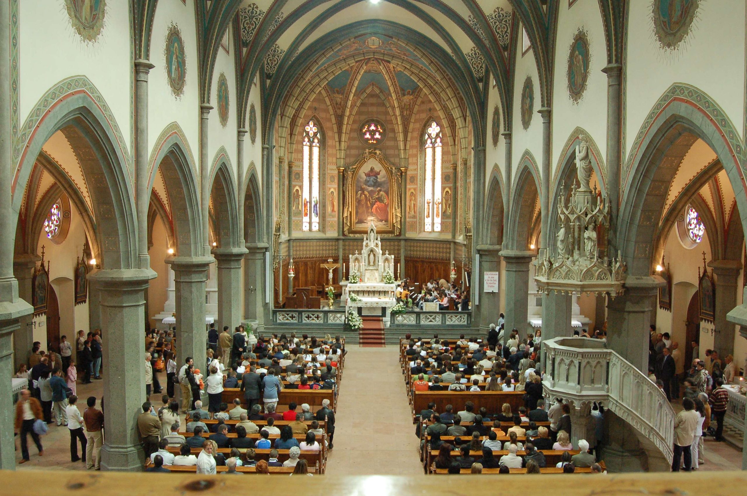 La chiesa ha una facciata a salienti con corpo centrale eminente, tripartito da contrafforti in pietra a vista; nel settore centrale si dispongono in asse il portale maggiore a sesto acuto, tre nicchie abitate da statue e un’ampia trifora gotica. I corpi laterali, arretrati, presentano ciascuno un portale a luce ogivale sormontato da un rosone a dodici lobi. Alla sommità della facciata si innesta la torre campanaria, caratterizzata da contrafforti angolari, la cui cella è forata da ampie bifore archiacute cimate da quadranti di orologio. La cuspide ottagonale in muratura presenta quattro timpani cimati da vasi acroteriali, forati da bifore; la decorazione è completata da pinnacoli disposti in angolo. Le fiancate a gradoni, articolate simmetricamente, sono ritmate su entrambi i livelli da contrafforti in pietra a vista, tra i quali si aprono bifore (livello inferiore) e monofore (livello superiore) archiacute. Due accessi laterali sormontati da rosoni si dispongono in corrispondenza della quinta campata. La successione dei contrafforti continua sul corpo del presbiterio/abside, ai lati del quale emergono le strutture della sacrestia e di un ambiente adibito a deposito. L’interno si sviluppa a tre navate di sei campate, ripartite da arcate a sesto acuto poggianti su pilastri ottagonali e voltate a crociera a costoloni. Il presbiterio, rialzato su quattro gradini e delimitato da una balaustra neogotica, è introdotto dall’arco santo archiacuto e si conclude in un’abside poligonale.