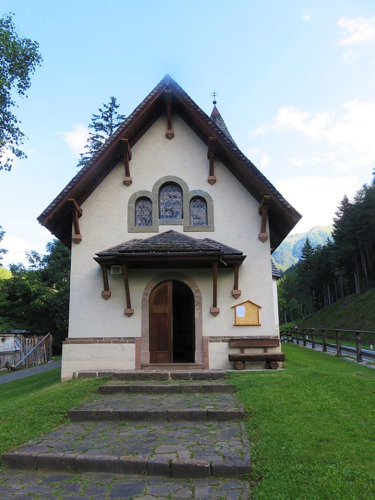 La chiesa dell’Addolorata sorge lungo la strada che congiunge il paese di Tesero alla frazione di Stava, tristemente nota per la tragedia che la investì il 19 luglio 1985 e che costò la vita a 268 persone. L’edificio, orientato a nord, è il risultato di una serie di ampliamenti venuti a modificare sia l’aspetto sia l’orientamento di una prima chiesetta costruita nel 1819 con abside a est, alla quale furono annessi inizialmente il presbiterio poligonale (1842) e poi le strutture della sacrestia e del campanile (1872). L’intervento più significativo fu senz’altro quello effettuato nel 1934-1936, quando su progetto di Giovanni Tiella, modificato da Alessio Delmarco, il tempio fu ulteriormente ingrandito con la costruzione verso sud dell’attuale navata e la riconversione della precedente struttura nel corpo del presbiterio con cappella laterale. La facciata a due spioventi è caratterizzata dall’apertura del portale centinato coperto da una tettoia lignea, oltre la quale si dispone una trifora con luce centrale sfalsata rispetto alle laterali. Le fiancate sono percorse da una zoccolatura eminente, profilata in pietra e presentano ciascuna due bifore. Il lato sinistro del presbiterio, costituente la facciata della chiesa ottocentesca, ha una fronte monocuspidale delimitata da lesene intonacate e centrata da un portale centinato sormontato da un oculo. A destra del presbiterio emerge il corpo poligonale della cappella laterale, corrispondente all’antico presbiterio, alla quale è annessa a nord la sacrestia. Su questa si erge il campanile con fusto intonacato e cella illuminata da monofore e bifore sovrapposte. L’interno si sviluppa a navata unica sormontata da un soffitto a carena di nave. Una cappella laterale chiusa da una cancellata in ferro battuto si affaccia sul lato destro del presbiterio, rialzato su due gradini.