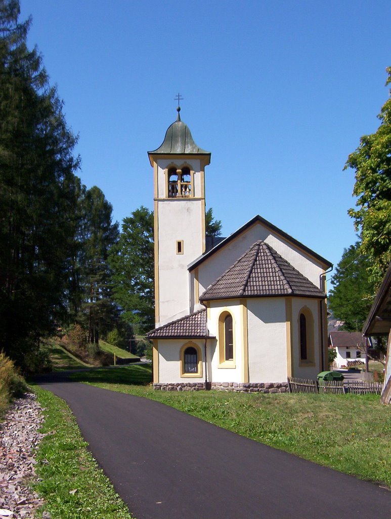 La chiesa della Madonna delle Grazie sorge lungo la via principale della frazione di Lago (Tesero), con orientamento a est. L’edificio, costruito nel 1912-1913, presenta una semplice facciata a due spioventi, caratterizzata dalle aperture del portale, al quale si affiancano due nicchie centinate, dell’oculo centrale e della finestra lunettata sommitale. Le semplici fiancate laterali sono articolate simmetricamente e recano ciascuna due ampie monofore, che si trovano ripetute anche nei lati obliqui dell’abside. Lungo il fianco destro si erge la torre campanaria con cella a quattro bifore e copertura a campana. L’arco santo a sesto ribassato raccorda la navata unica coperta da un soffitto a cassettoni al presbiterio, che è rialzato su un gradino.