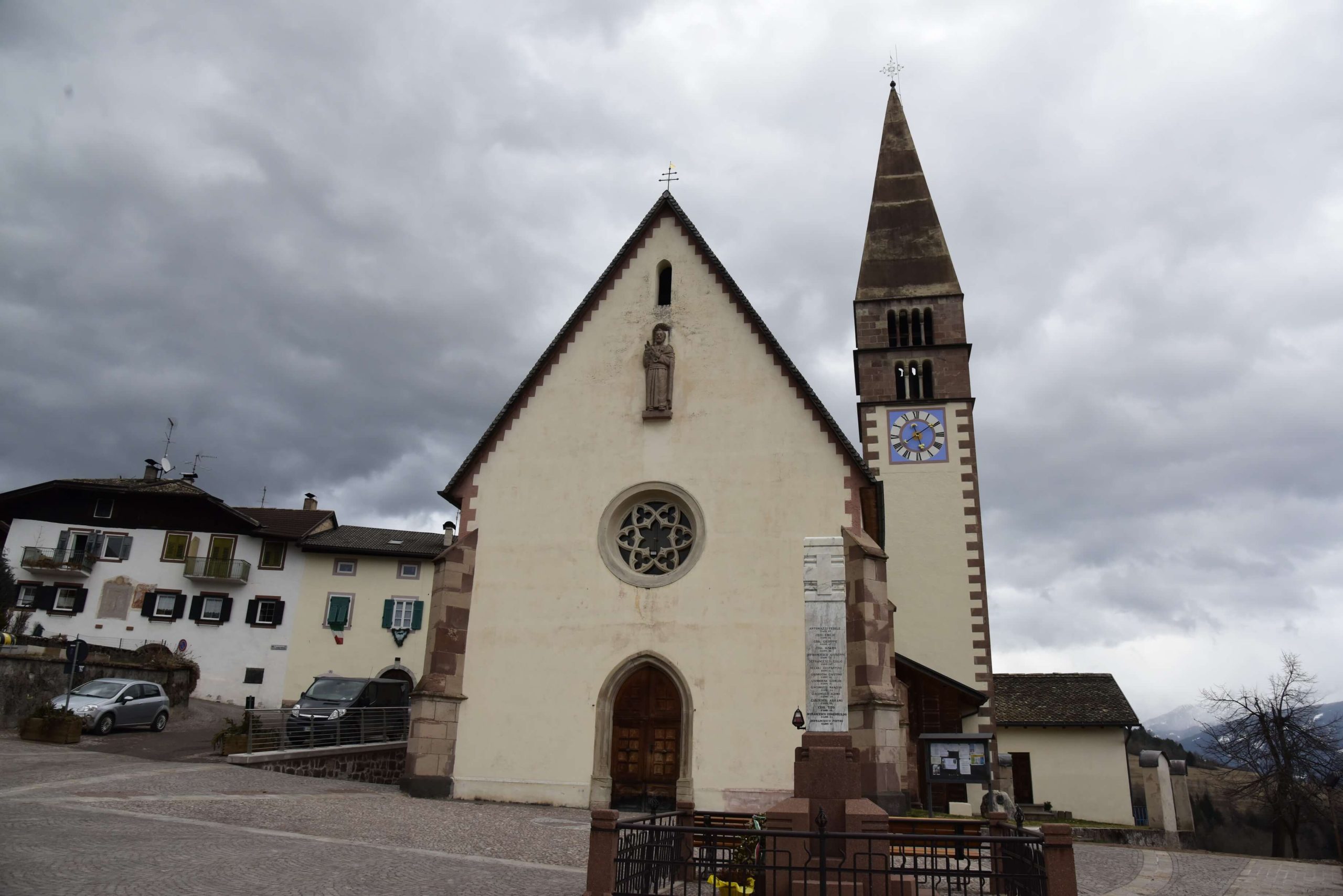 La facciata principale si presenta liscia con tetto a capanna di accentuata pendenza in standole di larice, mentre il campanile, oggetto di recenti restauri è posizionato sul fianco a meridione; la facciata presenta un classico allineamento con il portale ogivale in pietra arenaria modanata, di cui vecchie fotografie mostrano una decorazione pittorica di tipo neogotico, la statua del santo protettore, opera di Francesco Degregorio, collocata in una nicchia con tamponatura di epoca recente in allineamento con il rosone traforato che porta la luce all’interno e ne scandisce con l’allineamento la simmetria di facciata.