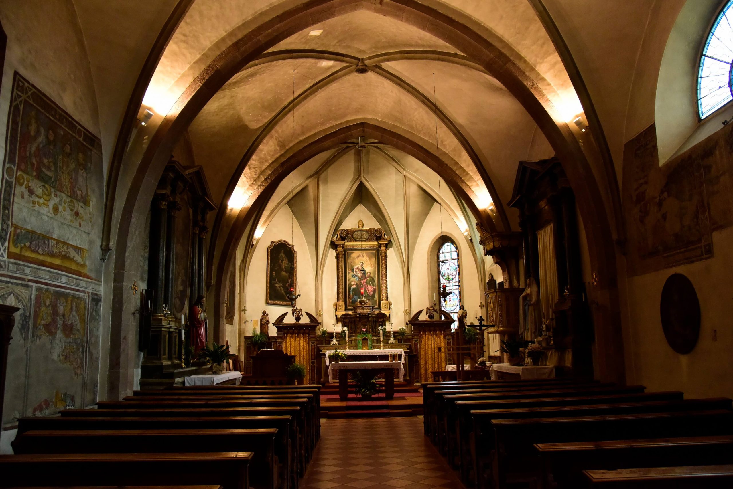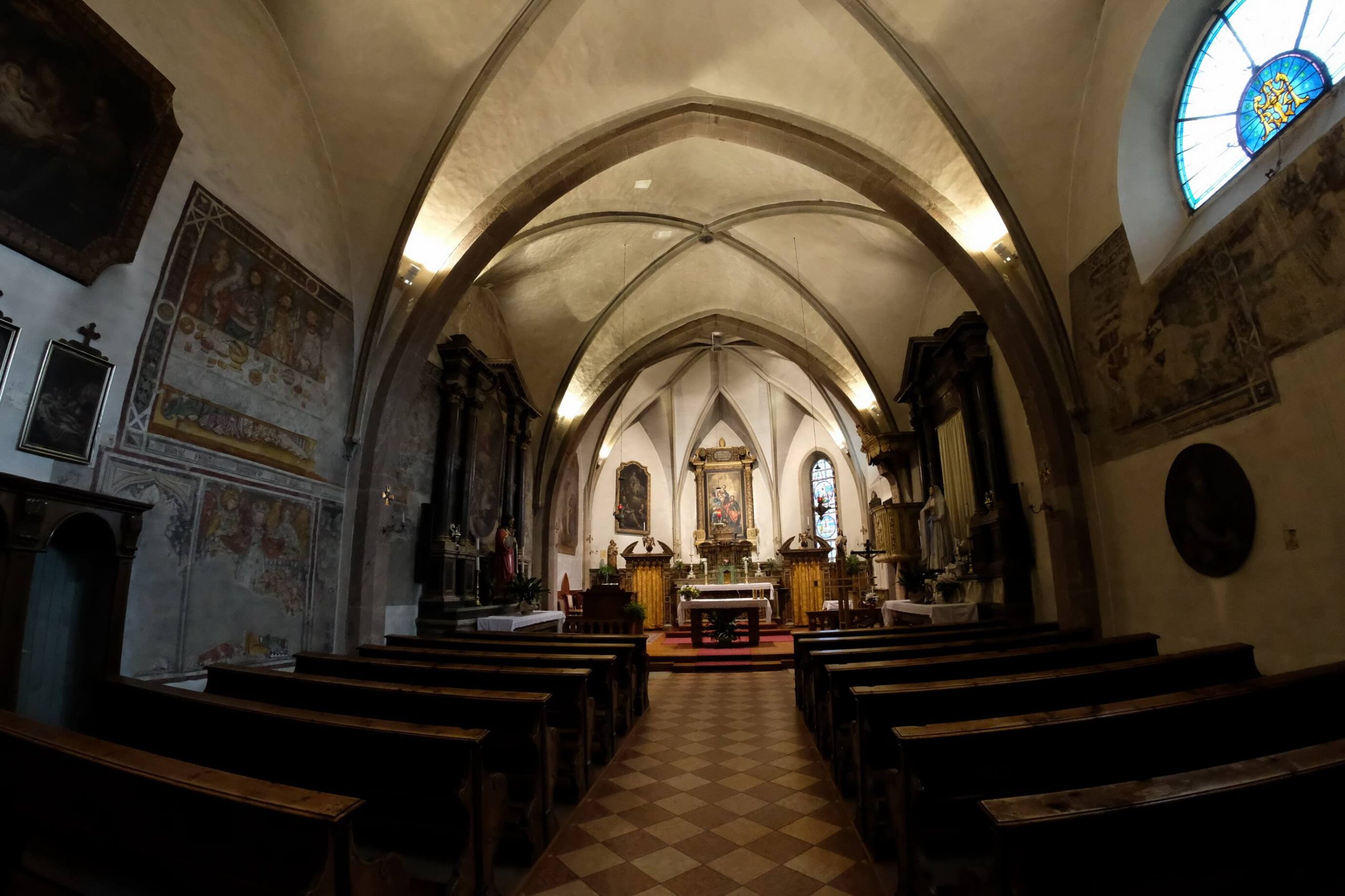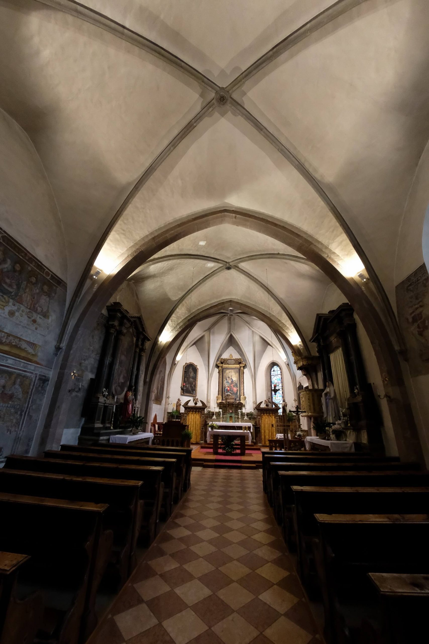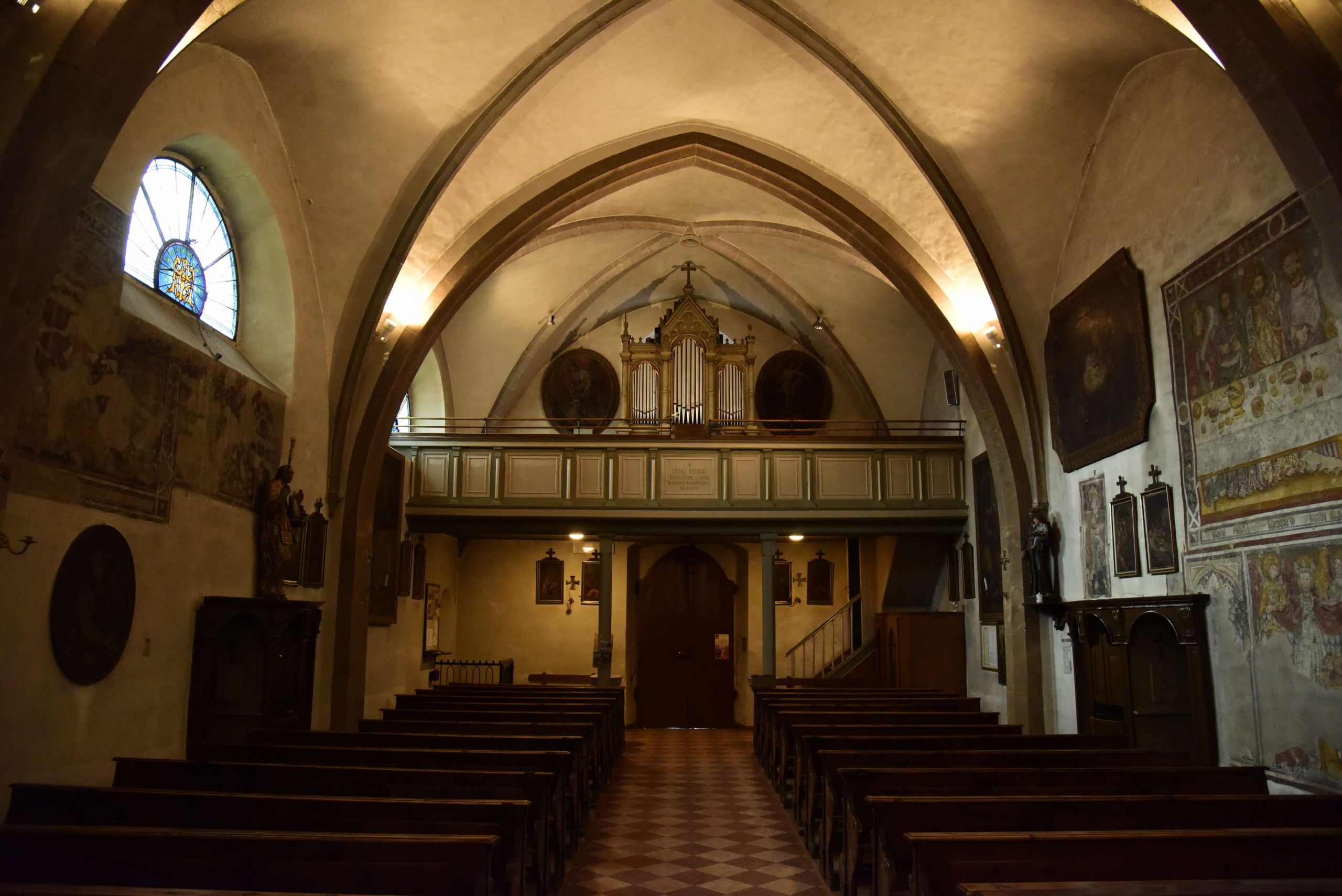 Le campate sono separate da archi a sesto acuto in conci di porfido bocciardato, smussato ed impostato senza soluzione di continuità sui piedritti formando così delle volte a crociera. Un altro motivo visibile dell’ampliamento della chiesa e dei rimaneggiamenti subiti nei secoli sono i lacerti dipinti ad affresco, che nella seconda e terza campata stanno ad evidenziare l’impostazione dell’aula come unico ambiante affrescato, interrotto dal ritto dell’arco di volta presumibilmente introdotto nel 1528; sul lato sinistro, oltre ad altri elementi decorativi di tipo votivo come S.Martino o S.Michele, anche se interrotta è chiaramente visibile la rappresentazione dell’Ultima Cena.