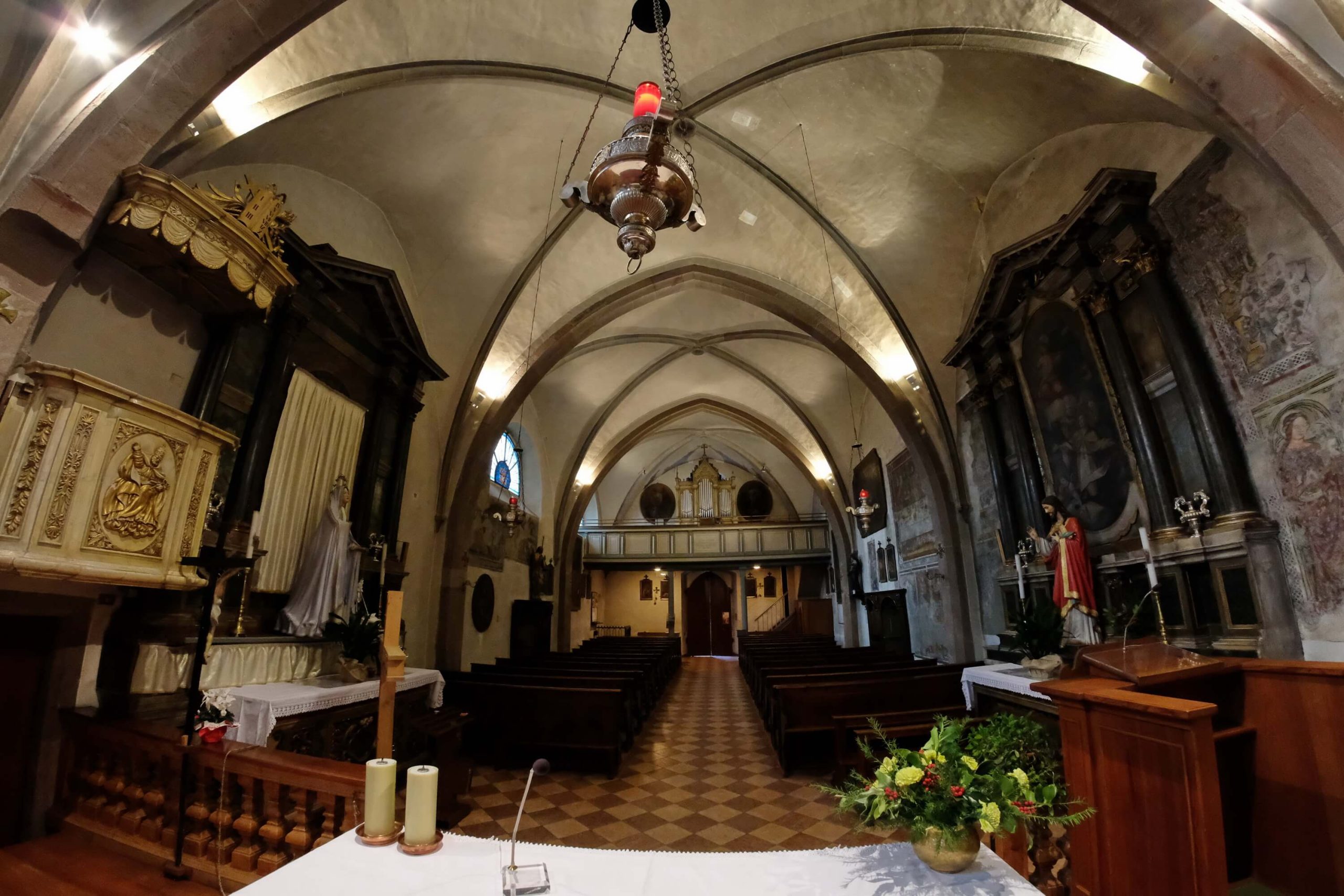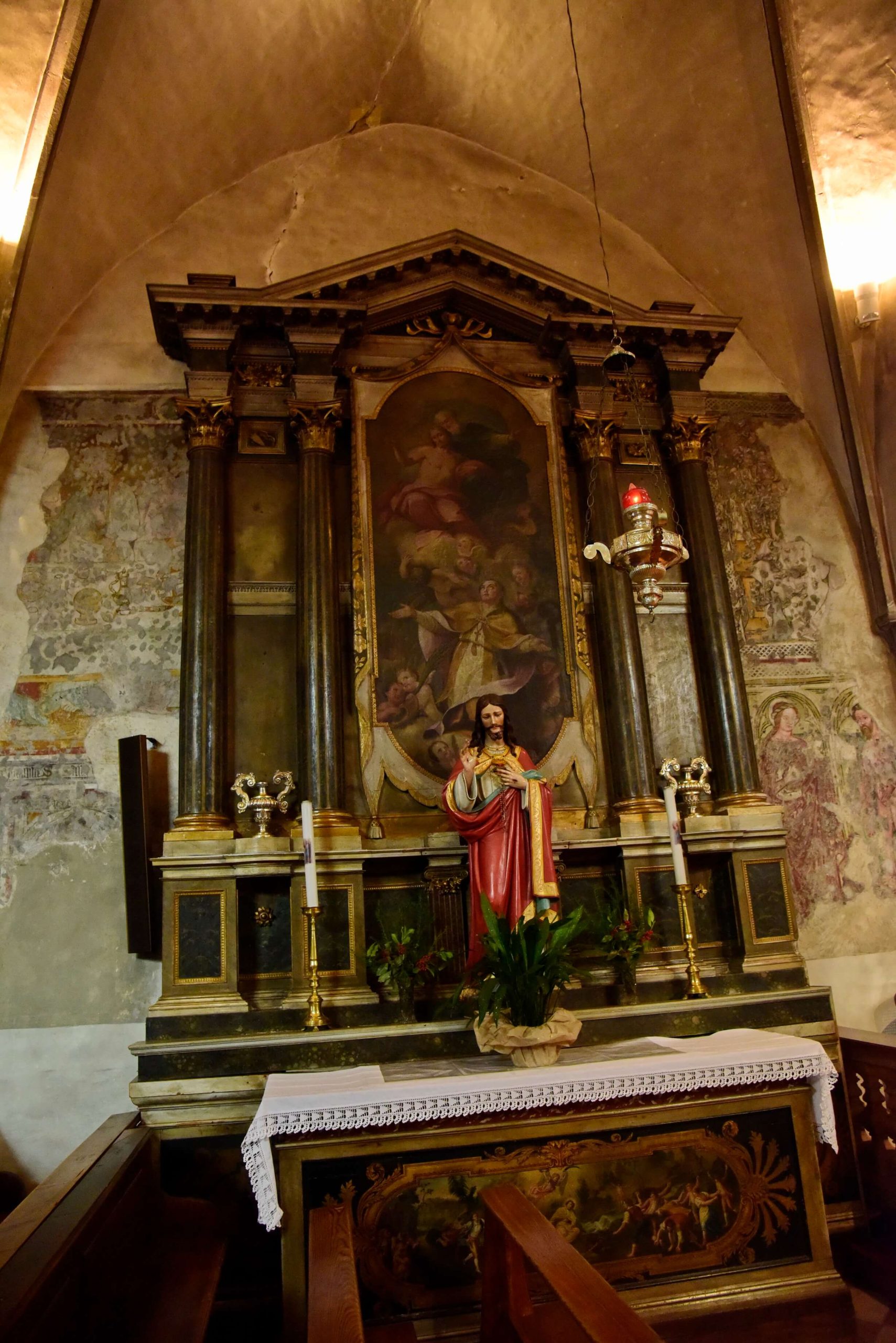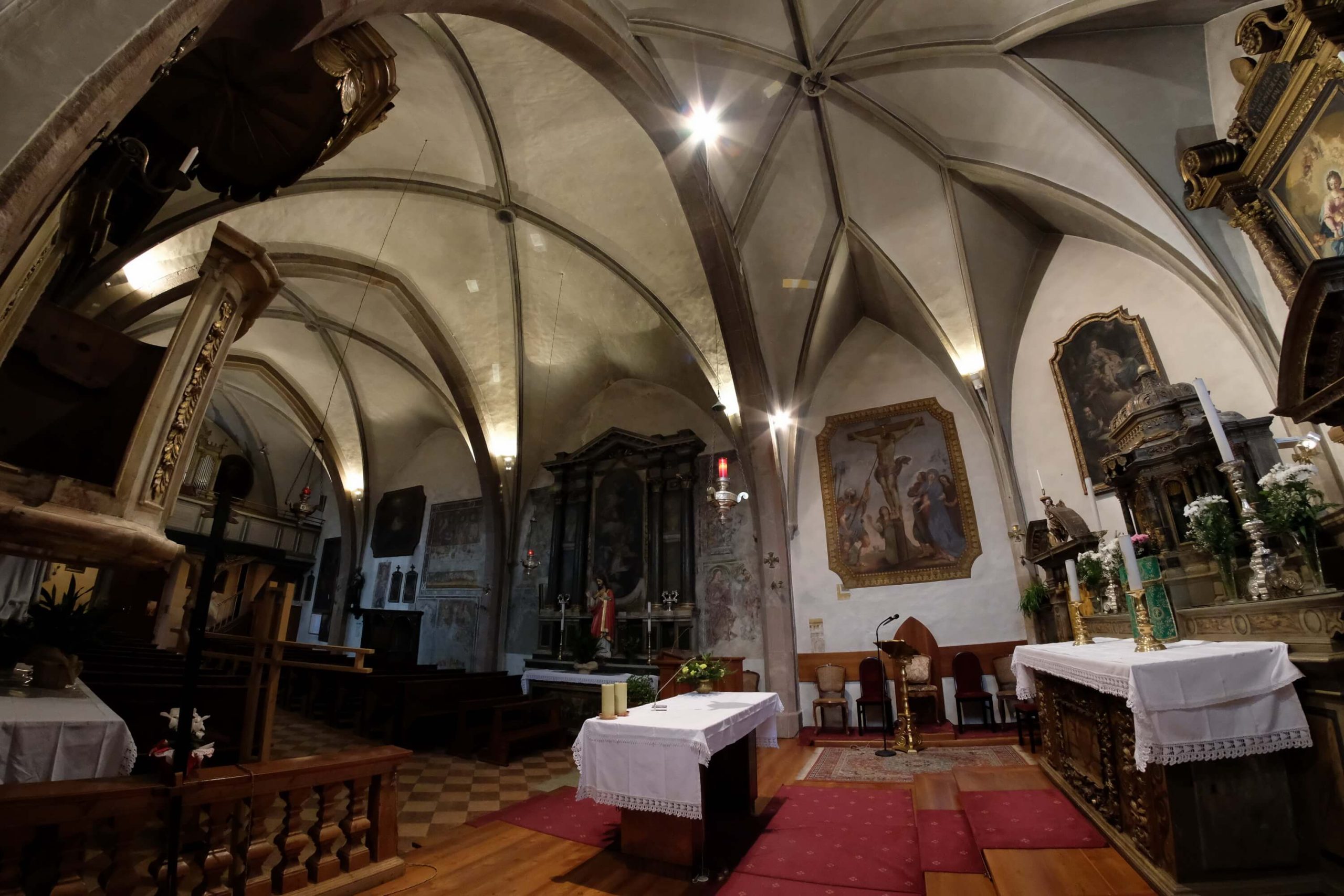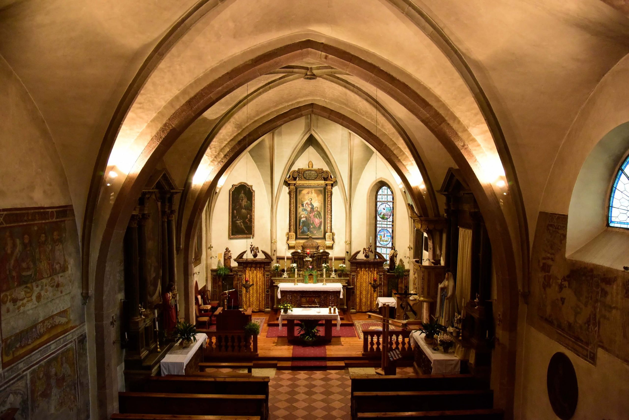 Le campate sono separate da archi a sesto acuto in conci di porfido bocciardato, smussato ed impostato senza soluzione di continuità sui piedritti formando così delle volte a crociera. Un altro motivo visibile dell’ampliamento della chiesa e dei rimaneggiamenti subiti nei secoli sono i lacerti dipinti ad affresco, che nella seconda e terza campata stanno ad evidenziare l’impostazione dell’aula come unico ambiante affrescato, interrotto dal ritto dell’arco di volta presumibilmente introdotto nel 1528; sul lato sinistro, oltre ad altri elementi decorativi di tipo votivo come S.Martino o S.Michele, anche se interrotta è chiaramente visibile la rappresentazione dell’Ultima Cena.