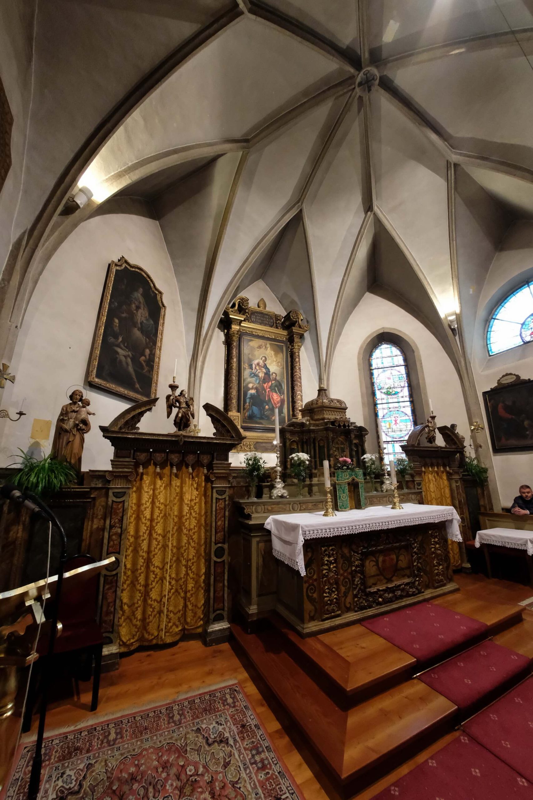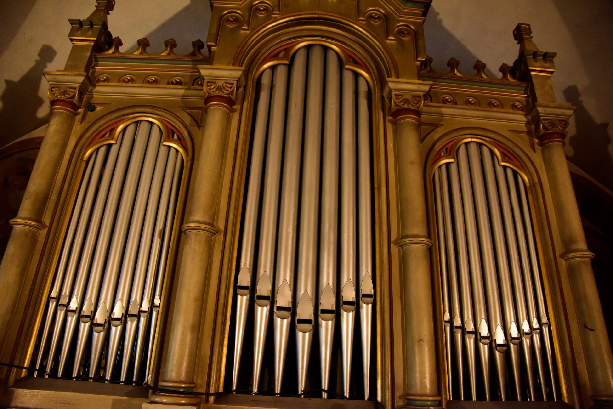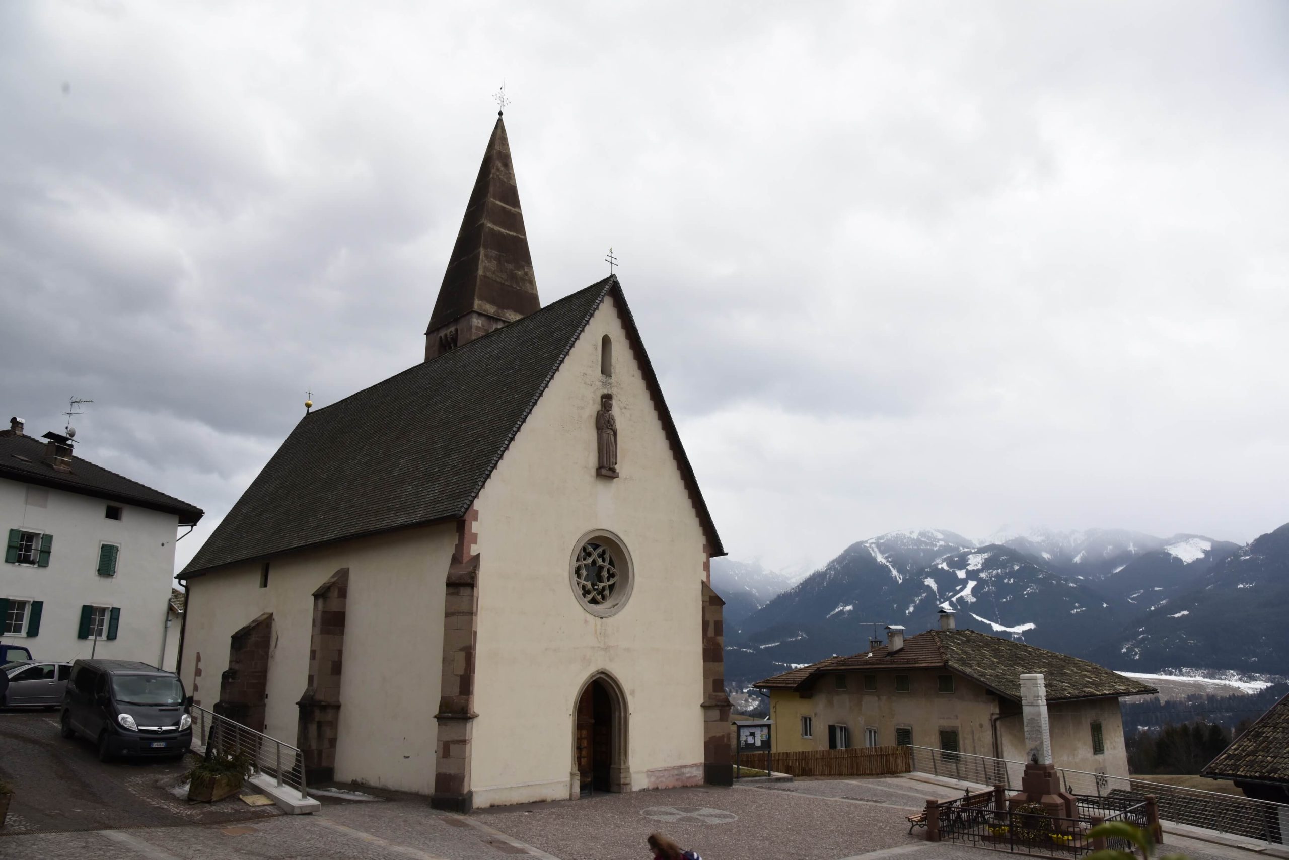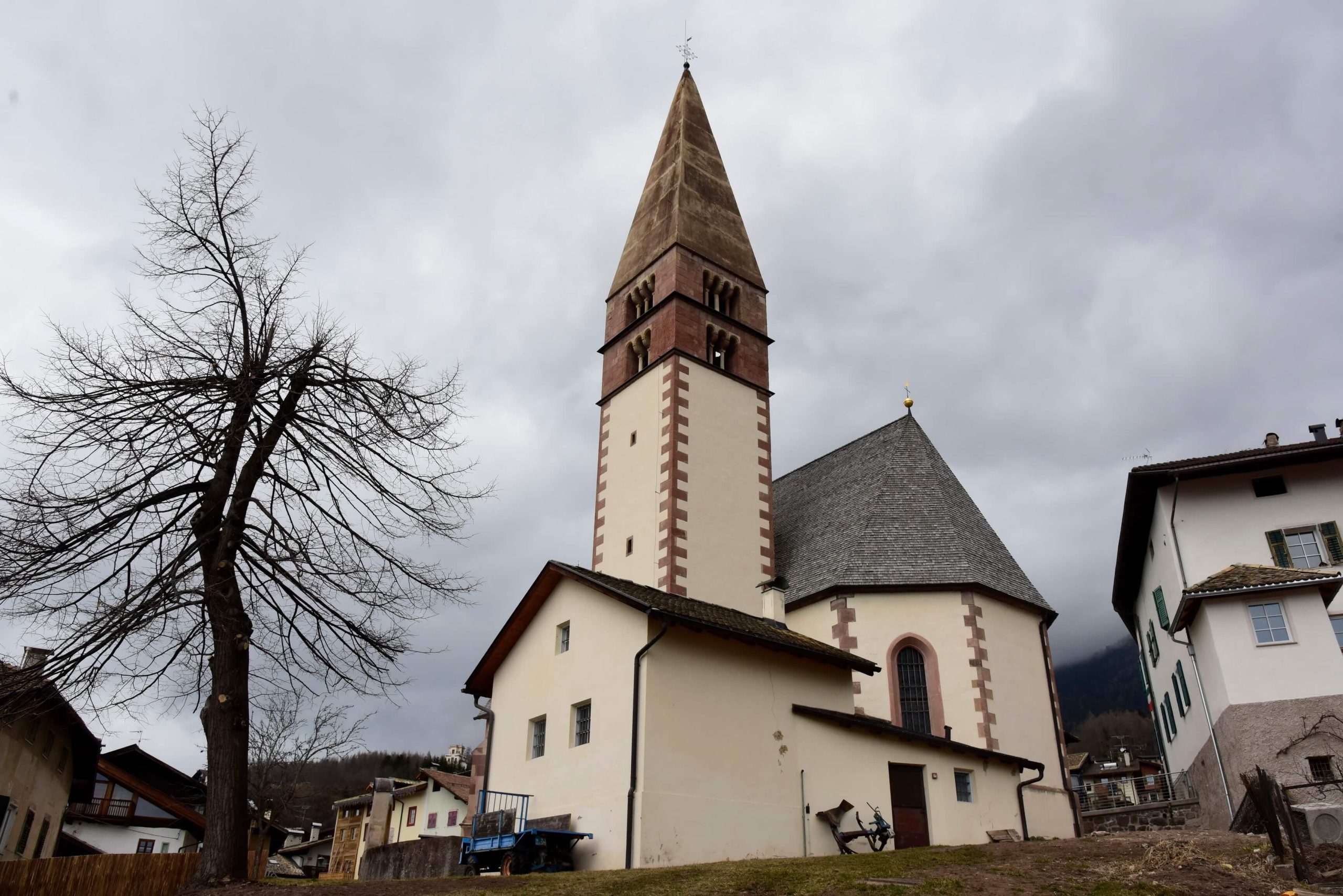 Le campate sono separate da archi a sesto acuto in conci di porfido bocciardato, smussato ed impostato senza soluzione di continuità sui piedritti formando così delle volte a crociera. Un altro motivo visibile dell’ampliamento della chiesa e dei rimaneggiamenti subiti nei secoli sono i lacerti dipinti ad affresco, che nella seconda e terza campata stanno ad evidenziare l’impostazione dell’aula come unico ambiante affrescato, interrotto dal ritto dell’arco di volta presumibilmente introdotto nel 1528; sul lato sinistro, oltre ad altri elementi decorativi di tipo votivo come S.Martino o S.Michele, anche se interrotta è chiaramente visibile la rappresentazione dell’Ultima Cena.
