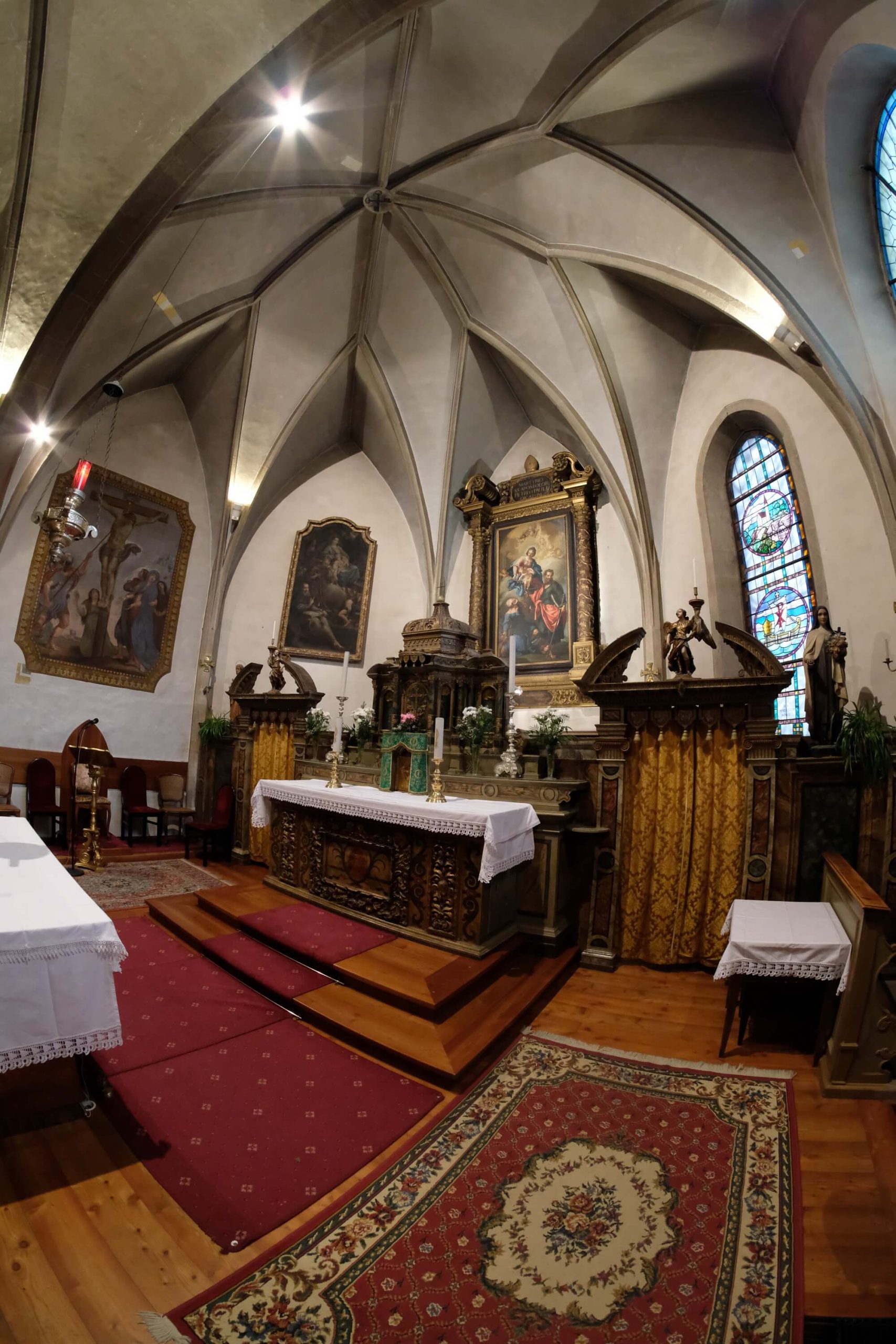 La parte absidale invece ha una copertura ad ombrello con vele impostate su lunette ogivali.