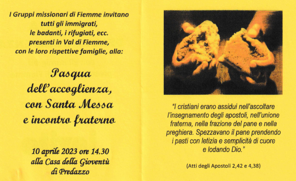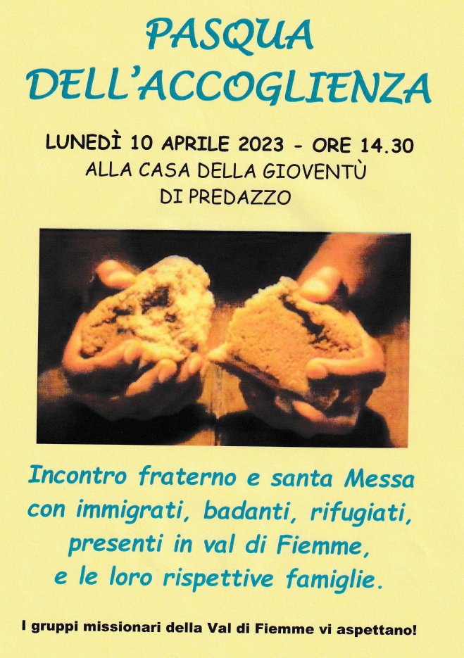 Lunedì 10 aprile, ad ore 14.30, presso la Casa della gioventù di Predazzo, i gruppi missionari della Val di Fiemme organizzano la PASQUA DELL’ACCOGLIENZA: incontro fraterno e celebrazione della Messa con immigrati, badanti, rifugiati, ecc. presenti nella nostra Valle. Chi conosce qualcuno di loro è gentilmente invitato a segnalargli questa opportunità!