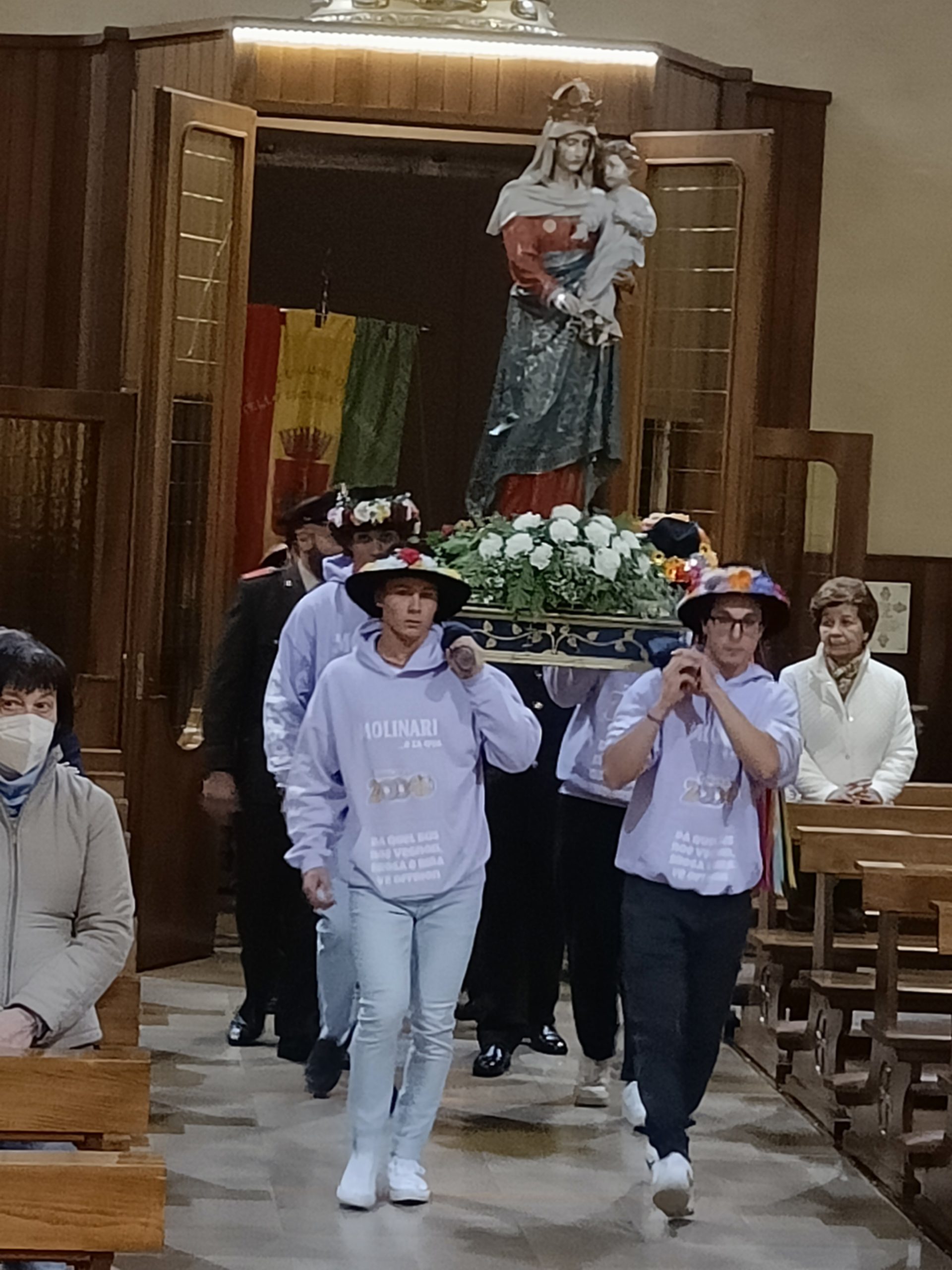 I coscritti del 2004, scortati da 4 Vigili del Fuoco in divisa d’ordinanza, hanno portato a spalla la statua della Madonna fino in piazza a Molina, dove è stato allestito un altare per un momento di preghiera, adorazione e benedizione. La processione è poi ritornata in chiesa seguendo lo stesso percorso dell’andata.
