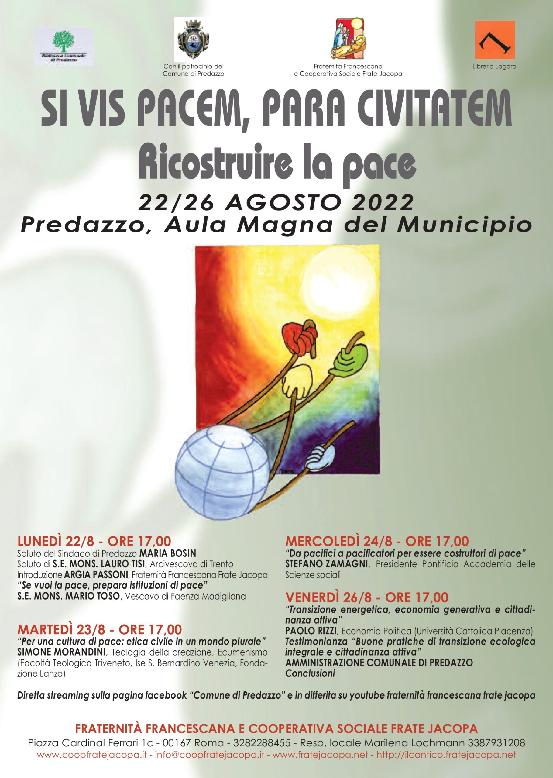 Aula Magna Municipio di Predazzo (22-26 agosto 2022) E Diretta streaming sulla pagina facebook “Comune di Predazzo” Fraternità Francescana e Cooperativa Sociale Frate Jacopa